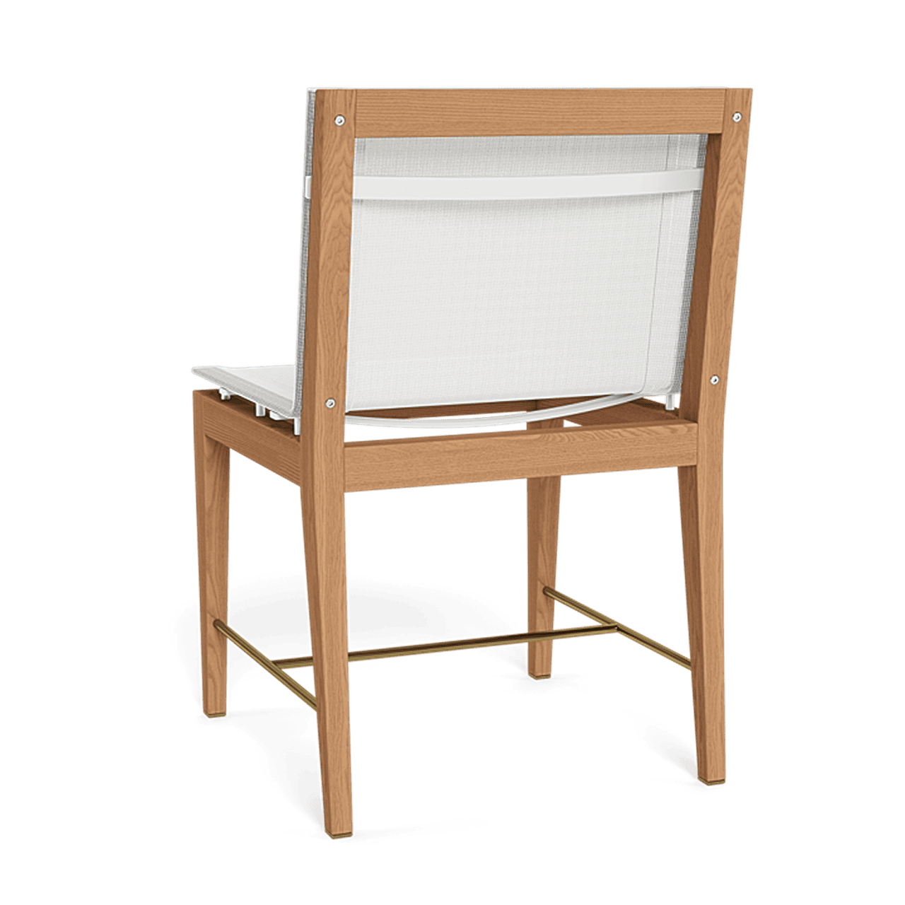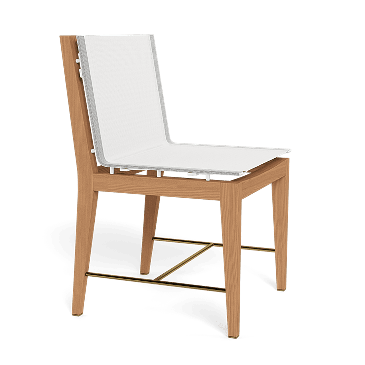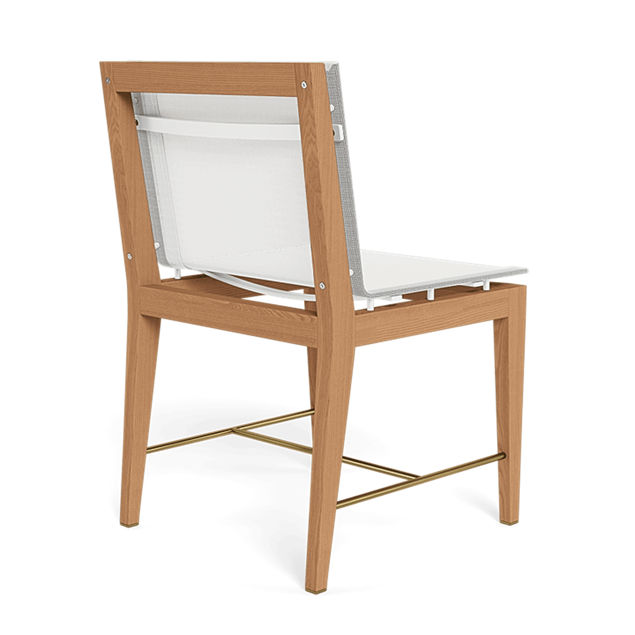 The chair frame is built from solid Indonesian teak that is sustainably sourced and handcrafted in the workshop. Teak is selected for its inherent resistance to moisture, cracking, and decay, making it appropriate for year-round outdoor use. Brass stretchers reinforce the legs and add structural support.