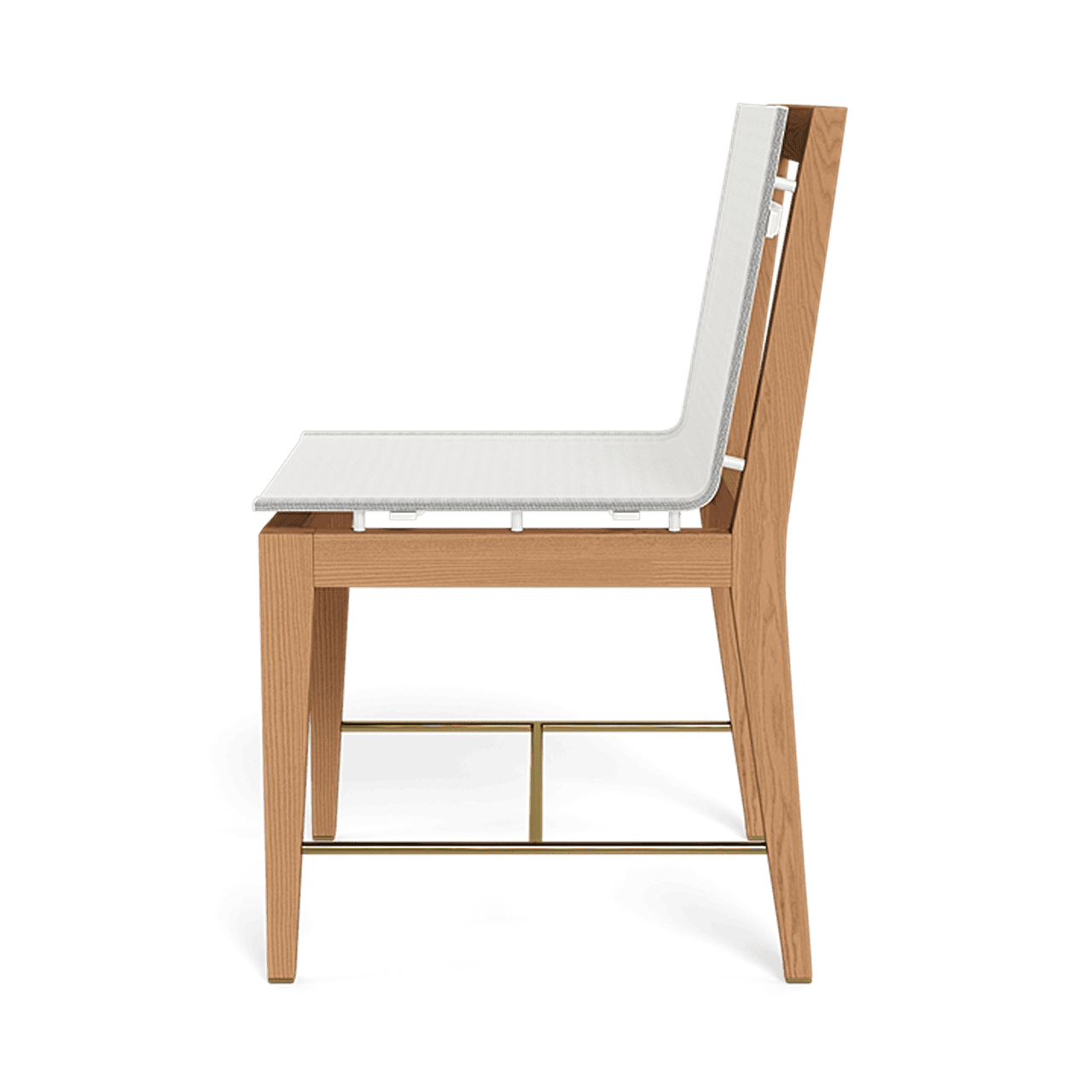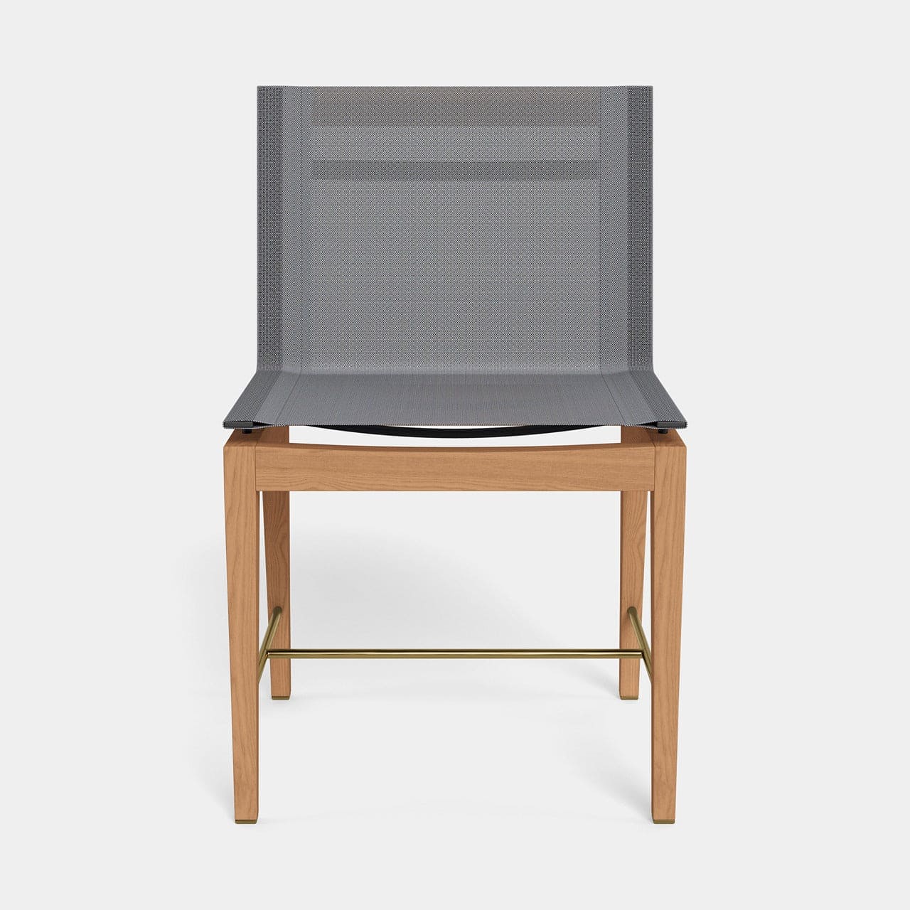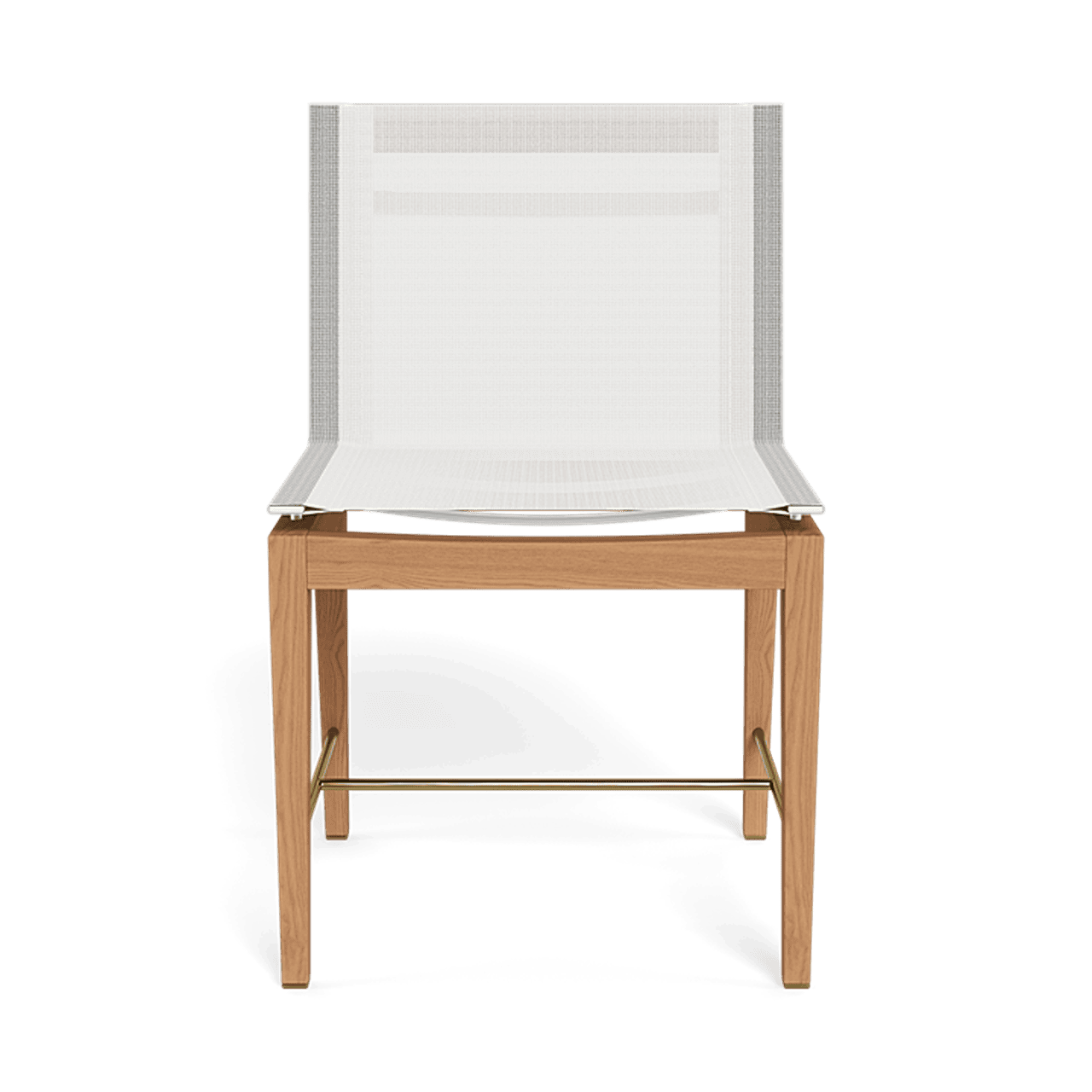 The chair frame is built from solid Indonesian teak that is sustainably sourced and handcrafted in the workshop. Teak is selected for its inherent resistance to moisture, cracking, and decay, making it appropriate for year-round outdoor use. Brass stretchers reinforce the legs and add structural support.