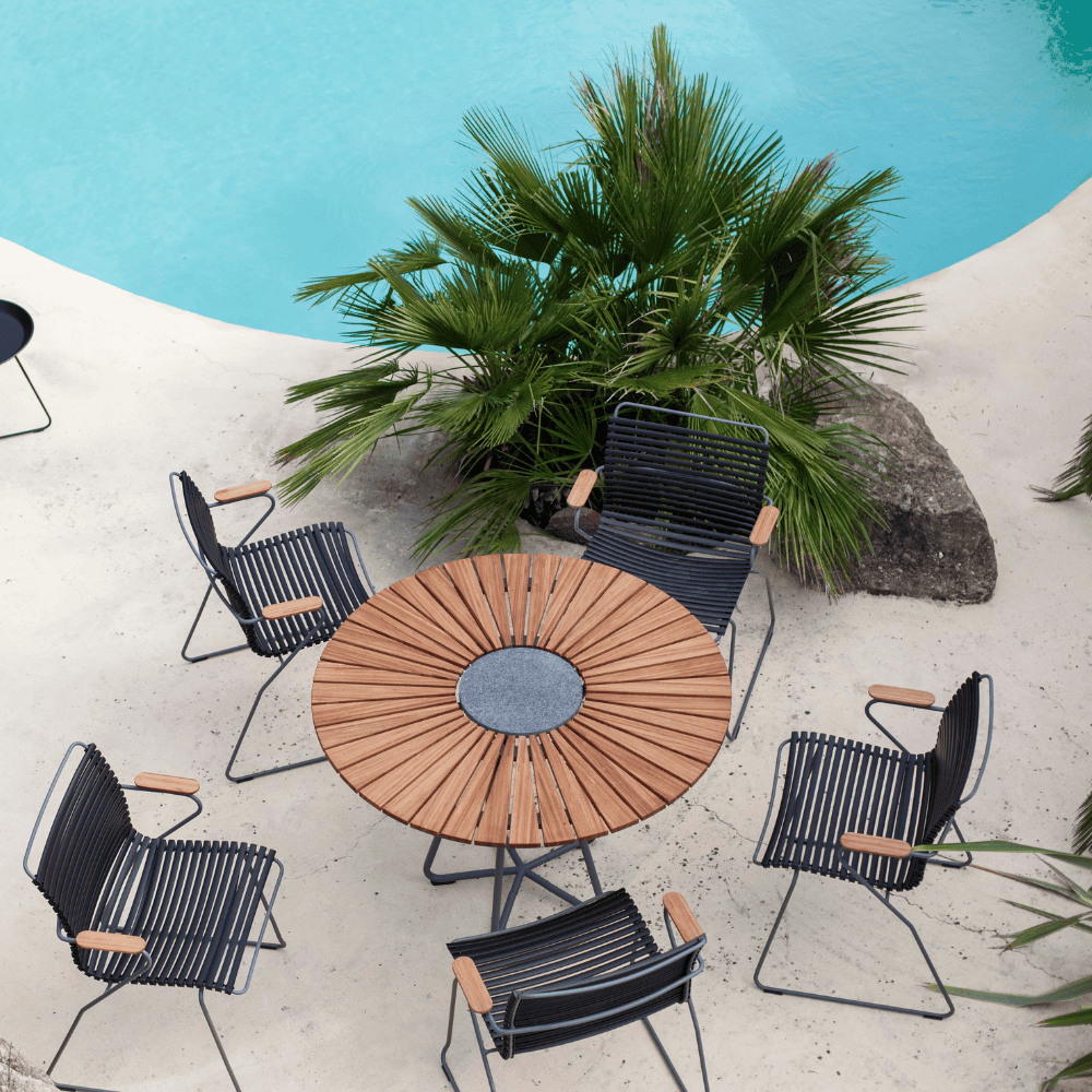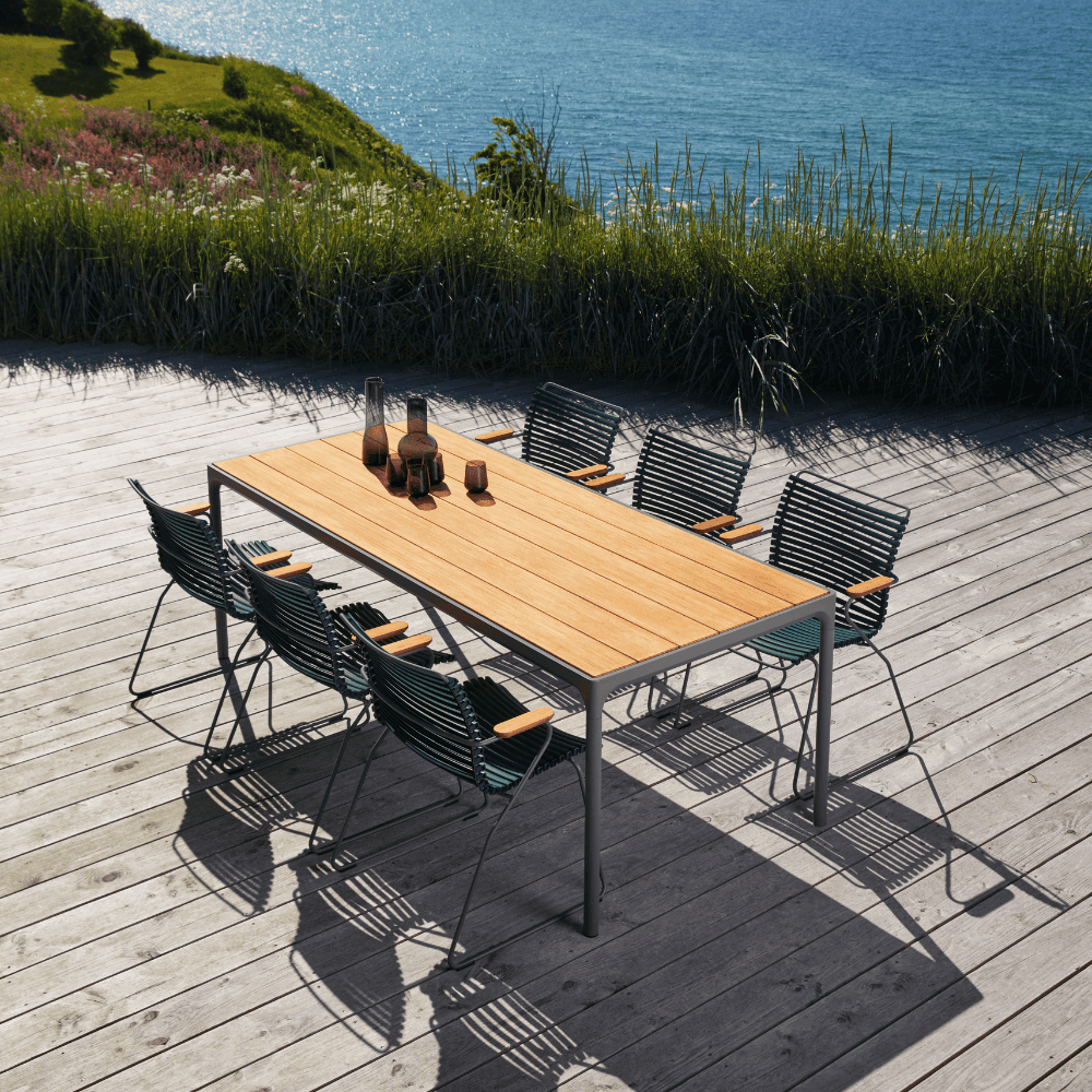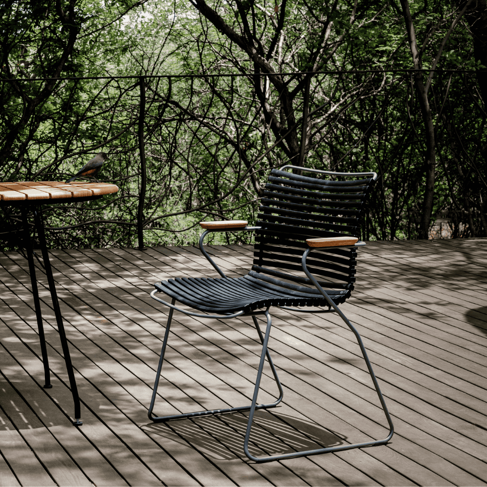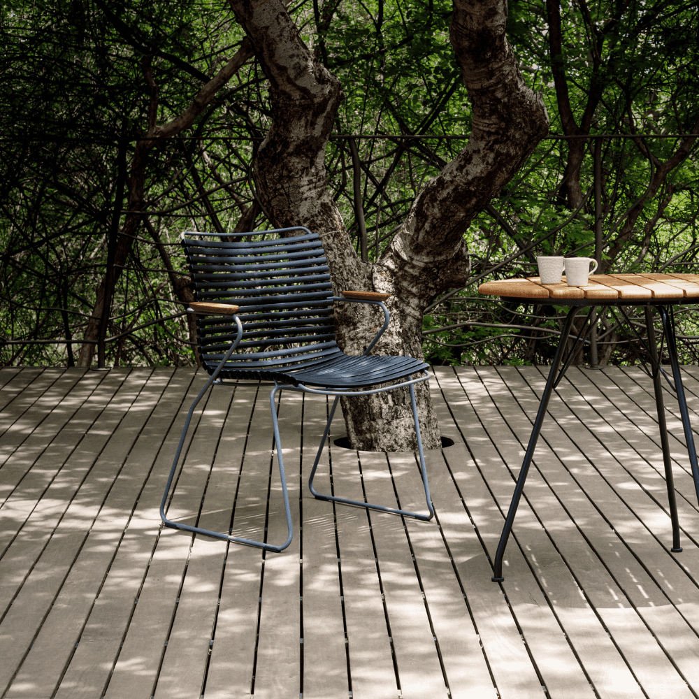 The CLICK Outdoor Dining Armchair with bamboo armrests features a unique yet simple design that’s thoughtfully ergonomic. It is beautiful in its repetition around any dining table. The seat and backrest are composed of evenly spaced, horizontal lamellas that curve subtly to follow the body’s natural posture. The armrests are gently curved and topped with bamboo slats. Its seat frame is made of Powder Coated Grey Metal.