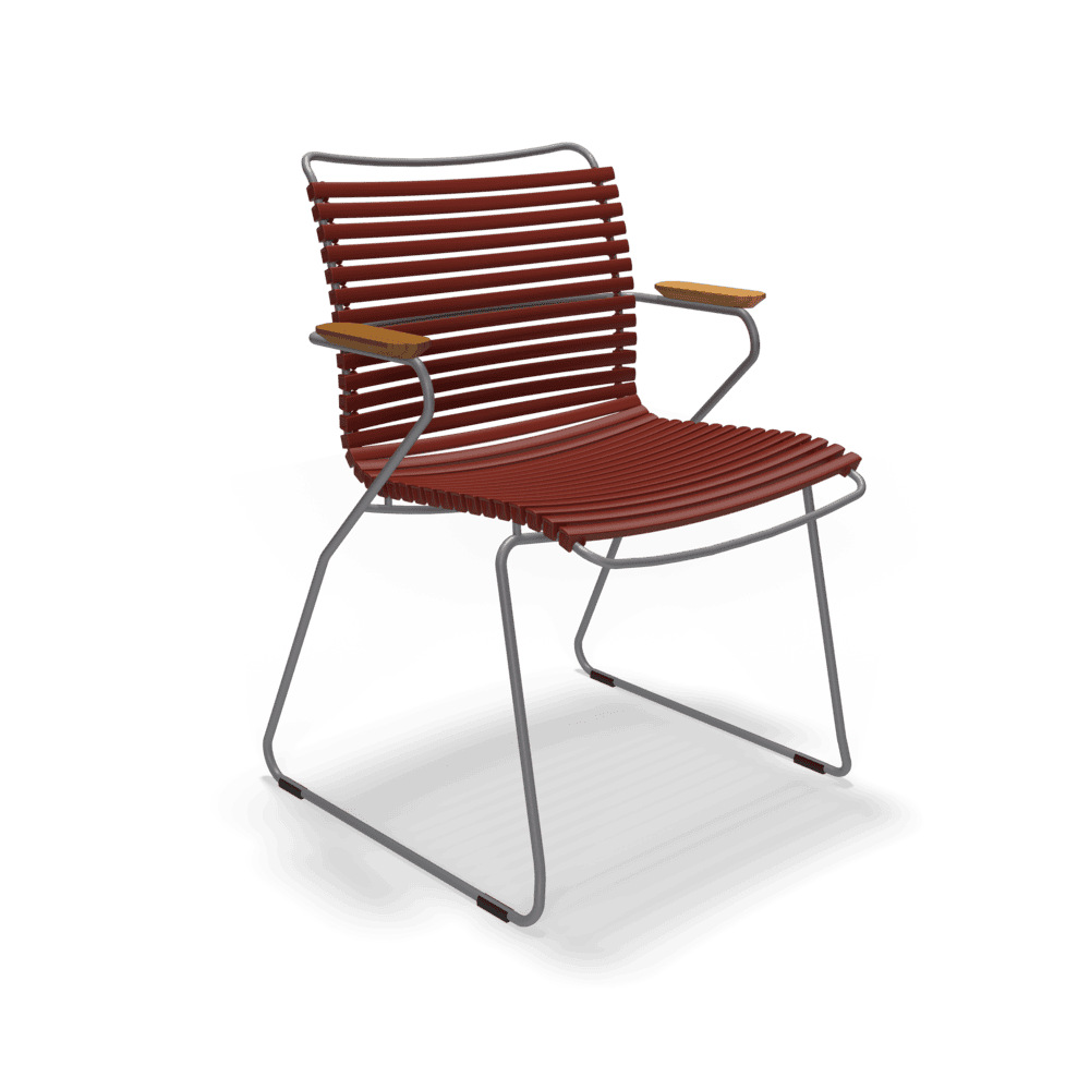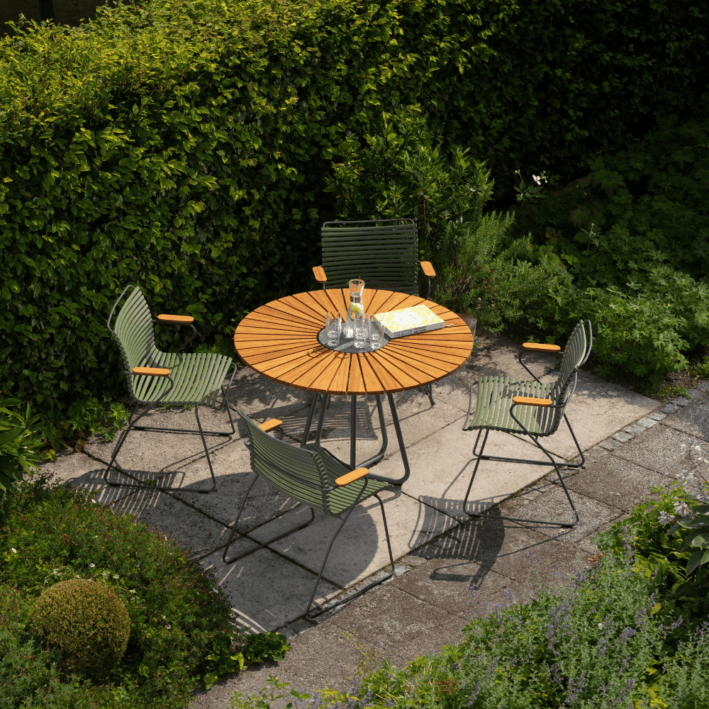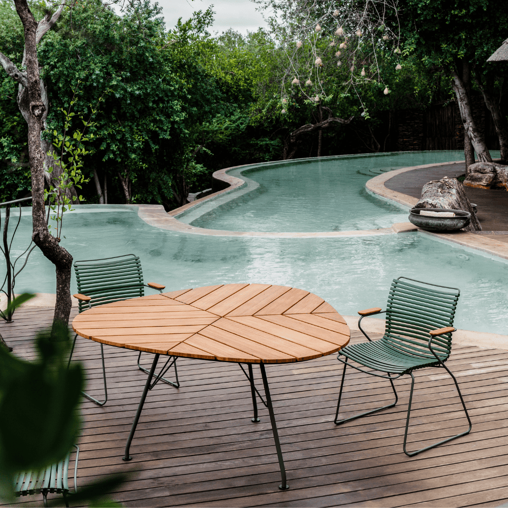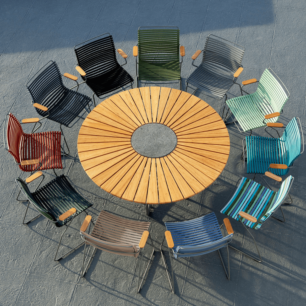 The CLICK Outdoor Dining Armchair with bamboo armrests features a unique yet simple design that’s thoughtfully ergonomic. It is beautiful in its repetition around any dining table. The seat and backrest are composed of evenly spaced, horizontal lamellas that curve subtly to follow the body’s natural posture. The armrests are gently curved and topped with bamboo slats. Its seat frame is made of Powder Coated Grey Metal.