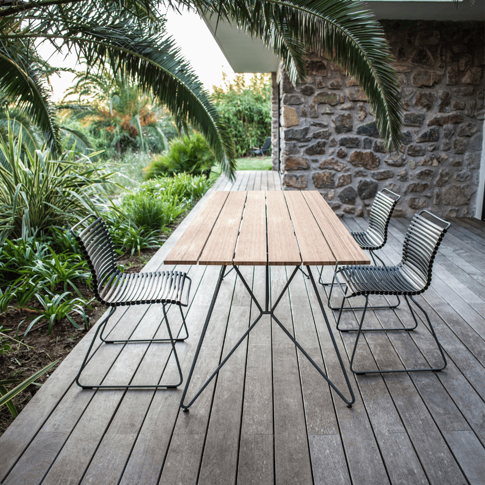 The CLICK Outdoor Dining Chair without Armrests features a unique yet simple design that’s thoughtfully ergonomic. It is beautiful in its repetition around any dining table. The seat and backrest are composed of evenly spaced, horizontal lamellas that curve subtly to follow the body’s natural posture. Its seat frame is made of Powder Coated Grey Metal.