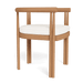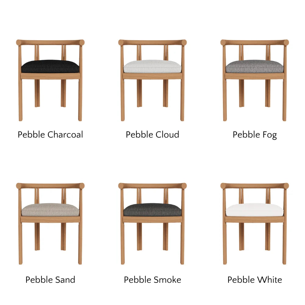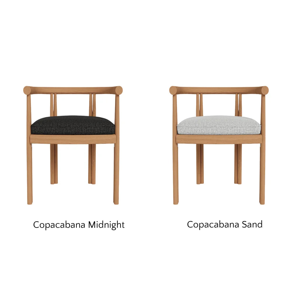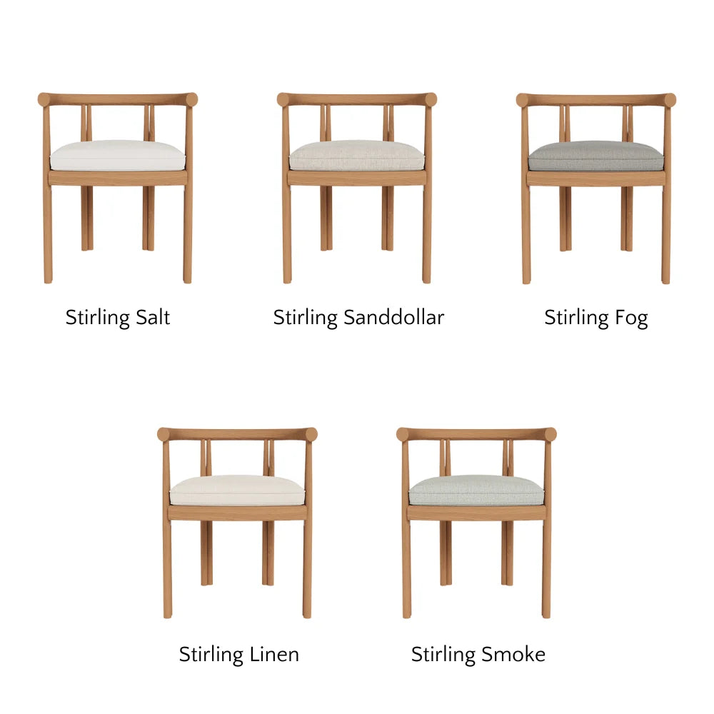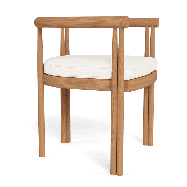 Influenced by modern Australian architecture and landscapes, our refined Cove collection features special details like double cylindrical legs and curved edges that create soft sculptural silhouettes. The Cove Dining Chair is contemporary comfort — featuring a refined solid teak frame in Natural with an architectural double leg detail and striking curved back. Enjoy a plush all–weather cushion in Copacabana Natural that invite sink–in comfort. Tracery and light with a footprint to match, this comfort–driven outdoor dining chair is a versatile design element for any space and effortlessly coordinates with the matching side chair. Pair it with any table to complete the outdoor dining set.