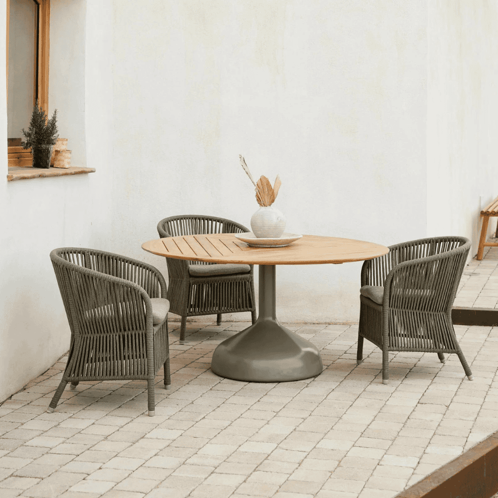 Introducing Glaze Outdoor Round Dining Table, an exquisite addition to your outdoor sanctuary. Crafted with modern elegance in mind, this round outdoor dining table offers versatility and style. Choose from three captivating tabletop options: a multicolored ceramic surface with intricate texture, a glazed stone top featuring mesmerizing circular patterns, or a warm teak finish. The table's base is meticulously designed, boasting a sleek silhouette crafted from aluminum with a sturdy steel core, ensuring both aesthetic appeal and stability for your outdoor gatherings.