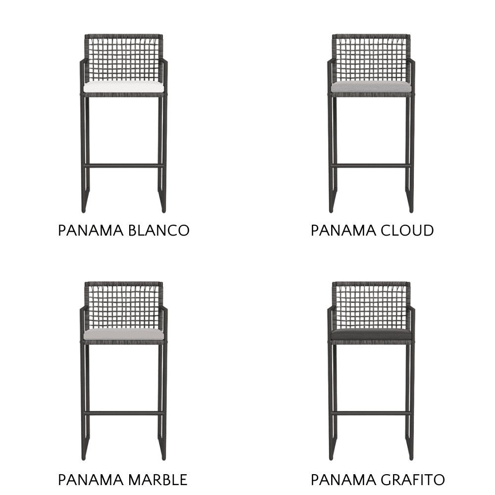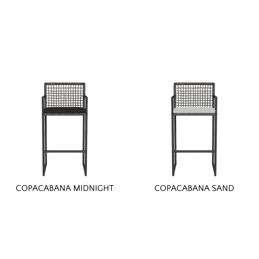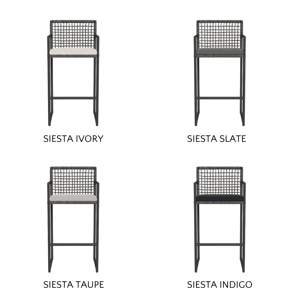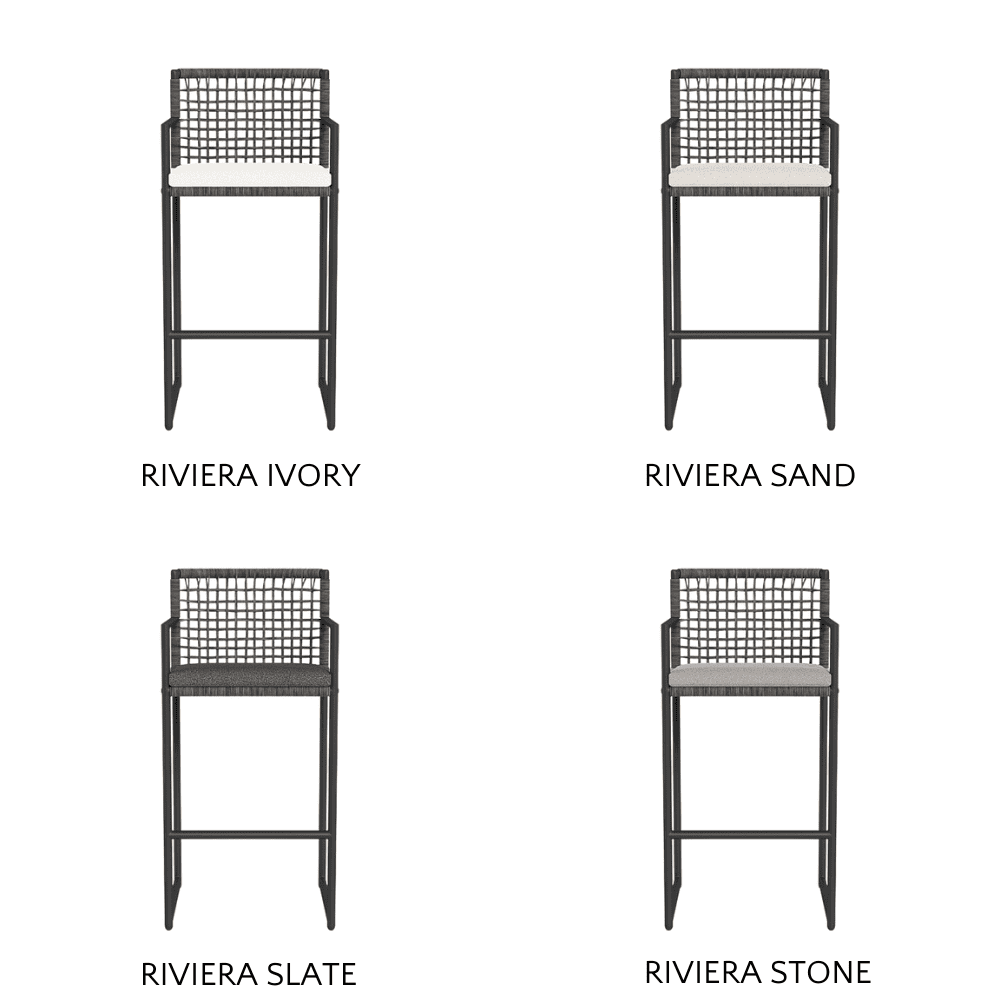 The Loop Outdoor Bar Stool's sturdy frame is crafted from powder-coated extruded aluminum, providing a sleek yet robust foundation that withstands outdoor conditions. The stool’s back and seat feature a meticulously woven open-grid wicker that offers both style and breathability, available in a variety of sophisticated fabrics such as Copacabana, Panama, Siesta, and Riviera.