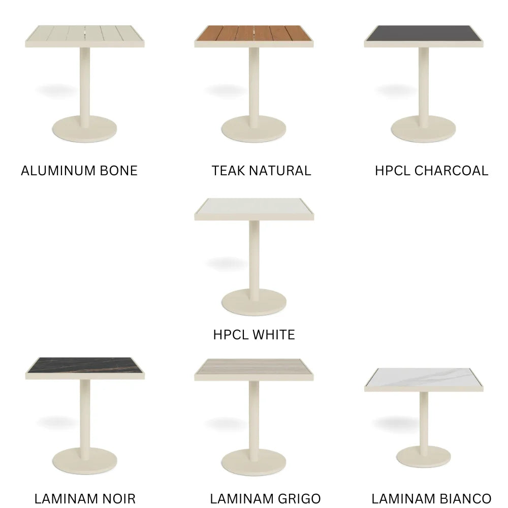 This simple and streamlined table collection is also customizable by finish, size and material. Our Vienna bistro collection was designed specifically for contract and hospitality settings, but doubles as a great table for any space with a smaller dining area. Choose an aluminum frame in any of our powder coated colors, and pair it with a top in Aluminum Slats, Natural Teak slats, solid HPCL (high-pressure laminate) or Laminam ceramic. Each top is universal to the same base. For a larger dining table, slide two matching square or rectangular tables together. Vienna is available in five size options: two square shapes, two round shapes and one rectangular shape. Pair it with any dining chair to complete your outdoor dining set.
