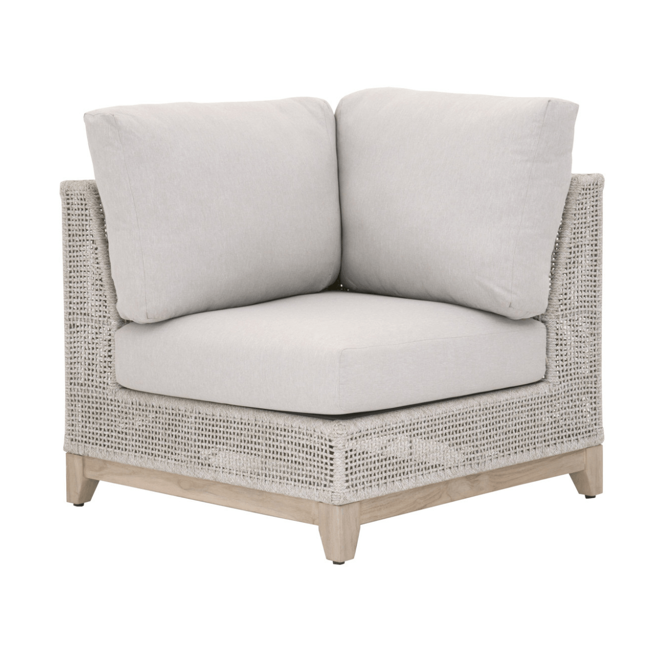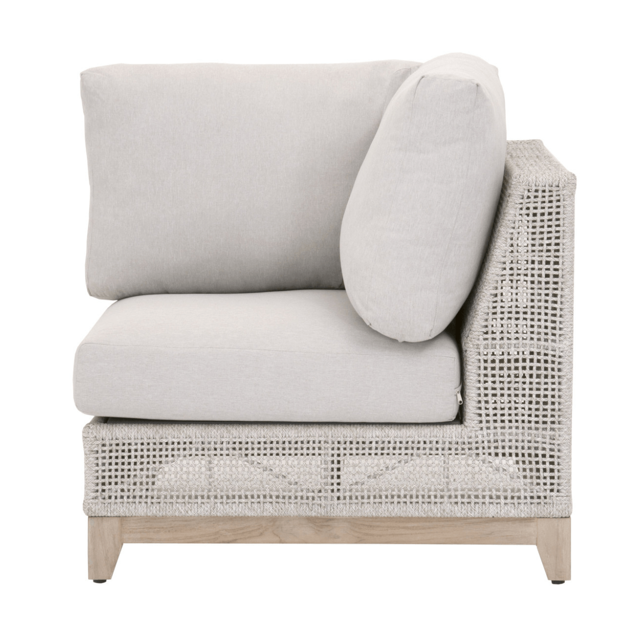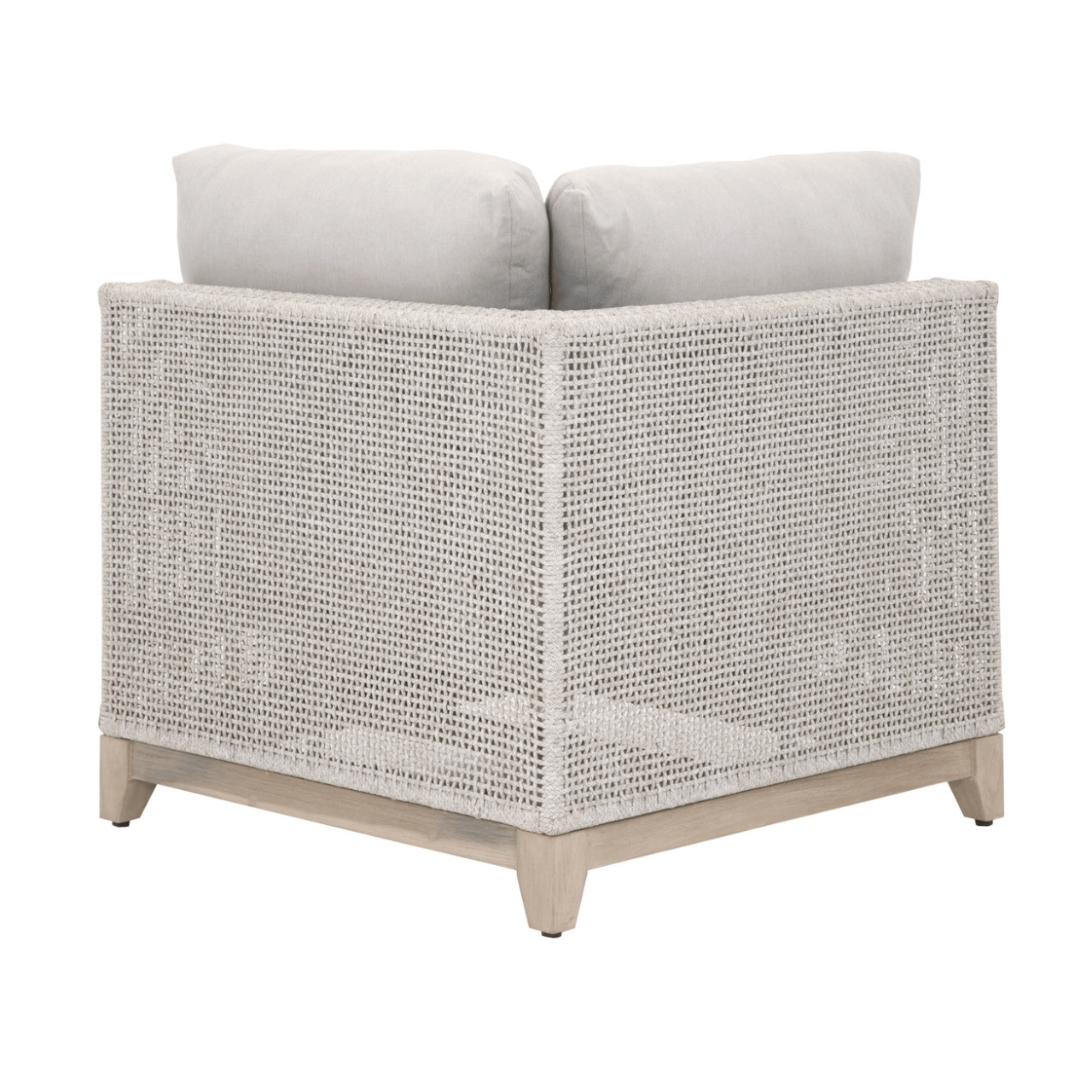 BOXHILL introduces the Woven Tropez Outdoor Modular Corner Sofa, a welcoming retreat for your guests to unwind. This versatile modular sofa features an intricate rope weave design and a sturdy teak wood base, making it suitable for both indoor and outdoor settings. Equipped with weather-resistant and comfortable removable cushions, this modular system offers durability and relaxation. Part of the Woven Collection, its "Gray Teak'' finish undergoes a natural aging process, evolving to a charming silver tone over time, accompanied by unique marks and cracks, adding character to your outdoor sectional patio furniture arrangement and redefining outdoor sofas and sectionals with its timeless allure.