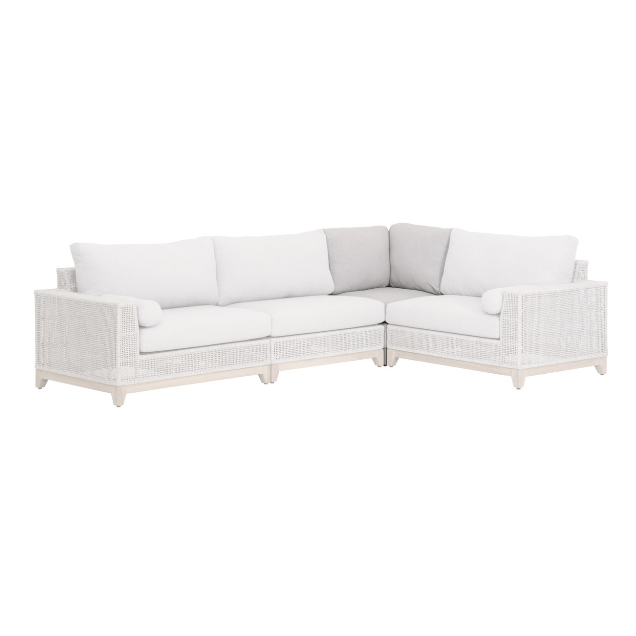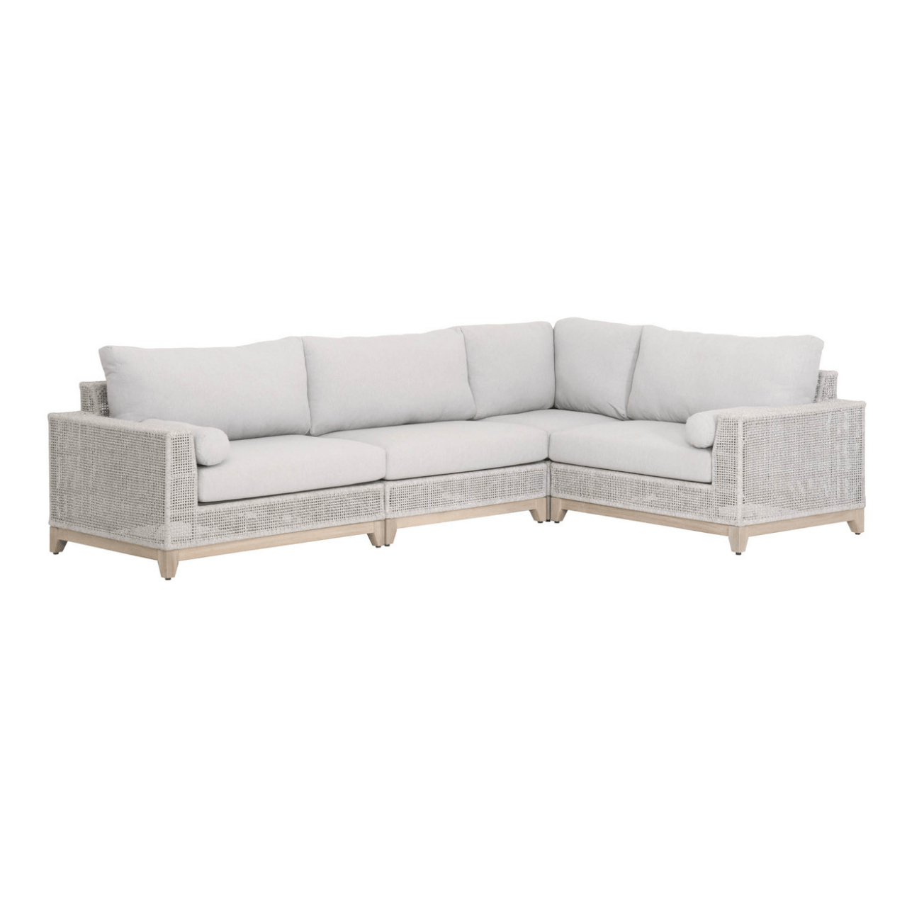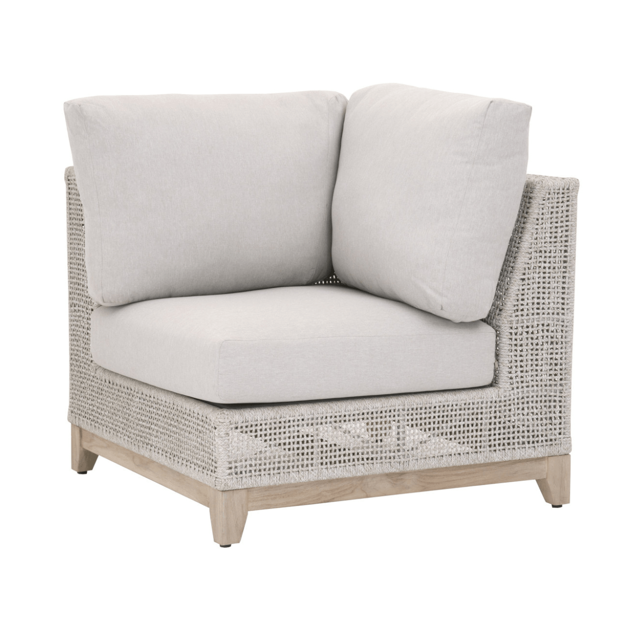 BOXHILL introduces the Woven Tropez Outdoor Modular Corner Sofa, a welcoming retreat for your guests to unwind. This versatile modular sofa features an intricate rope weave design and a sturdy teak wood base, making it suitable for both indoor and outdoor settings. Equipped with weather-resistant and comfortable removable cushions, this modular system offers durability and relaxation. Part of the Woven Collection, its "Gray Teak'' finish undergoes a natural aging process, evolving to a charming silver tone over time, accompanied by unique marks and cracks, adding character to your outdoor sectional patio furniture arrangement and redefining outdoor sofas and sectionals with its timeless allure.