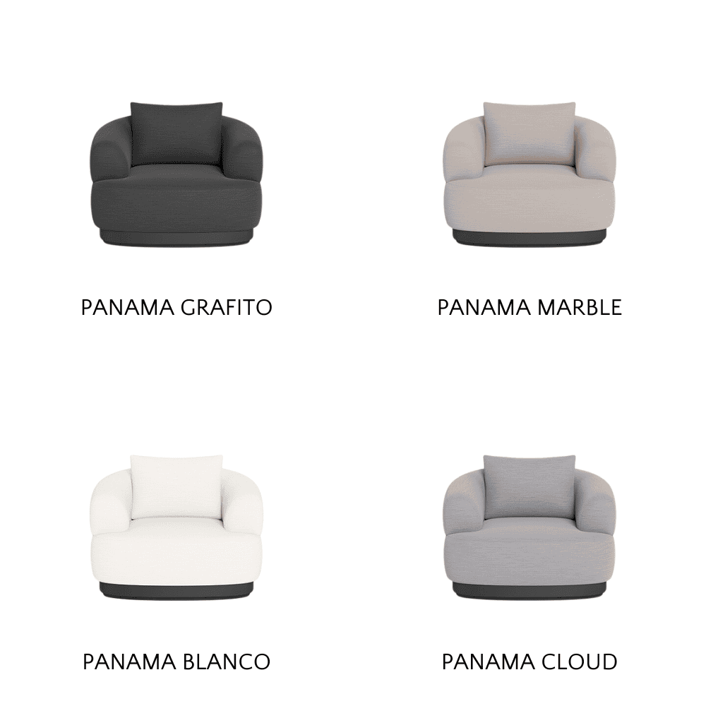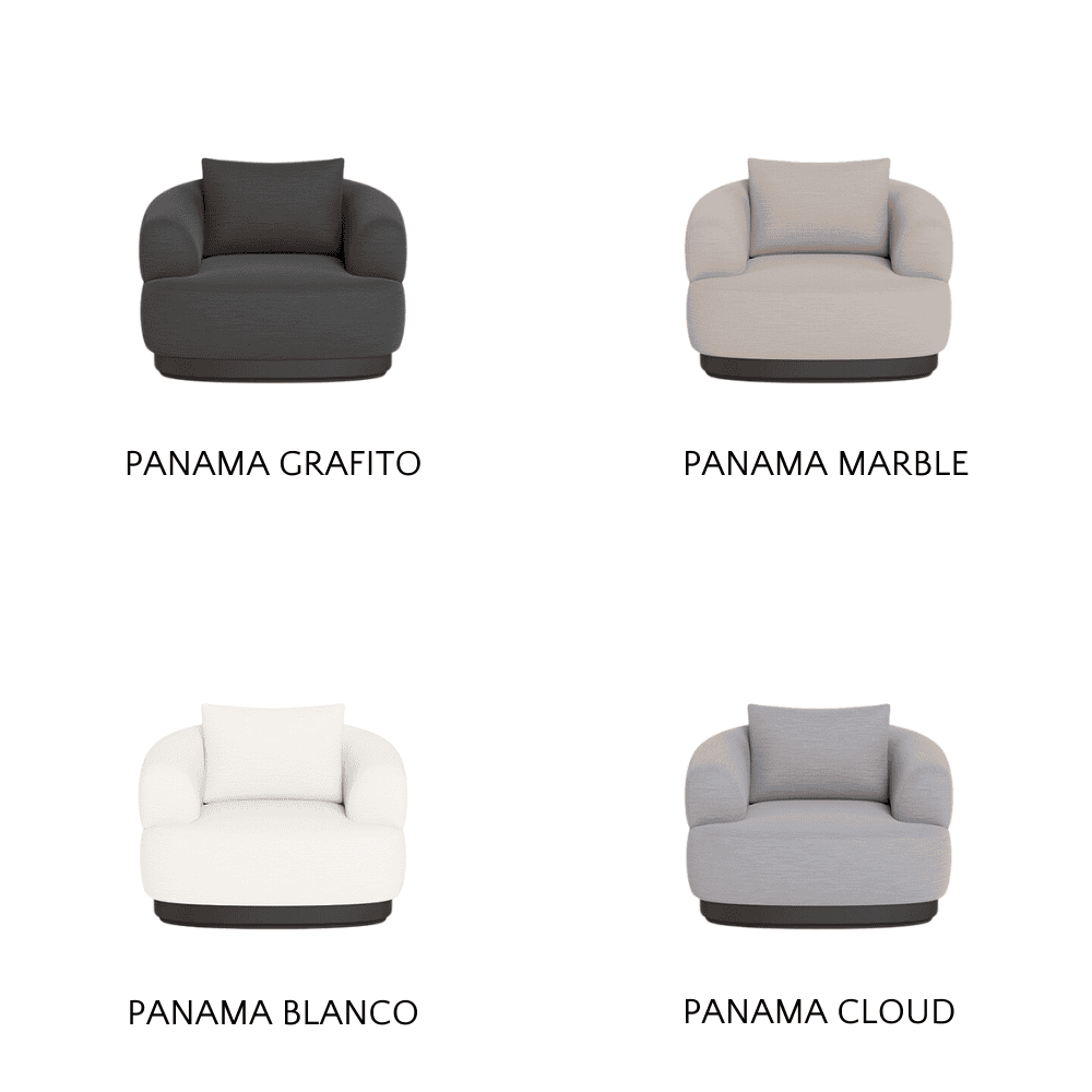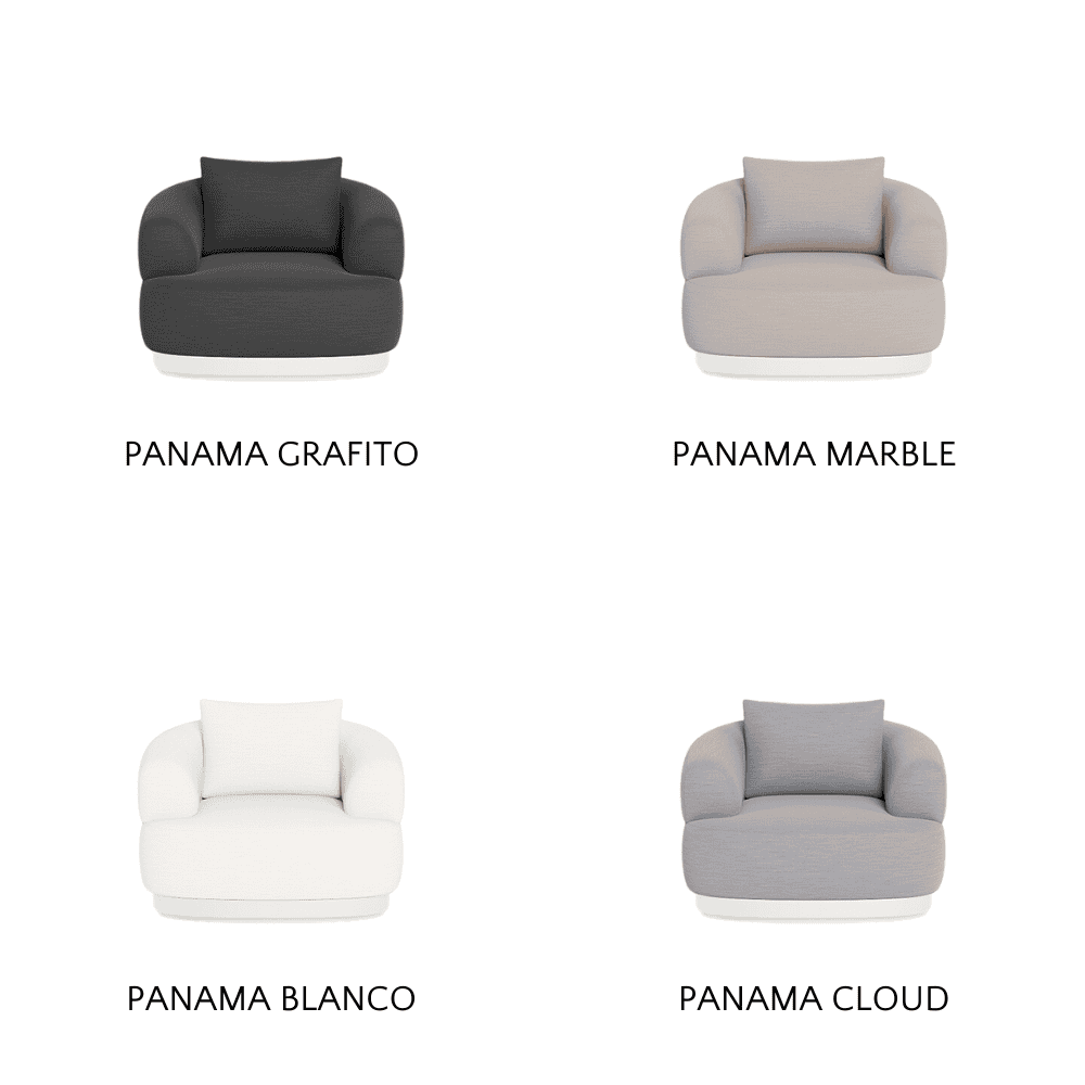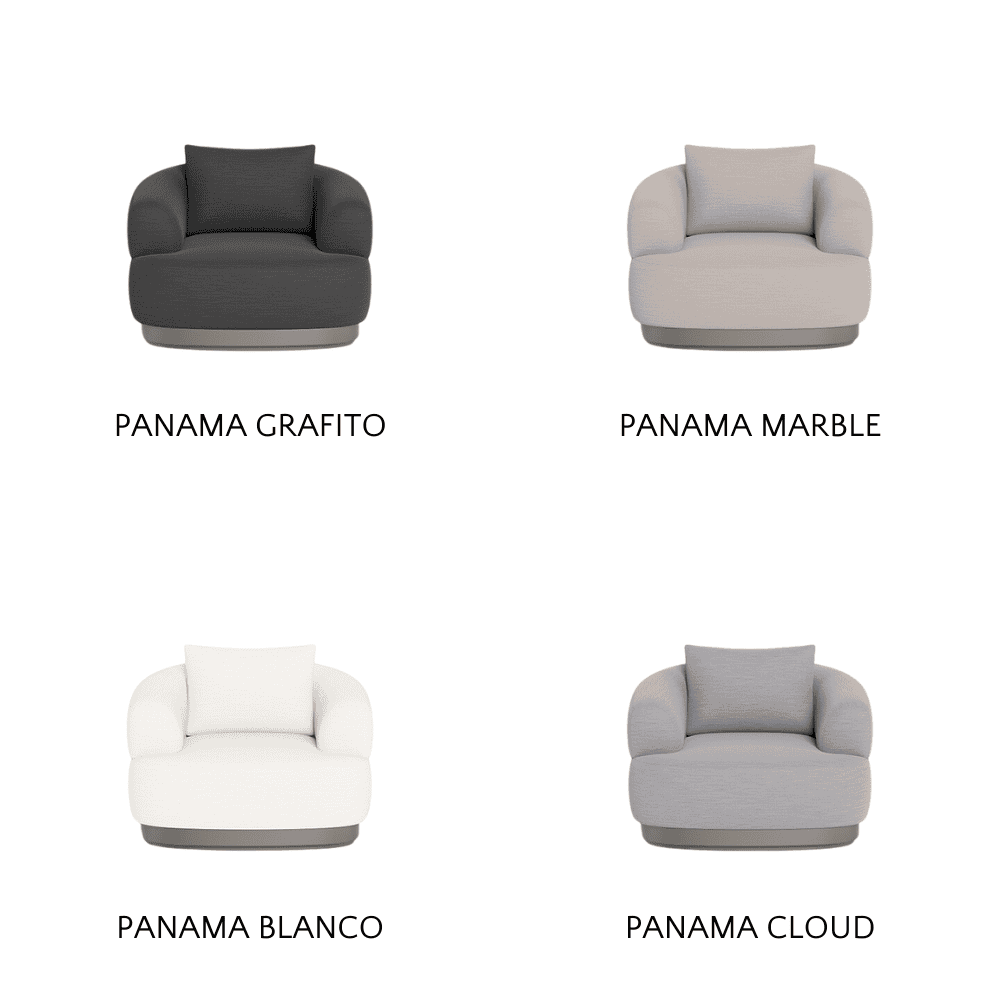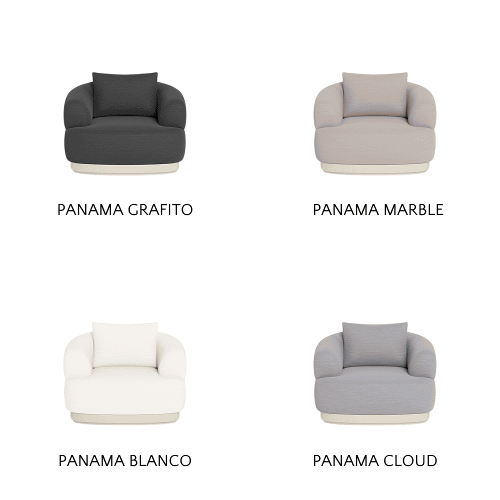 The upholstery is crafted from premium Italian outdoor fabrics—Copacabana, Panama, Siesta, and Riviera—each offering a soft hand, textured character, and timeless neutral palette. These materials are designed to withstand sun exposure, moisture, and everyday outdoor conditions, while still delivering the elevated feel of indoor textiles.