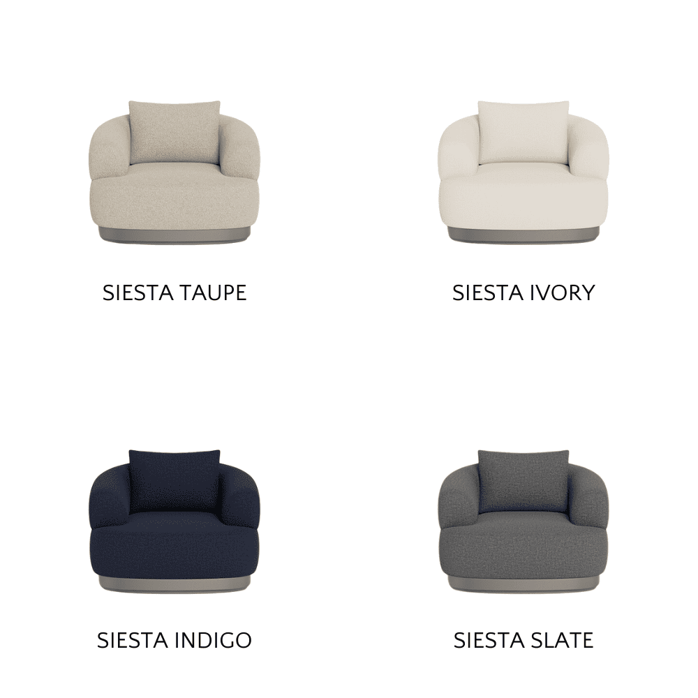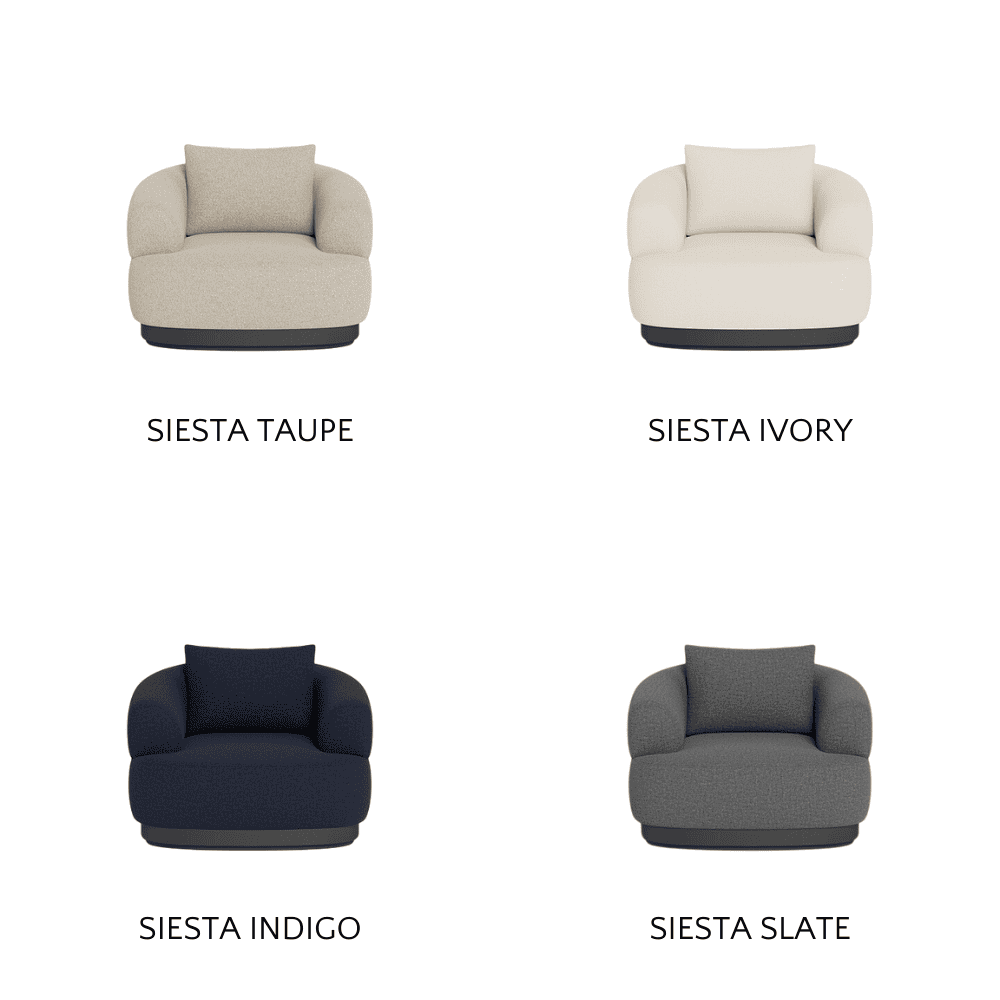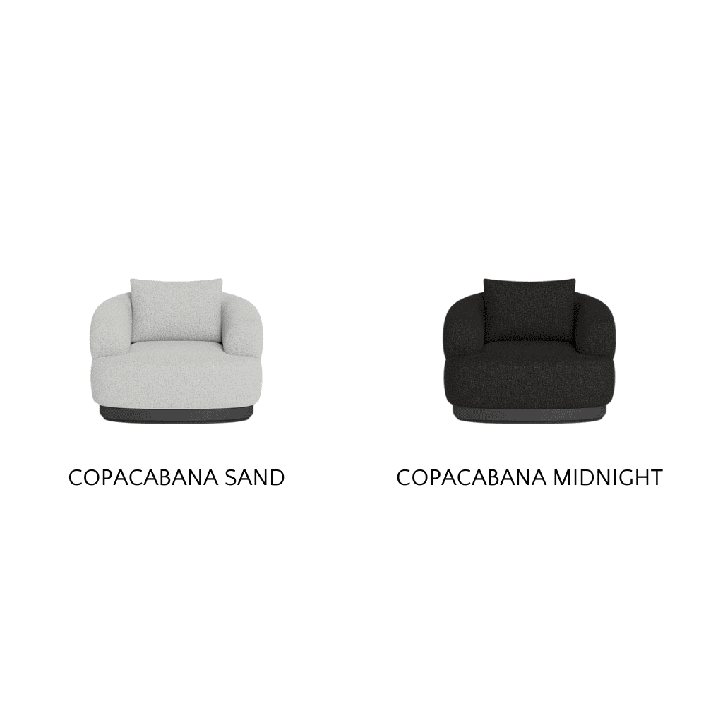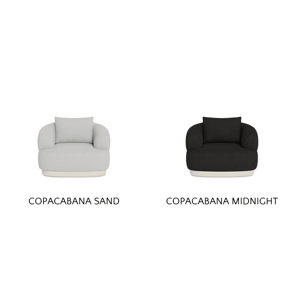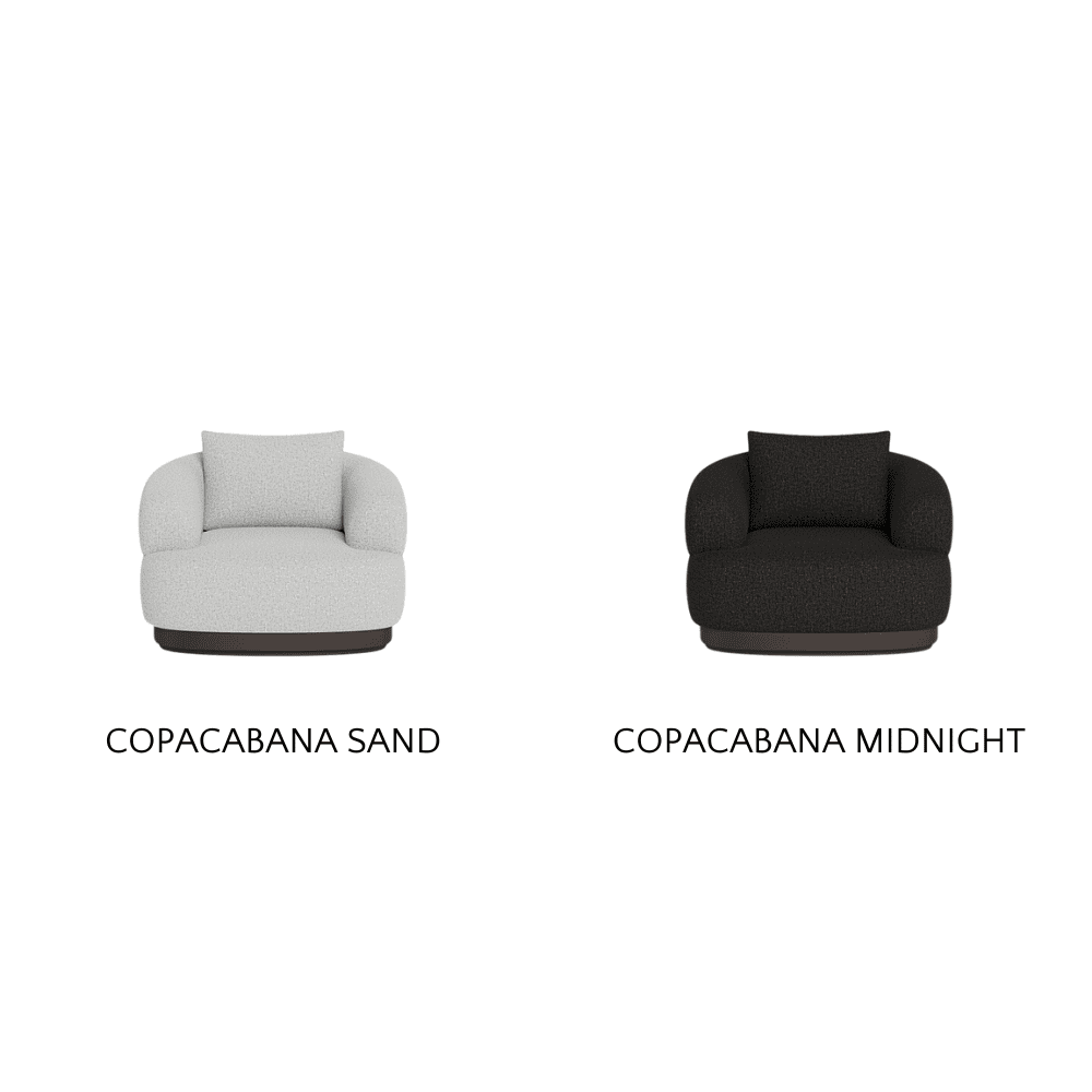 The upholstery is crafted from premium Italian outdoor fabrics—Copacabana, Panama, Siesta, and Riviera—each offering a soft hand, textured character, and timeless neutral palette. These materials are designed to withstand sun exposure, moisture, and everyday outdoor conditions, while still delivering the elevated feel of indoor textiles.