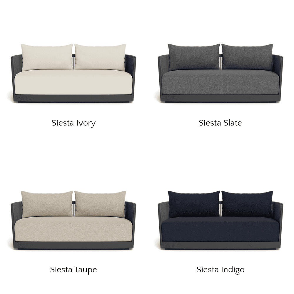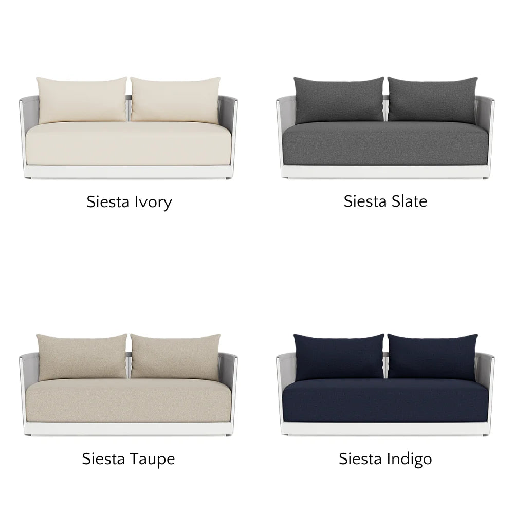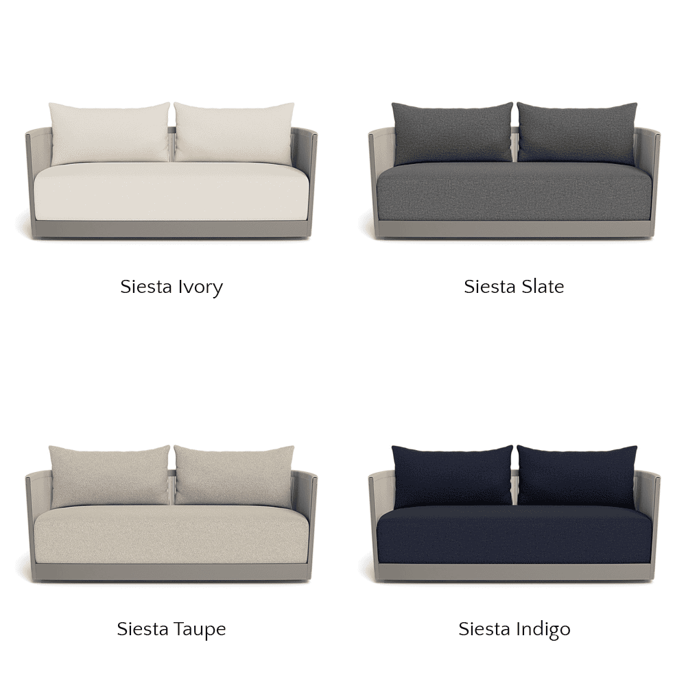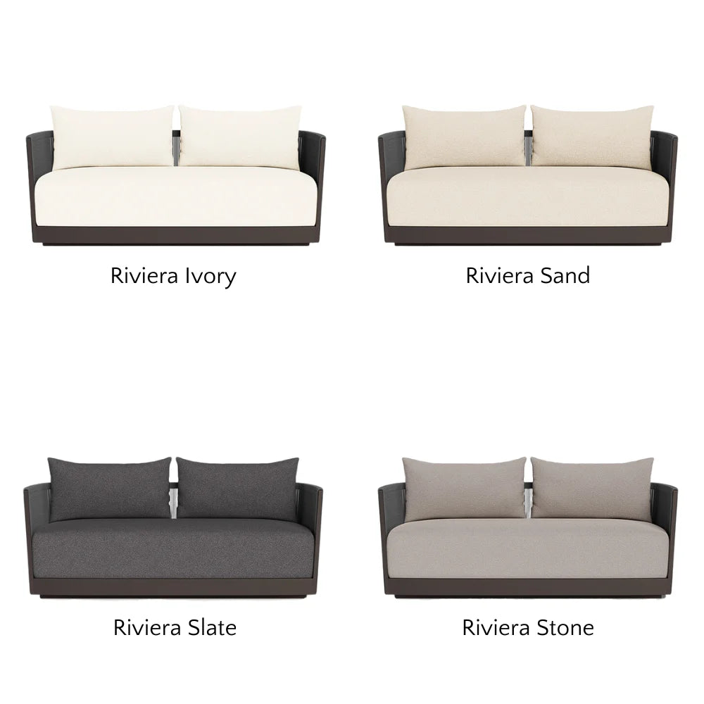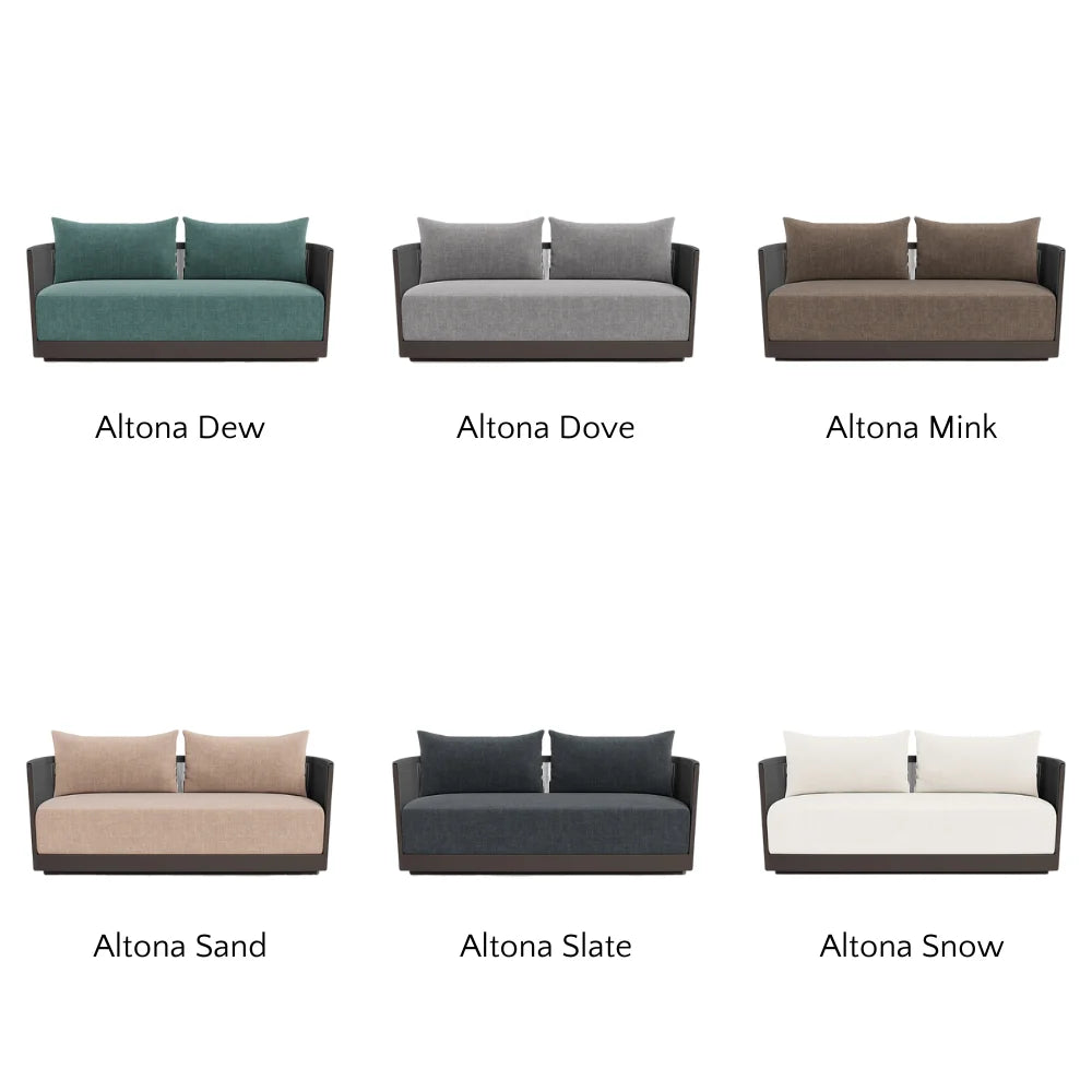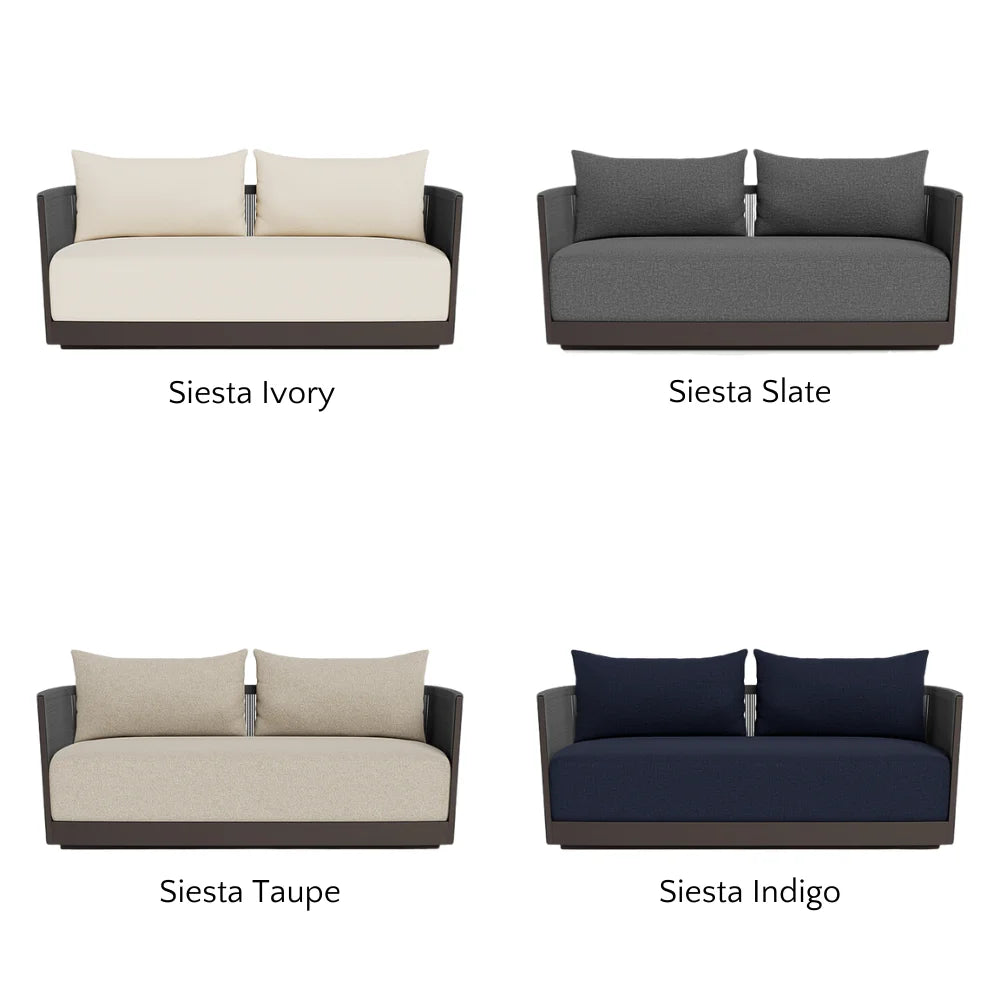 Antigua Outdoor 2 Seat Sofa features a generously sized bench cushion accompanied by two knife-edge back cushions, offering a comfortable seating experience for outdoor lounging or socializing. This outdoor loveseat features a graceful curves and low-profile plinth base providing a clean, modern silhouette that complements any outdoor space and a wide range of outdoor lounge furniture styles.