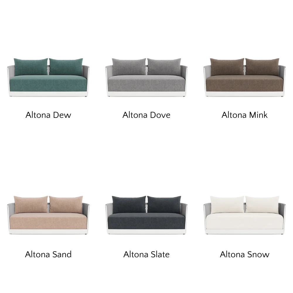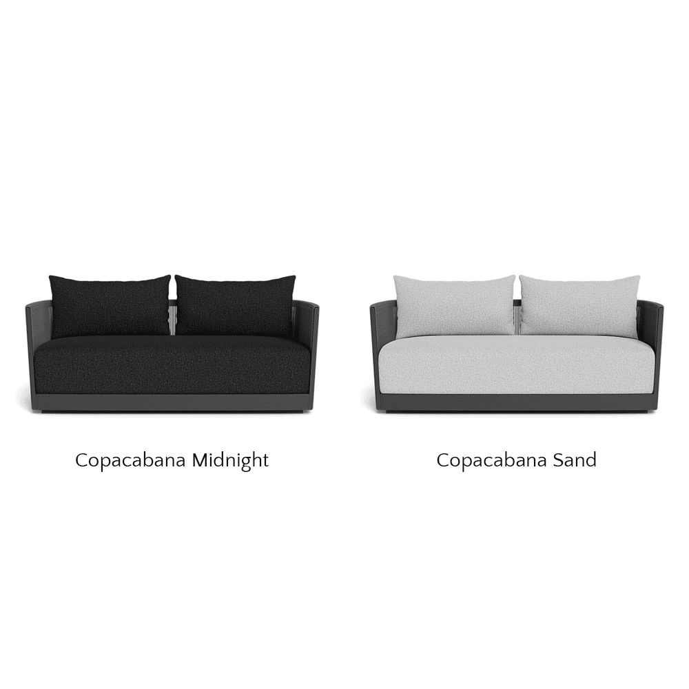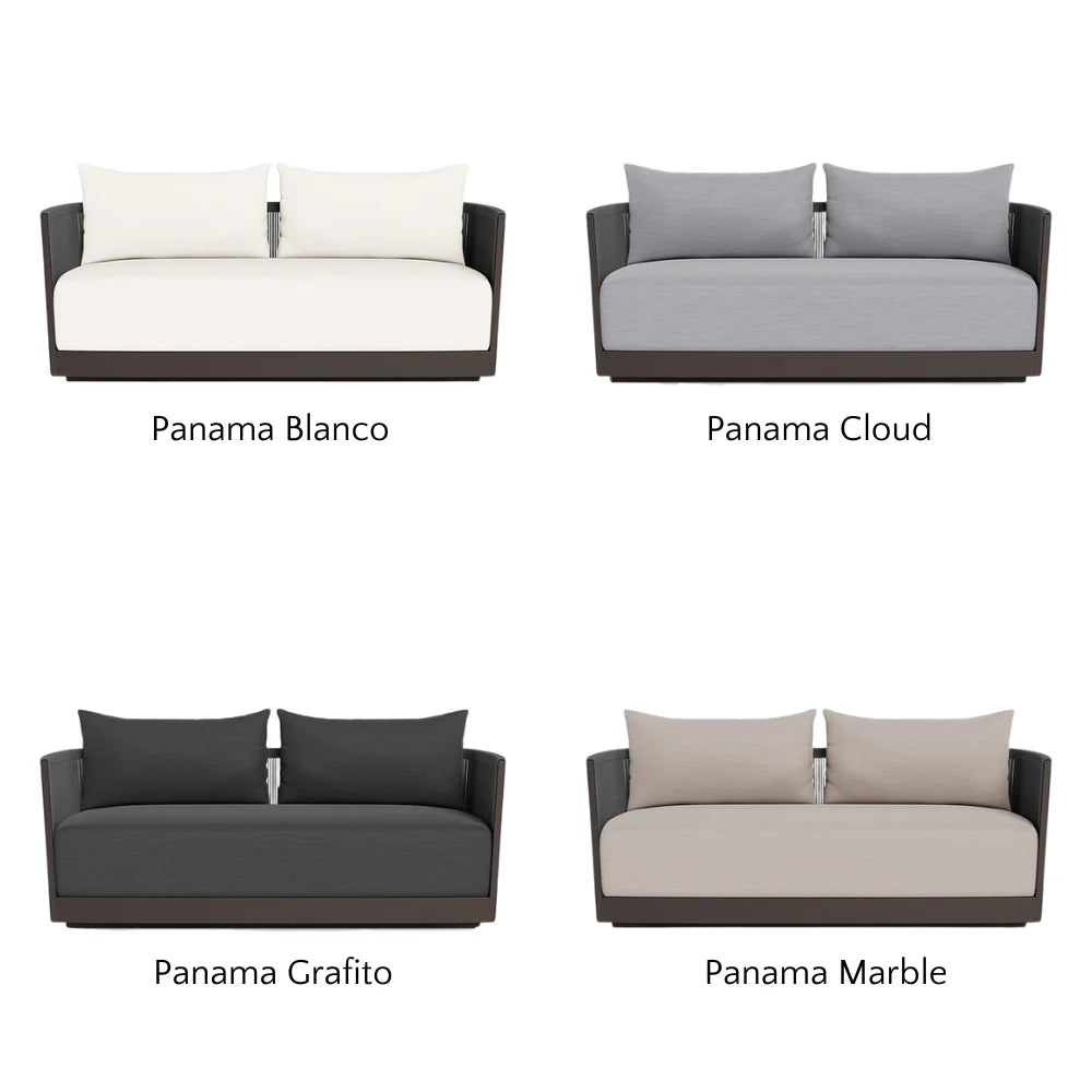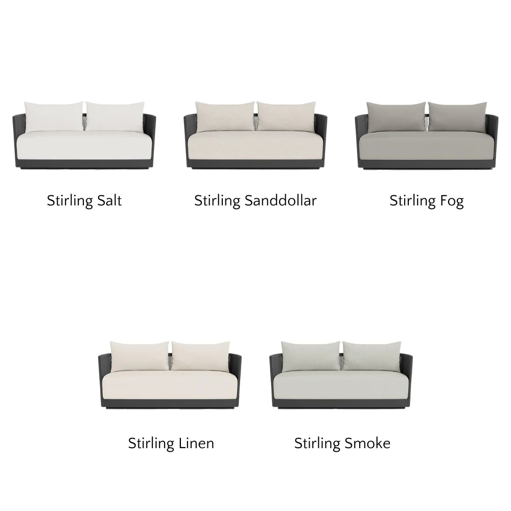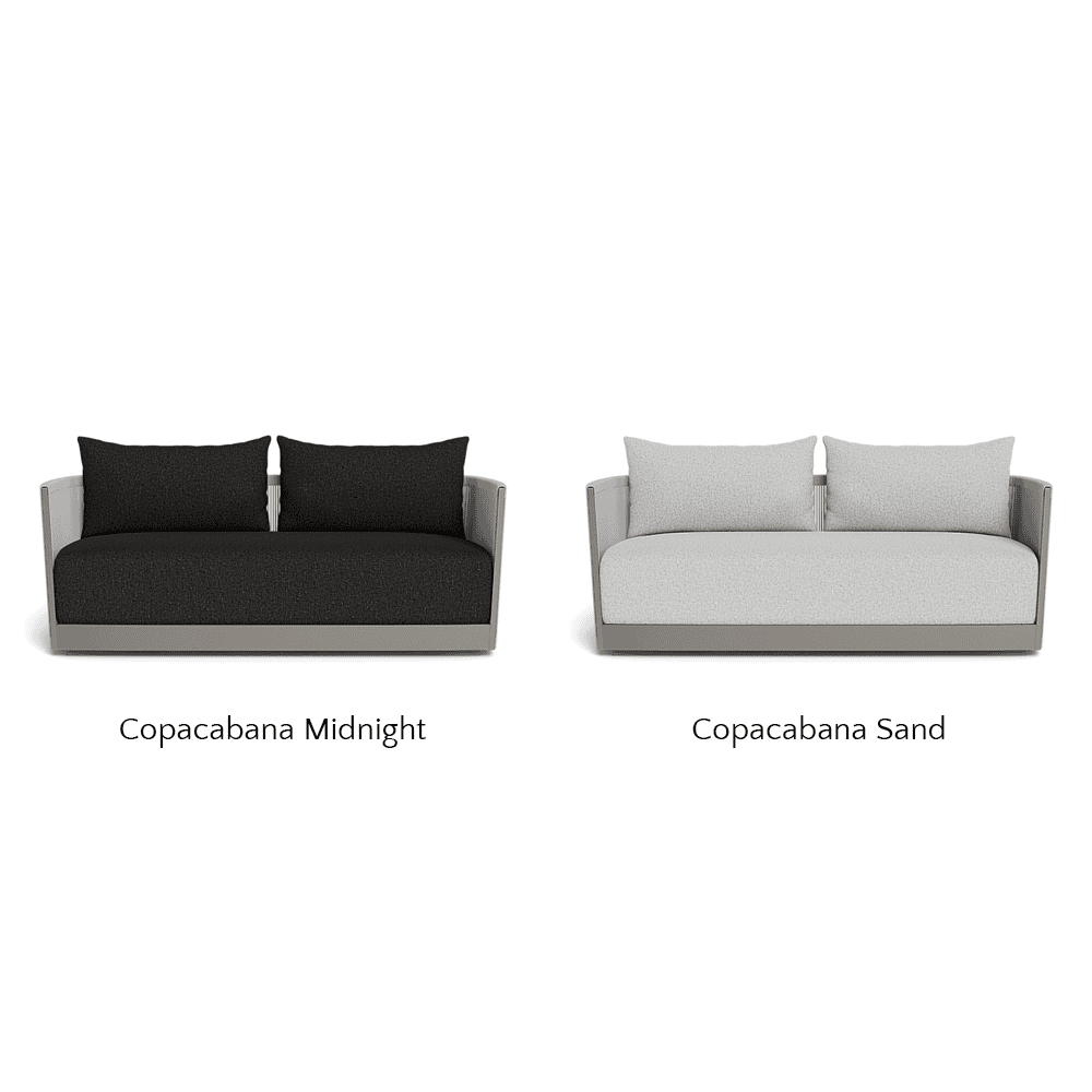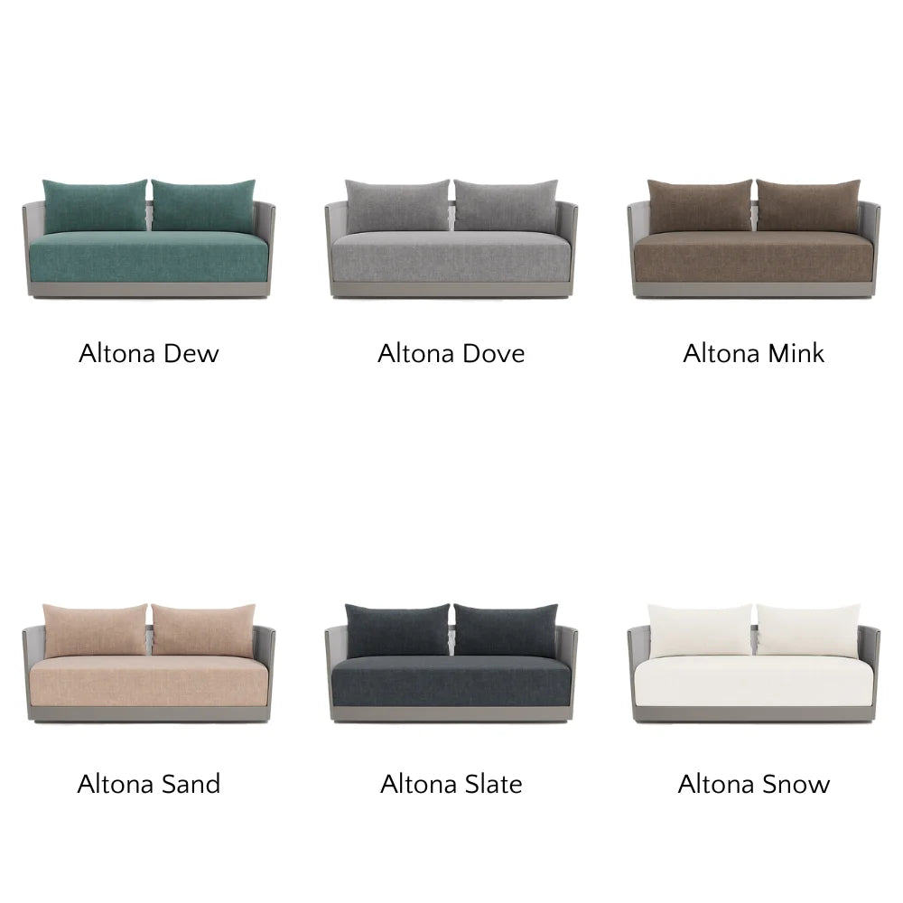 Antigua Outdoor 2 Seat Sofa features a generously sized bench cushion accompanied by two knife-edge back cushions, offering a comfortable seating experience for outdoor lounging or socializing. This outdoor loveseat features a graceful curves and low-profile plinth base providing a clean, modern silhouette that complements any outdoor space and a wide range of outdoor lounge furniture styles.