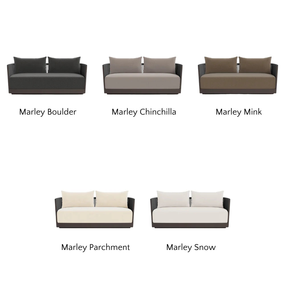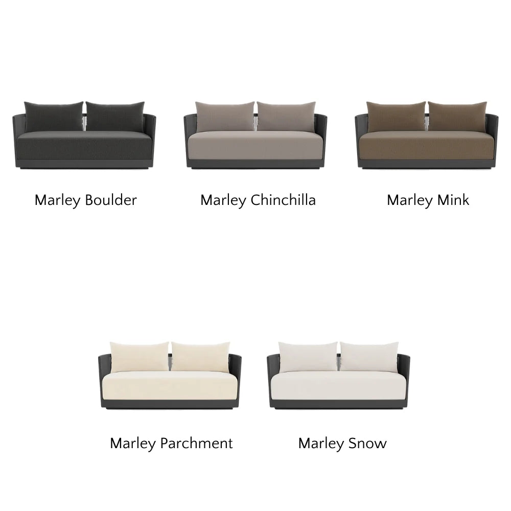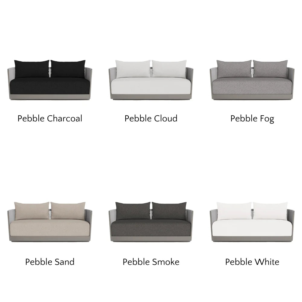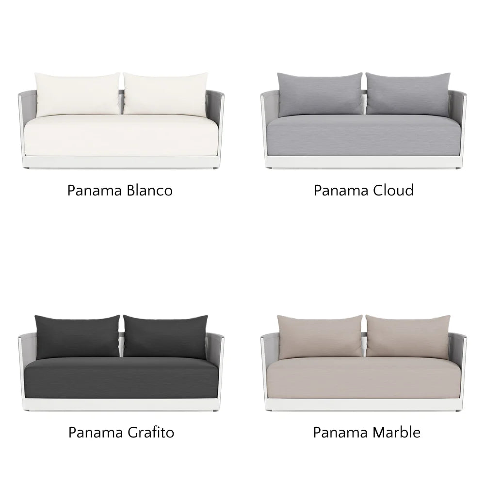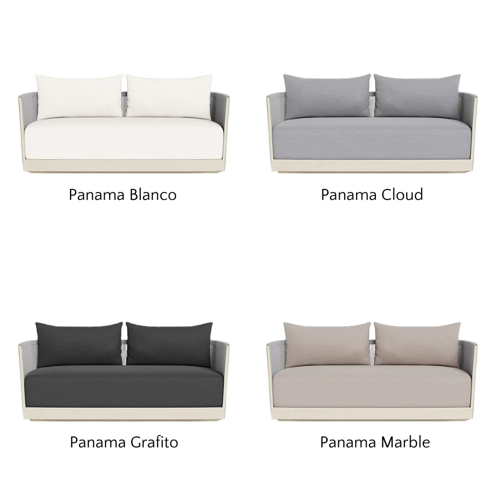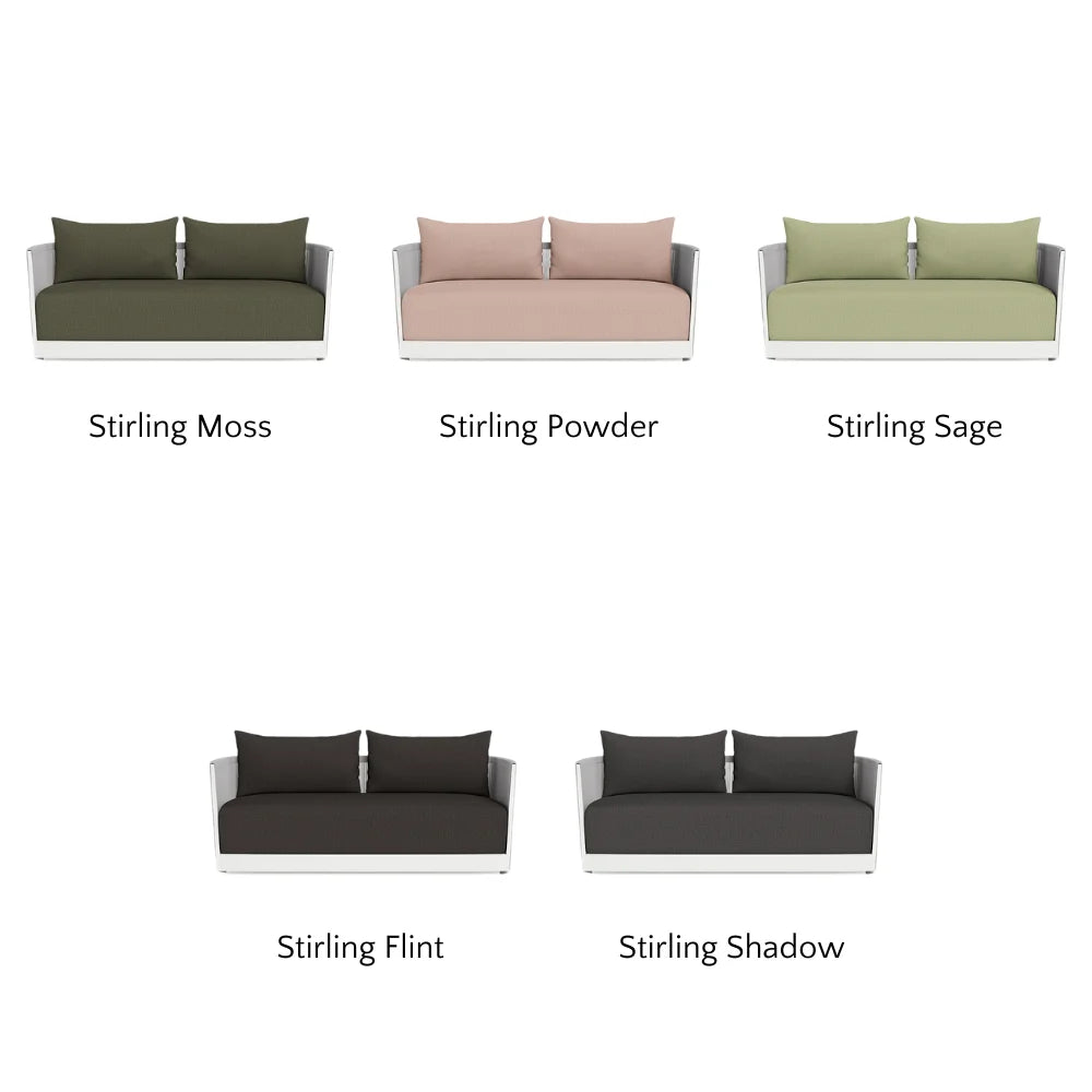 Antigua Outdoor 2 Seat Sofa features a generously sized bench cushion accompanied by two knife-edge back cushions, offering a comfortable seating experience for outdoor lounging or socializing. This outdoor loveseat features a graceful curves and low-profile plinth base providing a clean, modern silhouette that complements any outdoor space and a wide range of outdoor lounge furniture styles.