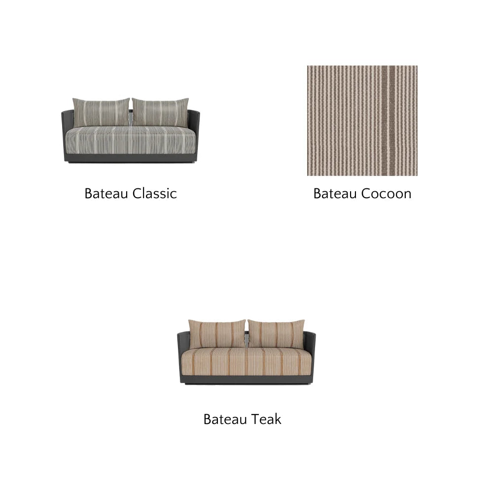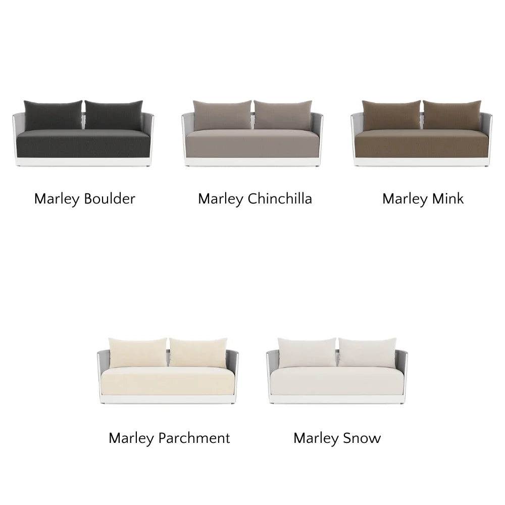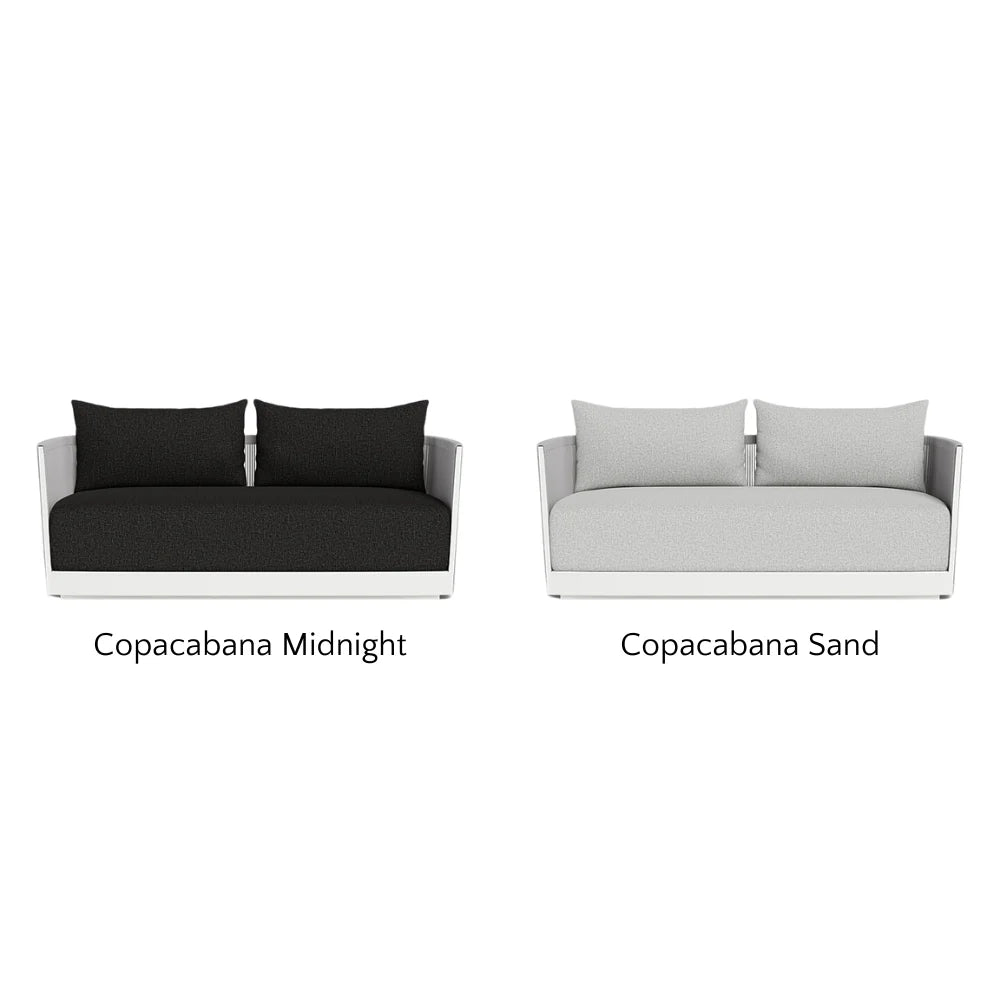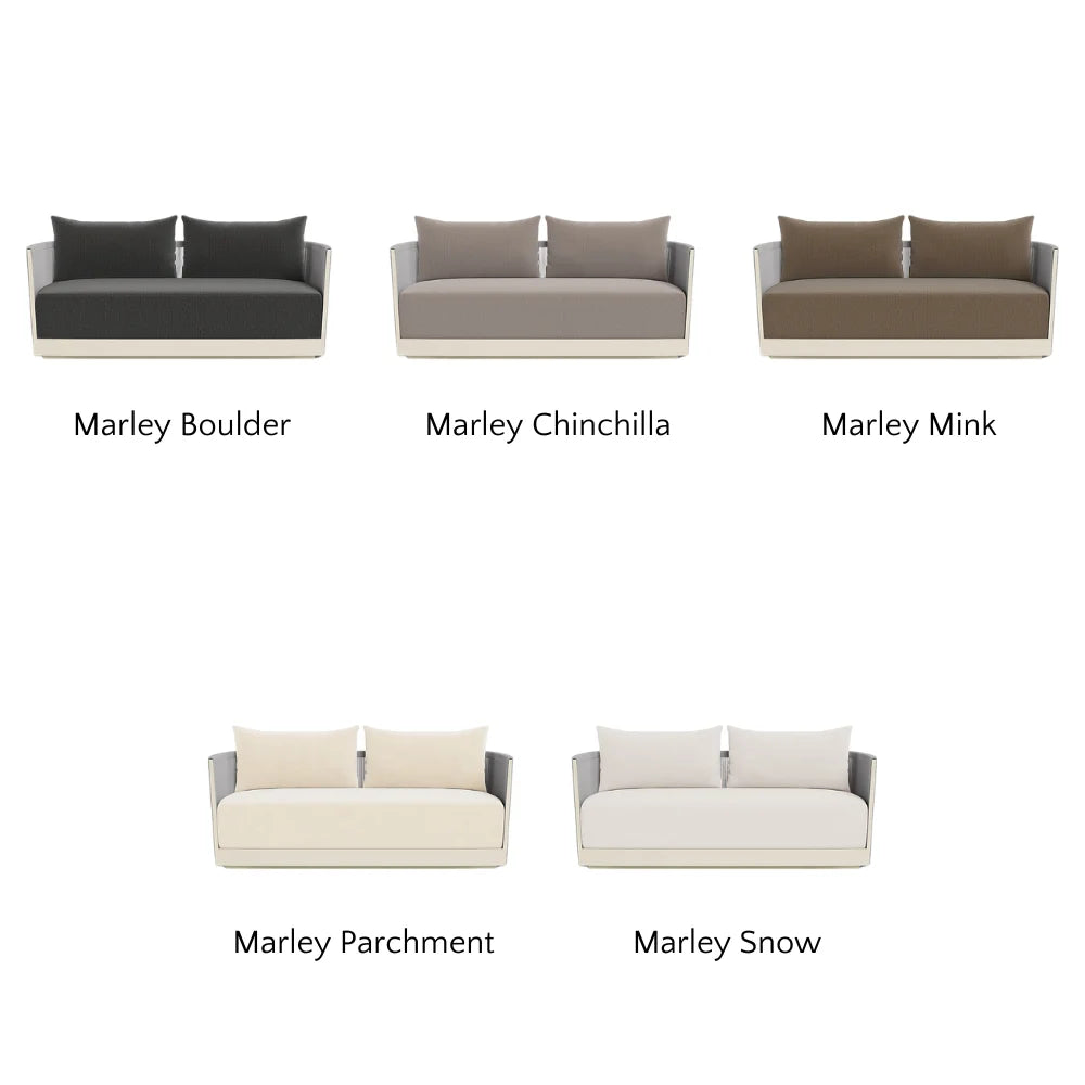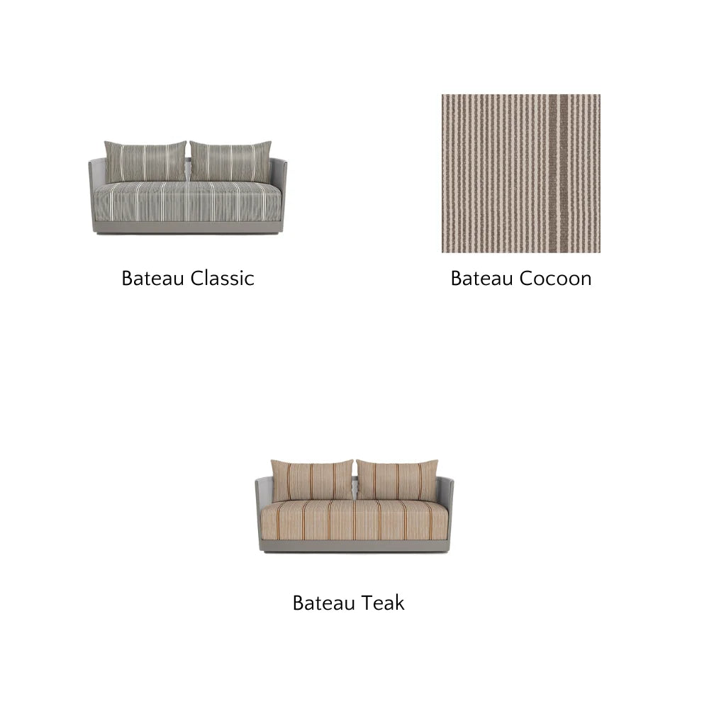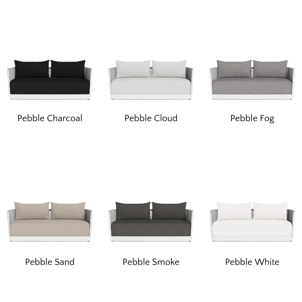 Antigua Outdoor 2 Seat Sofa features a generously sized bench cushion accompanied by two knife-edge back cushions, offering a comfortable seating experience for outdoor lounging or socializing. This outdoor loveseat features a graceful curves and low-profile plinth base providing a clean, modern silhouette that complements any outdoor space and a wide range of outdoor lounge furniture styles.