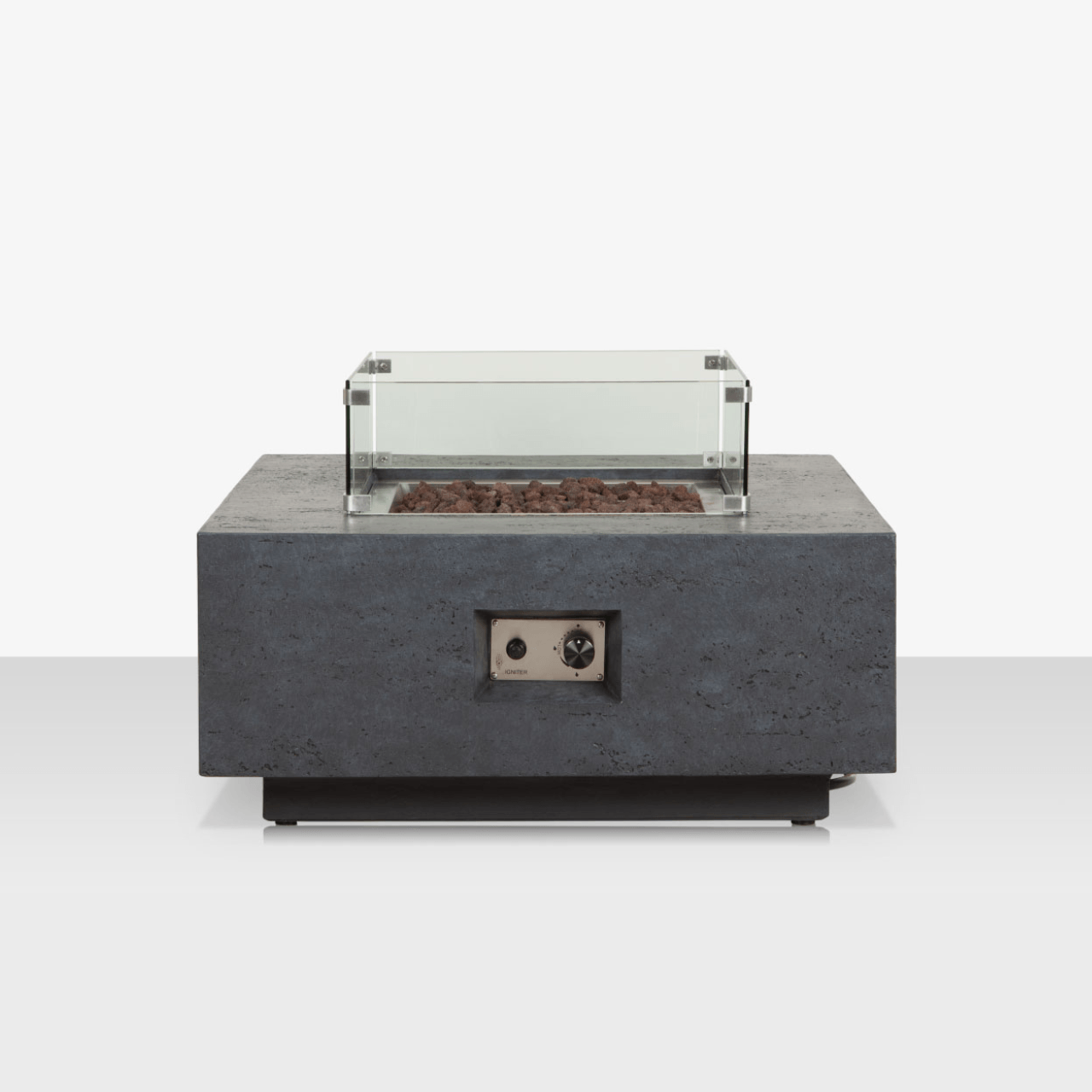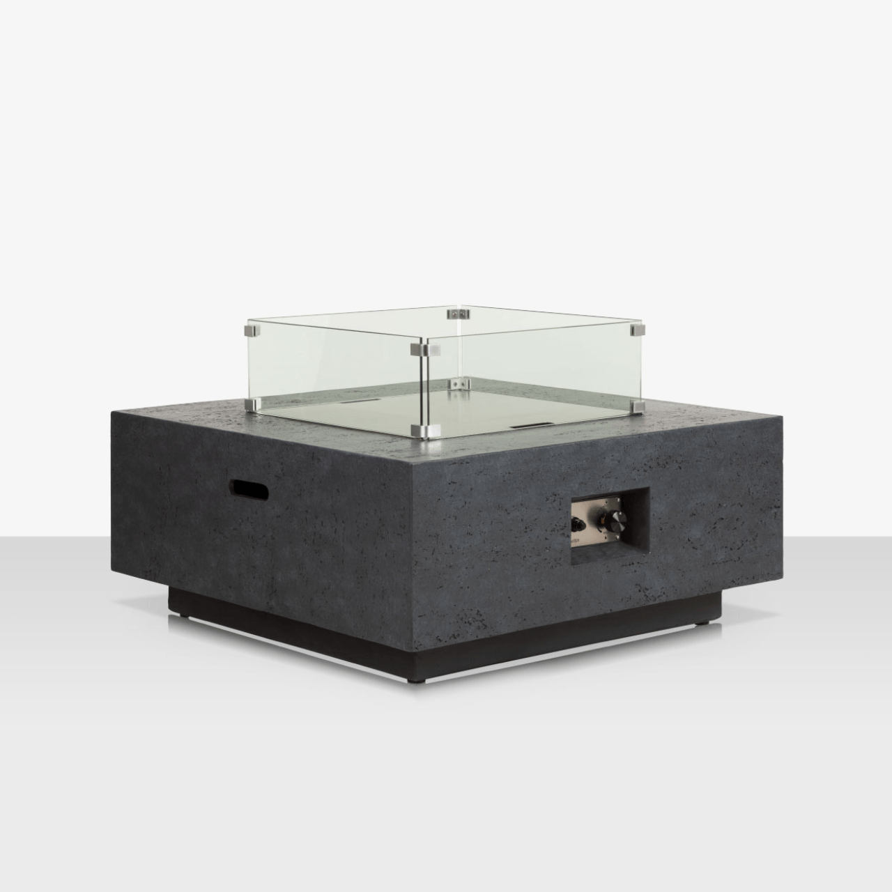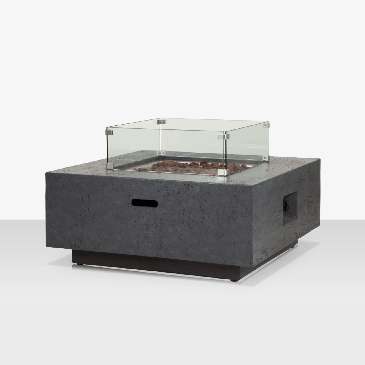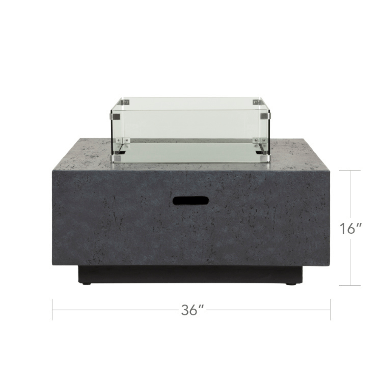 Get the best of style and performance with the Elements Square Concrete Fire Pit. Made of Glass Fiber Reinforced Concrete (GFRC), this versatile fire pit is available in a Dark Gray finish. Customize it with optional features, including a protective cover in either Sunbrella Upholstery or Sunbrella Awning, tempered glass wind guards, and a top lid cover. Set includes 4 glass pieces and 8 metal connectors, with options for propane or natural gas.