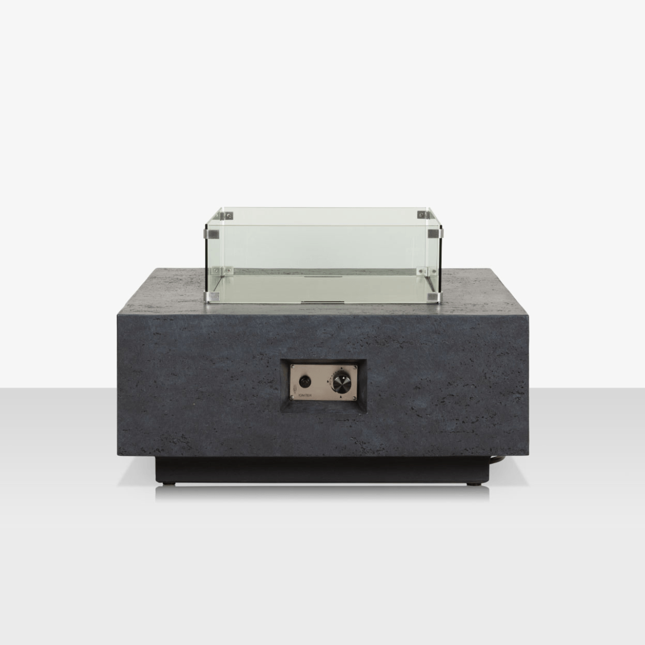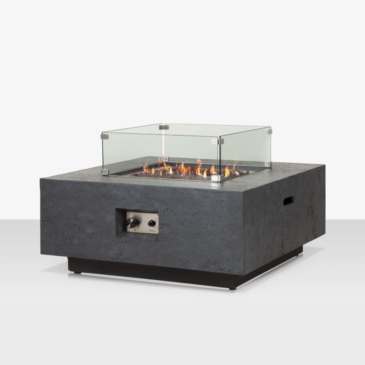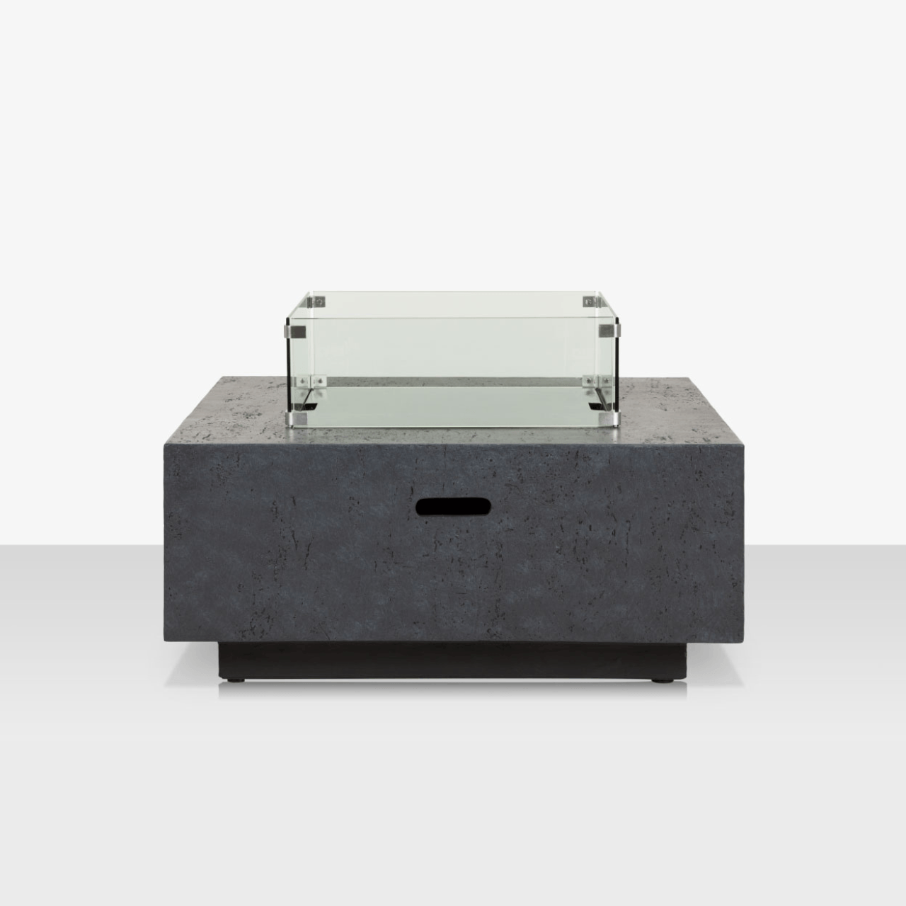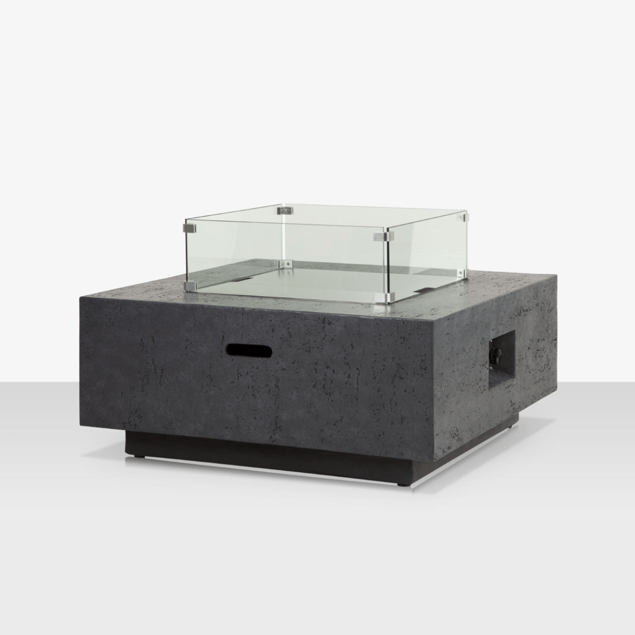 Get the best of style and performance with the Elements Square Concrete Fire Pit. Made of Glass Fiber Reinforced Concrete (GFRC), this versatile fire pit is available in a Dark Gray finish. Customize it with optional features, including a protective cover in either Sunbrella Upholstery or Sunbrella Awning, tempered glass wind guards, and a top lid cover. Set includes 4 glass pieces and 8 metal connectors, with options for propane or natural gas.