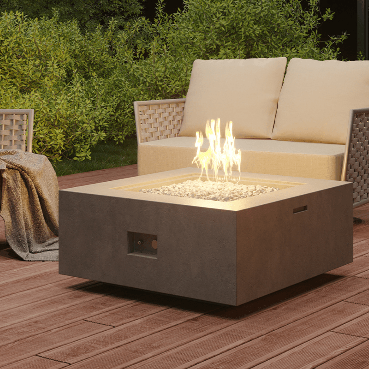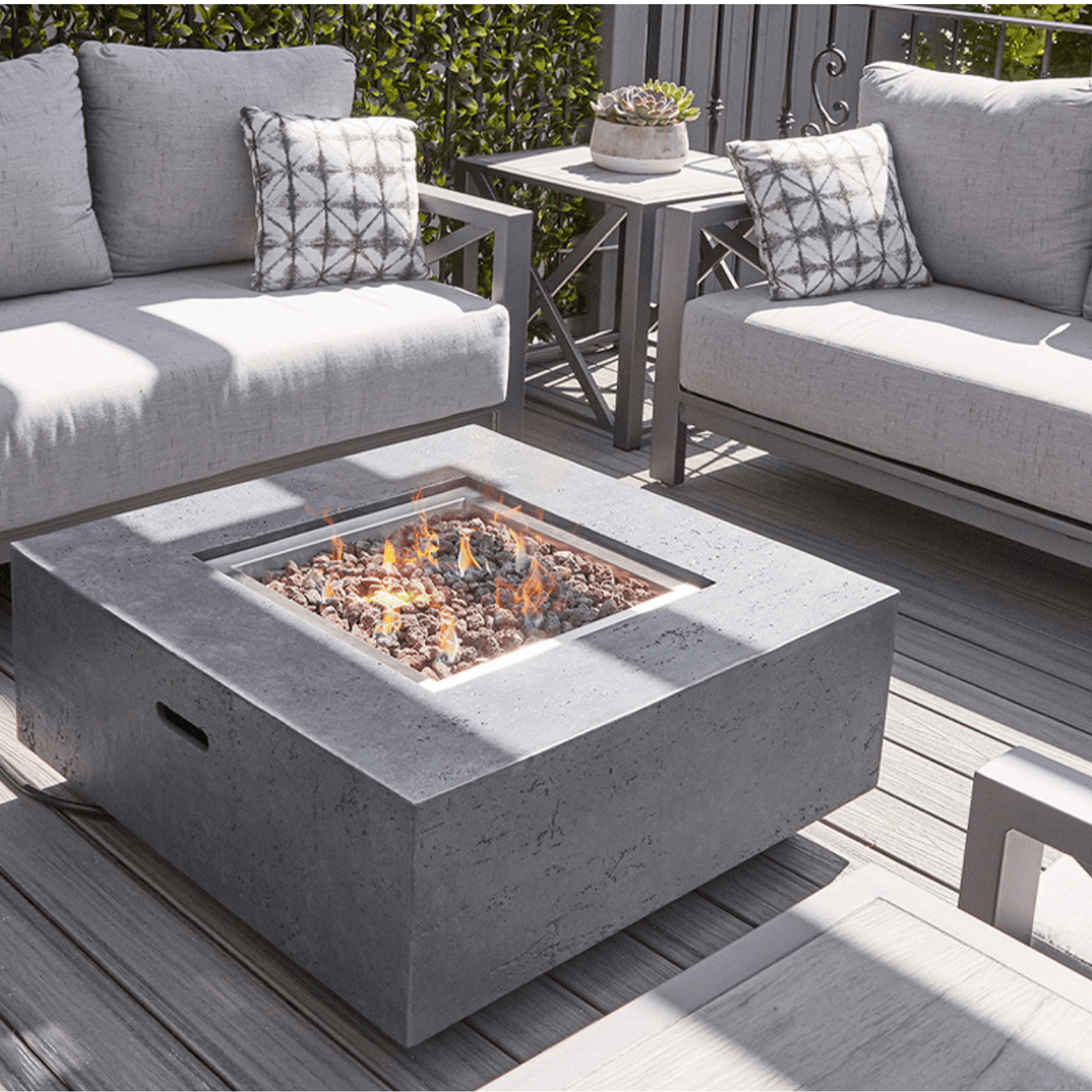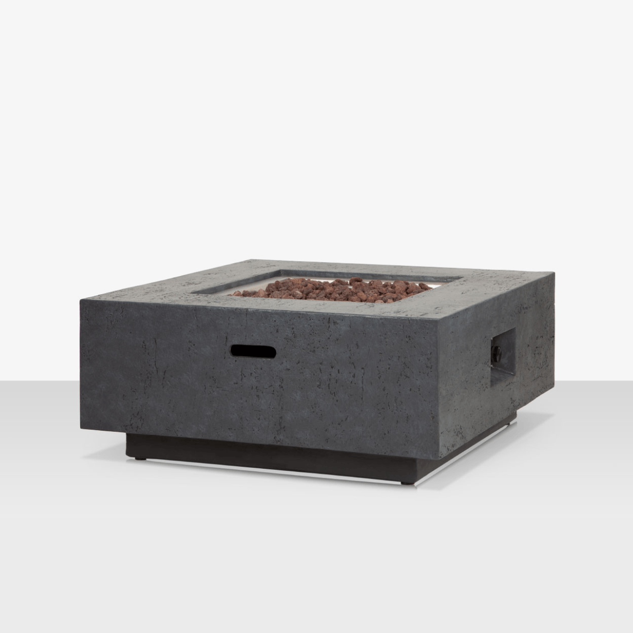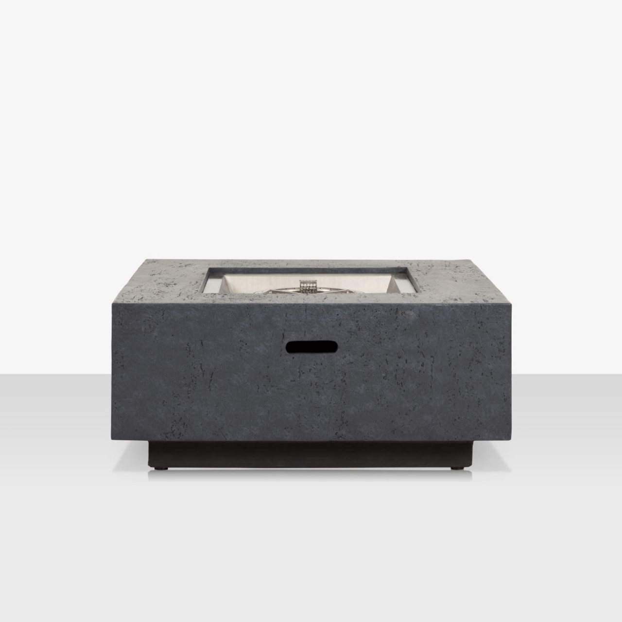 Get the best of style and performance with the Elements Square Concrete Fire Pit. Made of Glass Fiber Reinforced Concrete (GFRC), this versatile fire pit is available in a Dark Gray finish. Customize it with optional features, including a protective cover in either Sunbrella Upholstery or Sunbrella Awning, tempered glass wind guards, and a top lid cover. Set includes 4 glass pieces and 8 metal connectors, with options for propane or natural gas.