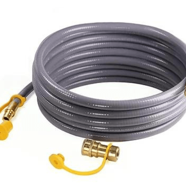 - A 10-foot hose with a 3/8" flare fitting at the end for natural gas connection. Or a 10-foot hose with a standard connection for a propane tank.