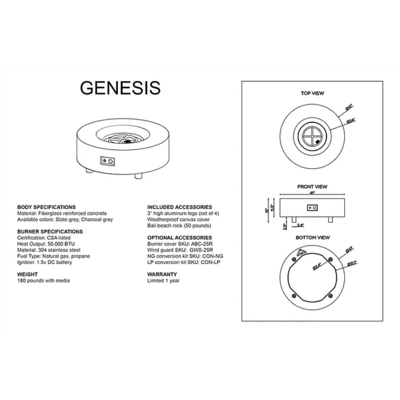 The Genesis Outdoor Fire Pit Table is hand cast from high-performance Glass Fiber Reinforced Concrete (GFRC) with two coats of clear sealer. It has a slate texture on the sides and a matte texture on top, giving this portable fire pit a contemporary feel with the natural Bali beach fire pit rocks.