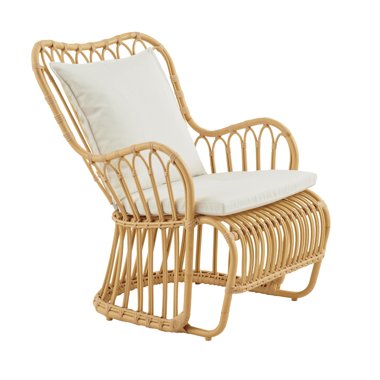 The Kindt Larsen Tulip Chair by BOXHILL embraces the original designers appreciation of organic lines and textures found in nature. Originally designed in 1940, this modern revitalized piece captures attention with its distinctive look and natural beauty. The design features a curved back of connected rattan arches extending down to the floor with gently curved arms that wrap around the cantilever base. A wide seat and waterfall front add to the comfort of this graceful chair. Handcrafted from natural sustainable Indonesian rattan, the Tulip Chair adds a traditional elevated feel to indoor living spaces.