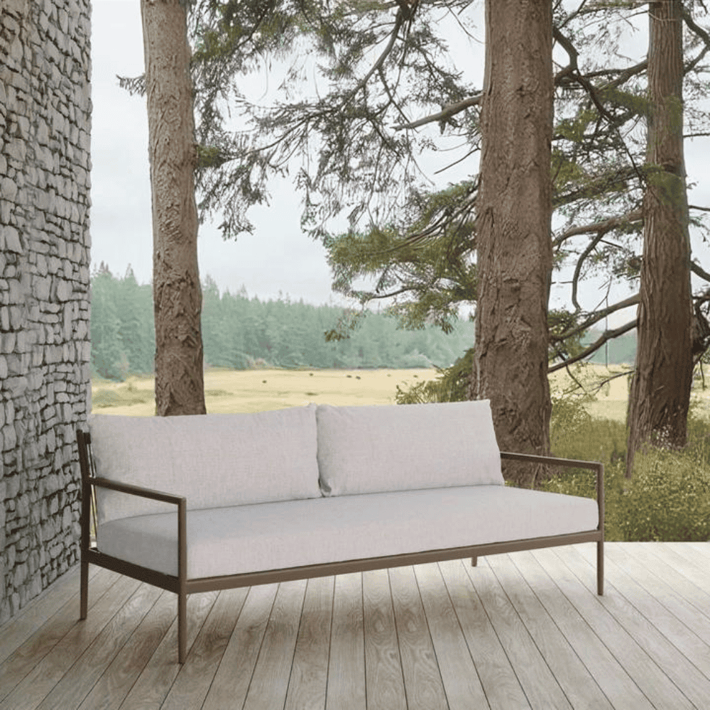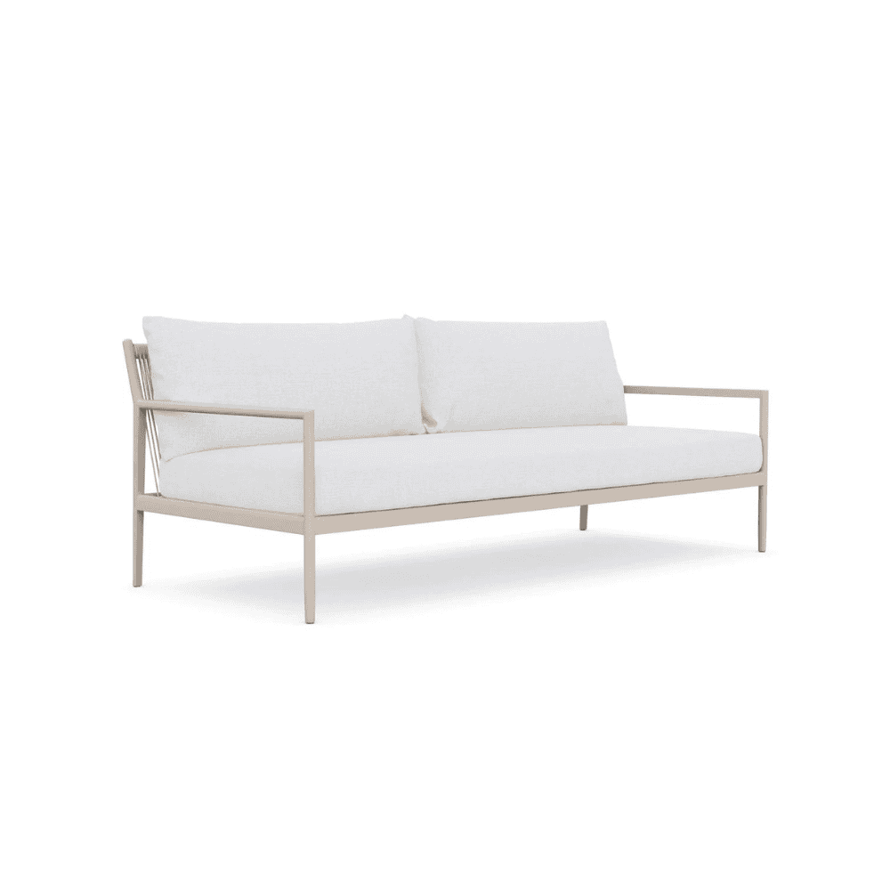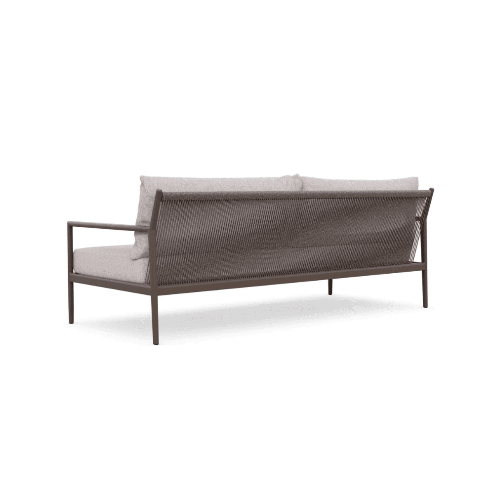 The Madeira Outdoor 3 Seat Sofa from Boxhill excites audiences with linear, breezy weaves of all-weather textelene rope, rigorously formulated to resist harsh weather and commercial spaces. An alluring, tubular frame is formed, welded, and polished by hand using lightweight, durable aluminum. The varied thickness and subtle differences of form create a cohesive, yet mesmerizing composition from every angle. The tasteful simplicity of intertwining textelene rope captivates with a linear system of support and backing, offering reliable and lasting comfort. High-density cushions, wrapped in delicately soft solution-dyed acrylic Solvita Performance Fabric, caters to deep-down comfort and combats severe conditions. Hassle-free materials allow you to sit back and rest easy in the sophistacated, mid-century modern Madeira Outdoor 3 Seat Sofa.