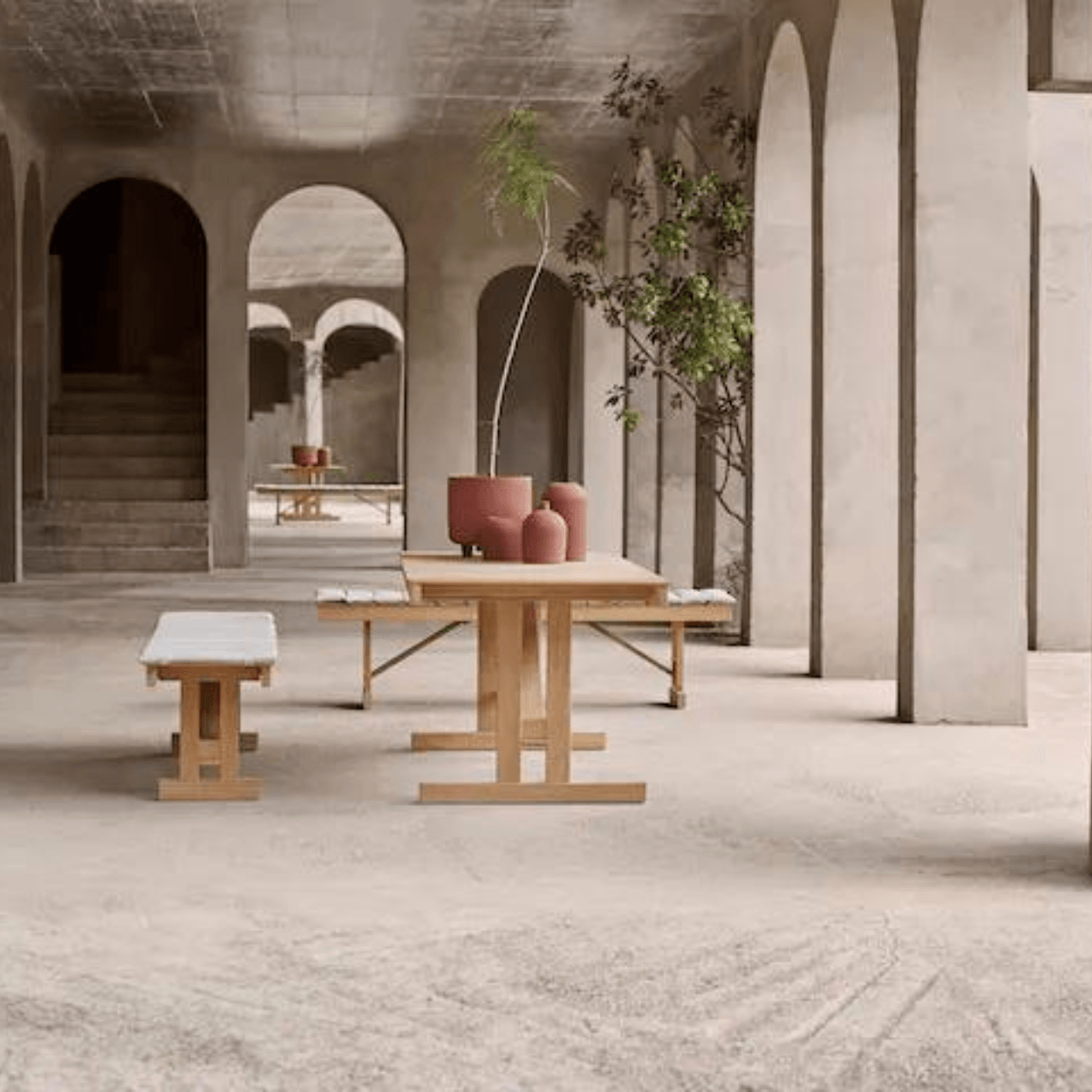 Børge Mogensen’s functionalist approach is evident in the foldable set of table and benches created by the furniture designer in 1971.