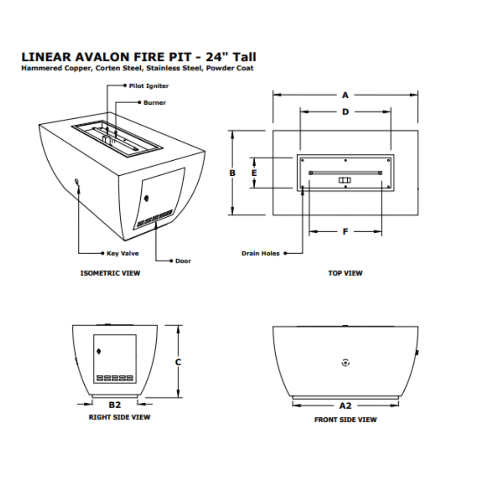 Elevate your outdoor sanctuary with the Avalon 24" Tall Powder Coated Outdoor Fire Pit, seamlessly blending comfort with elegance. Crafted akin to our esteemed Avalon Fire pits, this exquisite furnishing promises to metamorphose your outdoor space into a cozy haven during cool evenings. Catering to those with a penchant for heightened aesthetics, this fire table stands proudly at 24" tall. Its enchanting flames exude warmth uniformly, ensuring you and your guests stay snug. Constructed from premium steel and coated with powder for durability, this metal fire pit braves the elements with resilience. Its elevated stature and rectangular design make it a versatile addition to any outdoor setting. With options ranging across four lengths, it caters to spaces of varying sizes effortlessly.