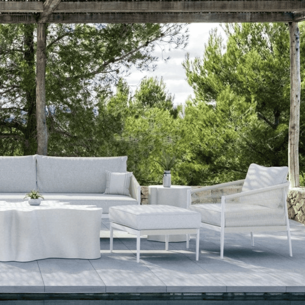 The distinct linear weave and tapered legs of Boxhill's Catalina Ottoman unite comfort and chic style. Handwoven all-weather rope with a matte finish gives this chair a striking look that meshes with both inside and outside settings. Its durable, powder-coated aluminum frame and prolonged-lasting performance rope fend off cracking, fading, and sagging. High density cushions with chenille performance fabric withstand tough weather, making it a lasting addition to your outdoor furniture. Incorporate the Catalina Ottoman for chicness, convenience, and timeless style.