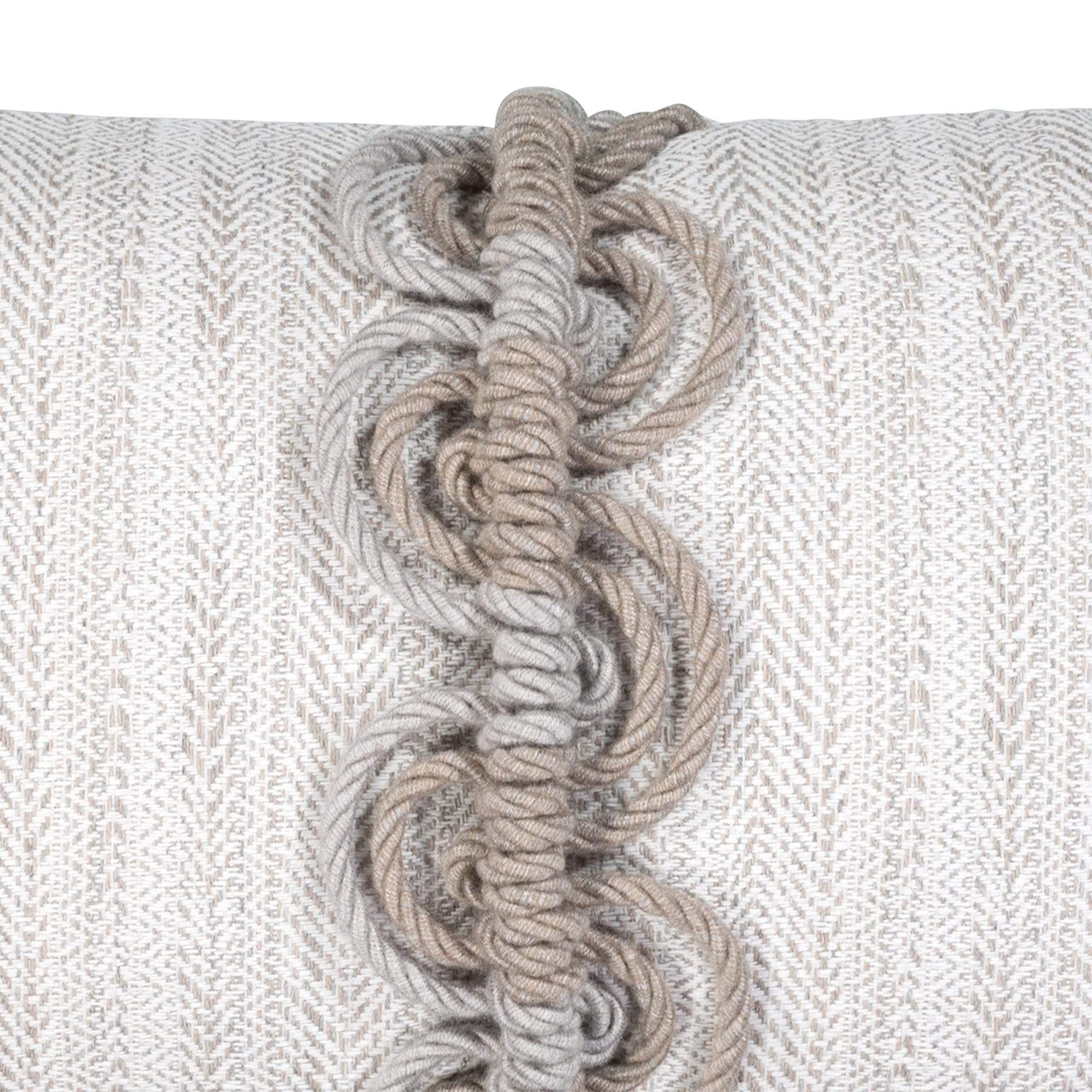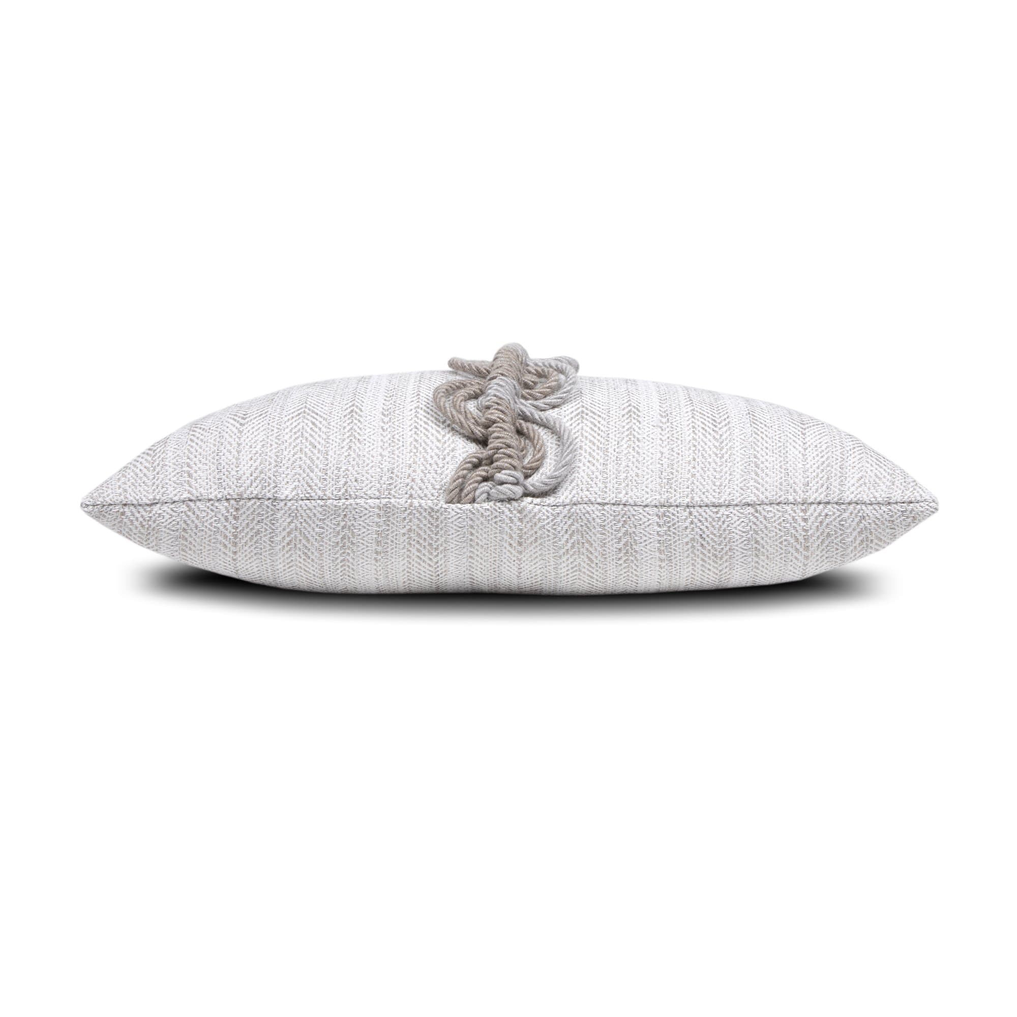 Made from 100% Sunbrella yarns, the Dressage pillow features a textural herringbone ground with a hand woven rope band in two tones of gray, adding dimension and drama.