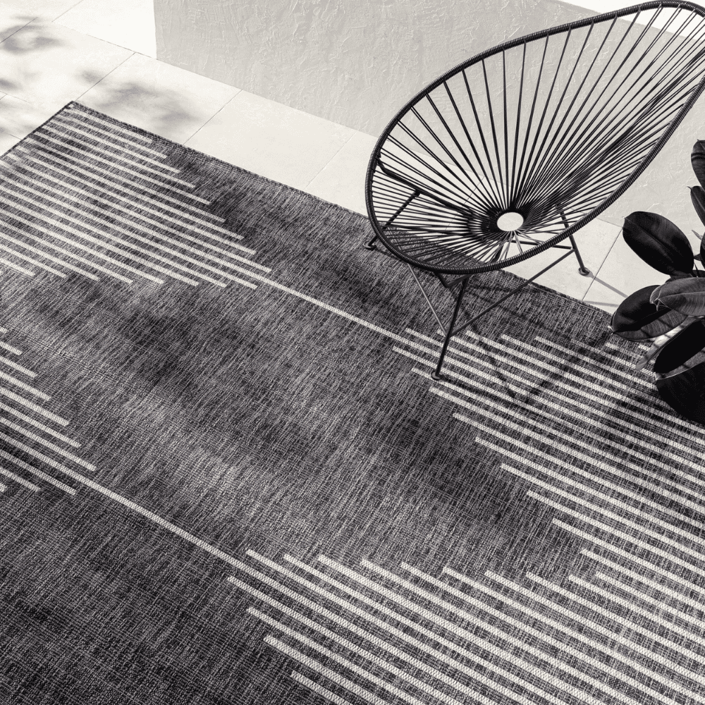 The rug features a charcoal hue, giving it a modern yet timeless appeal that complements various outdoor decor styles. It has a sleek, rectangular shape with a precise, machine-woven finish, providing a crisp and clean look without the distraction of fringes. Sized perfectly for versatile use, this outdoor-safe rug brings elegance and functionality together, creating an inviting foundation that enhances the ambiance of any patio, deck, or garden space.