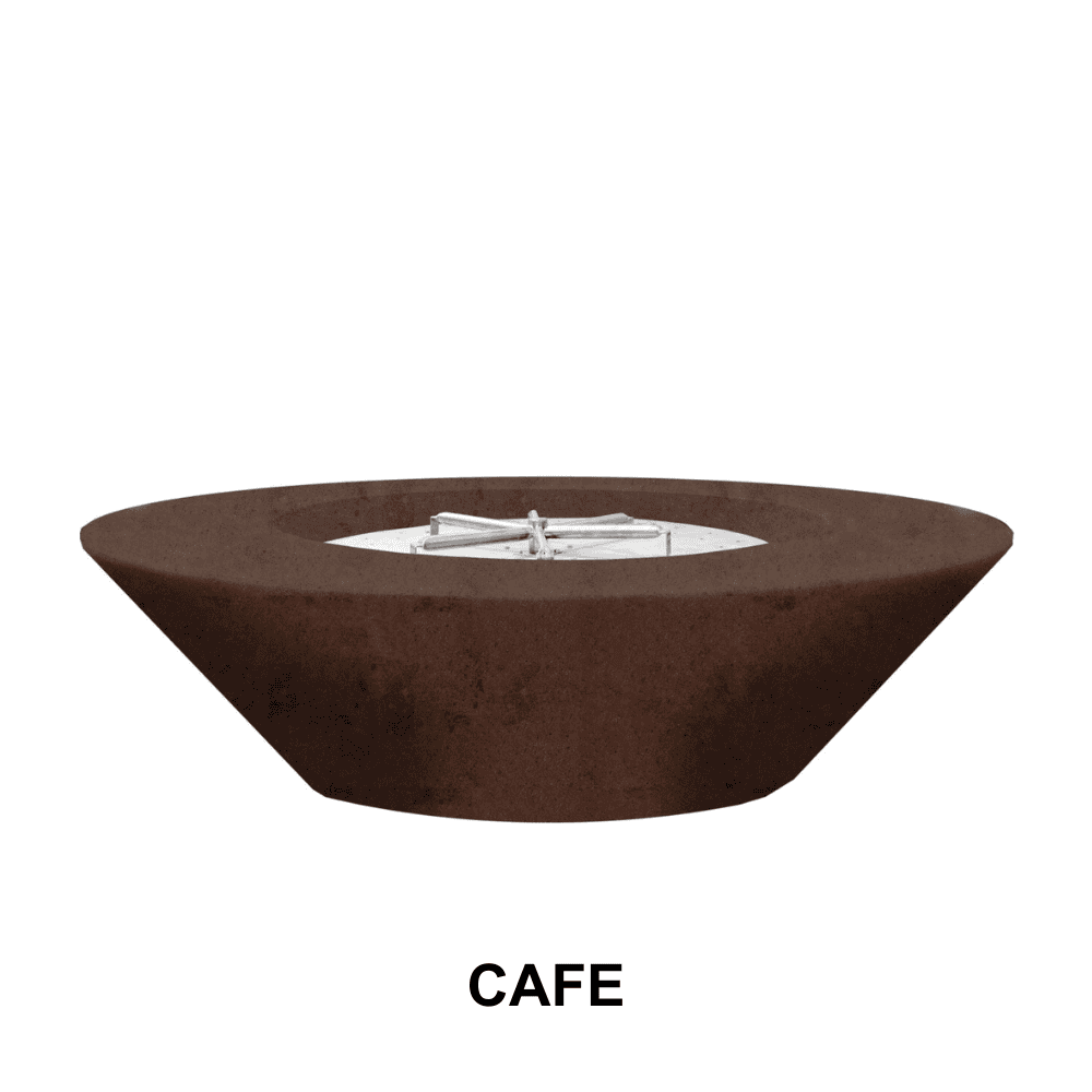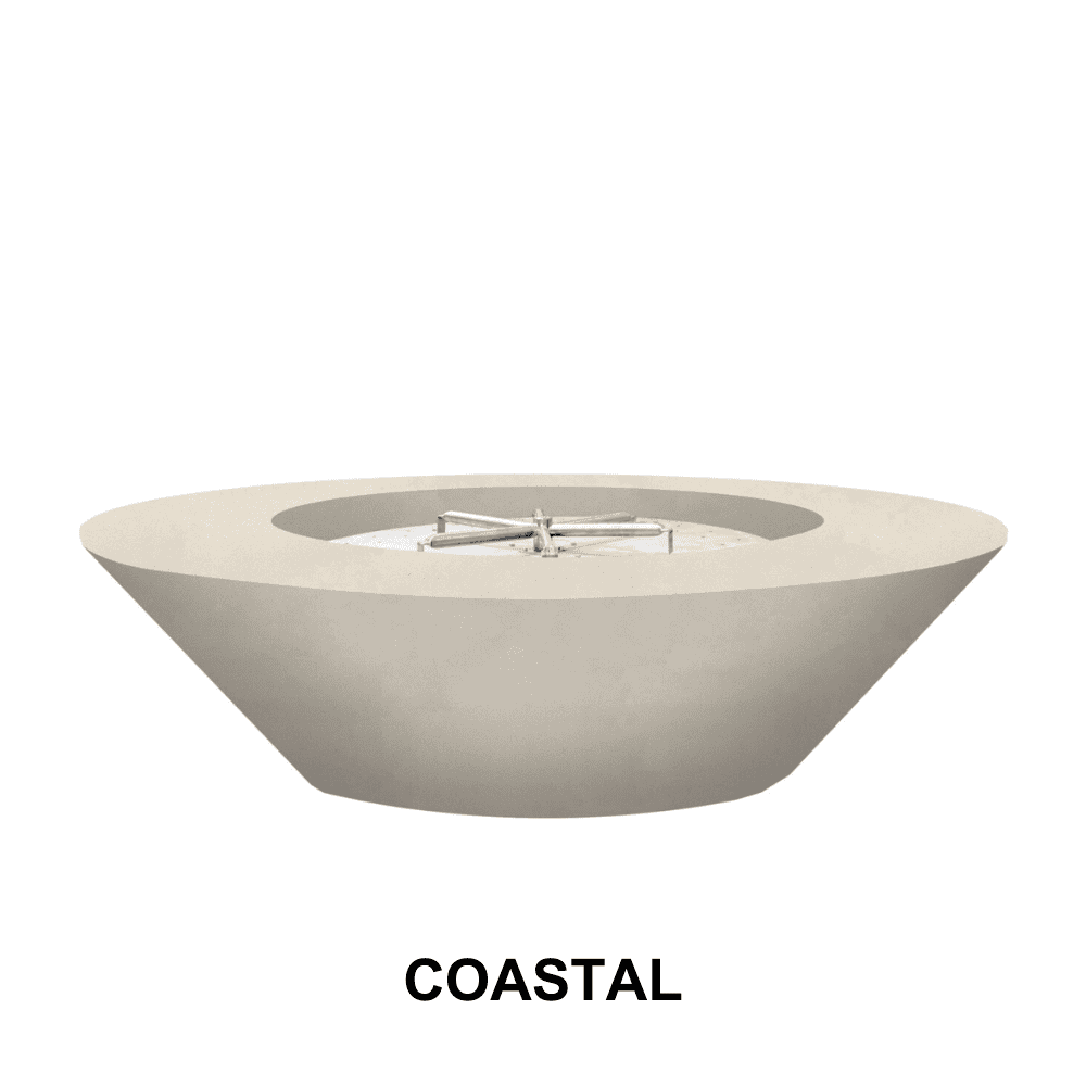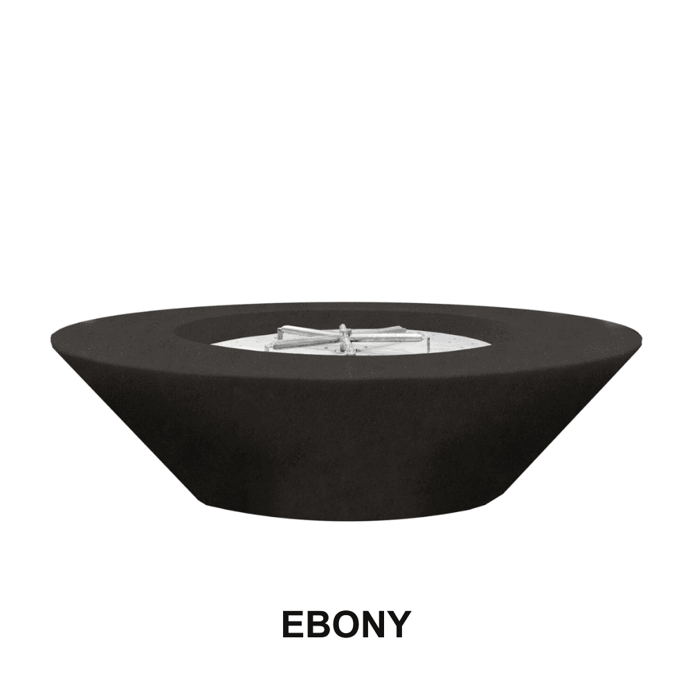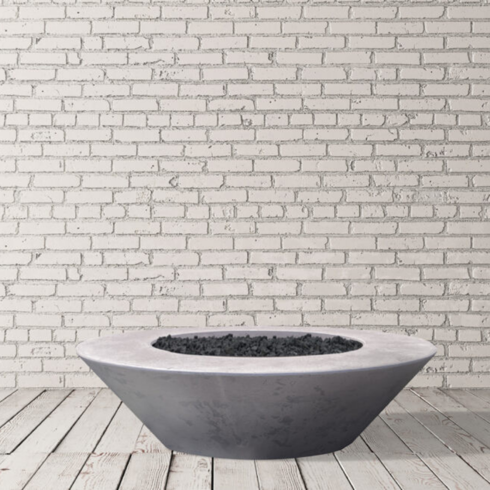 BOXHILL's Embarcadero 60' inch rounded fire pit, has tapered sides that go to a smaller base, this Outdoor circular tapered Concrete Fire Bowl. Each bowl has been hand-crafted using our custom concrete patina finishing process, guaranteeing a one-of-a-kind creation with subtle variation. This 60' inch tapered round fire pit diameter size fire pit vessel provides a functional centerpiece for any backyard, patio or fire side chat area you want to create. The ambient heat provides plenty of warmth for multiple people.