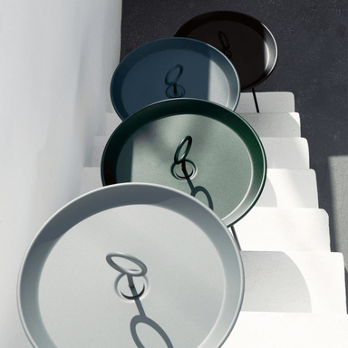 • 4 round outdoor tray table in gray, dark green, dark blue and black color placed on white stairs