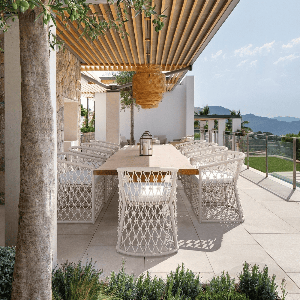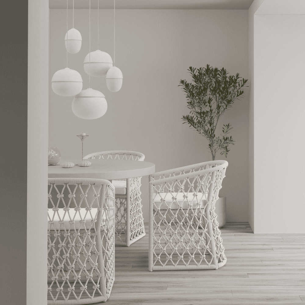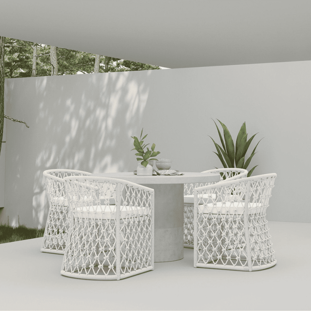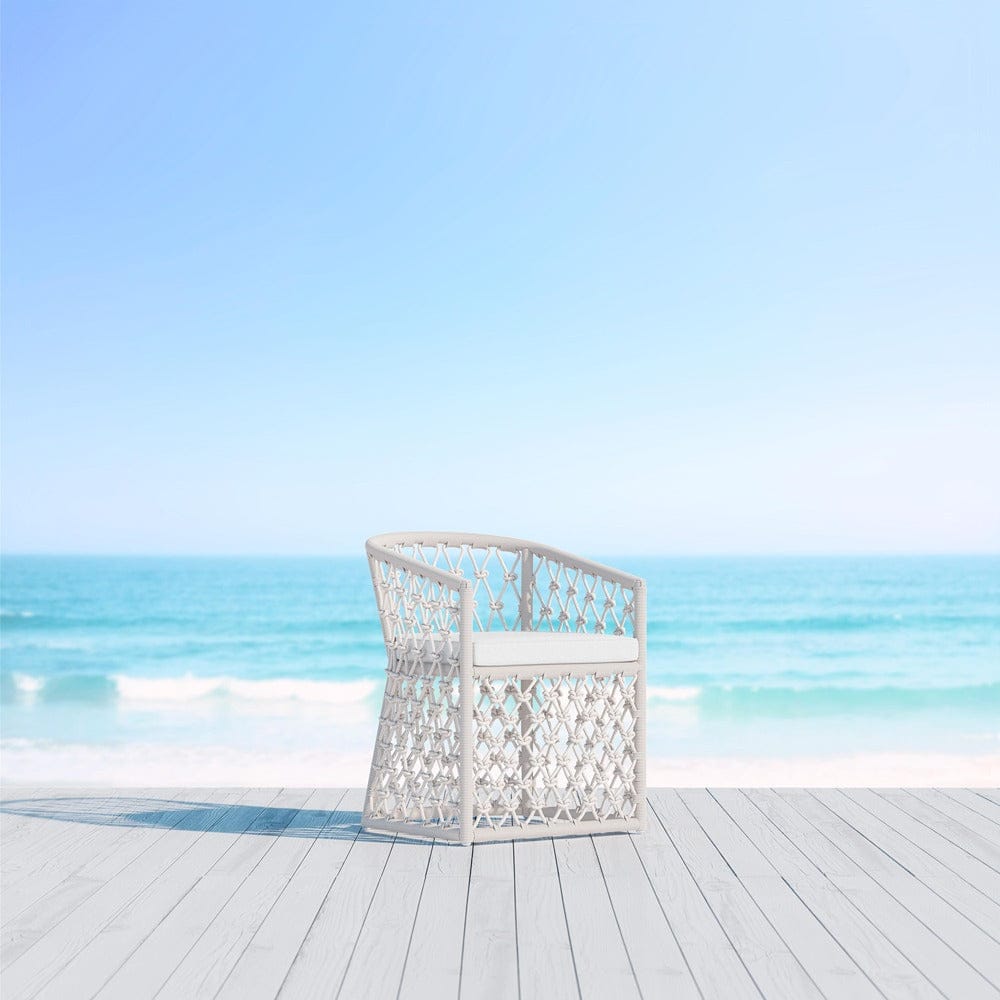 This sophisticated, luxurious Amelia Outdoor Dining Chair by Boxhill is a stunning addition to any dining space. Its intricately crafted design features crisp lines, subtle curves, and a unique hand-knotted rope pattern for an added visual appeal. The powder-coated aluminum frame and all-weather rope construction guarantee a resilient finish, while. . . Show More