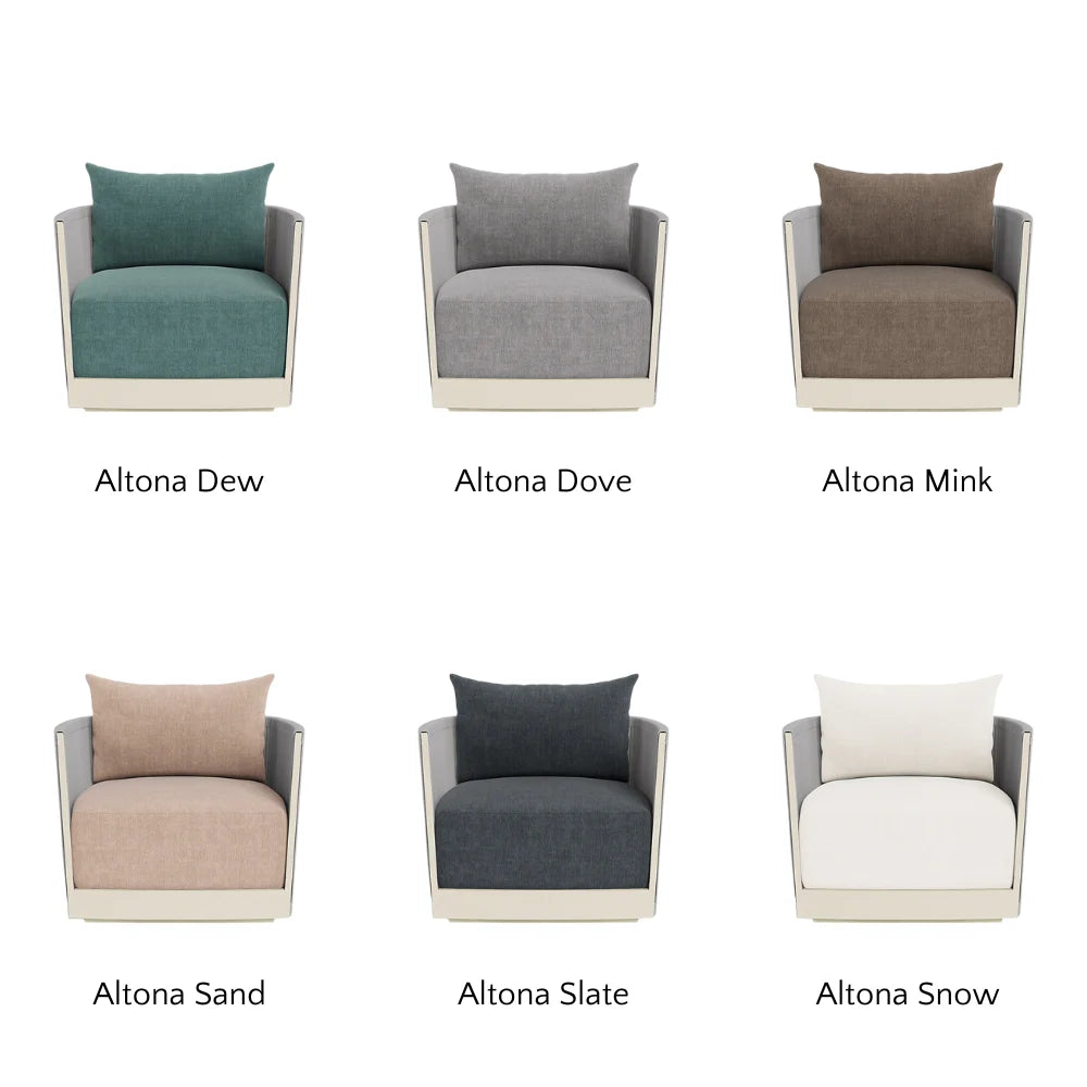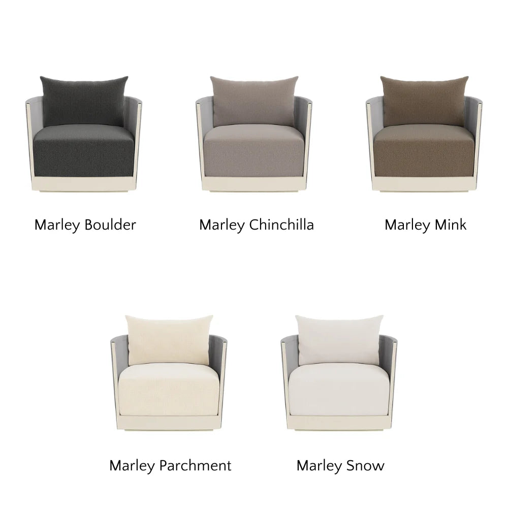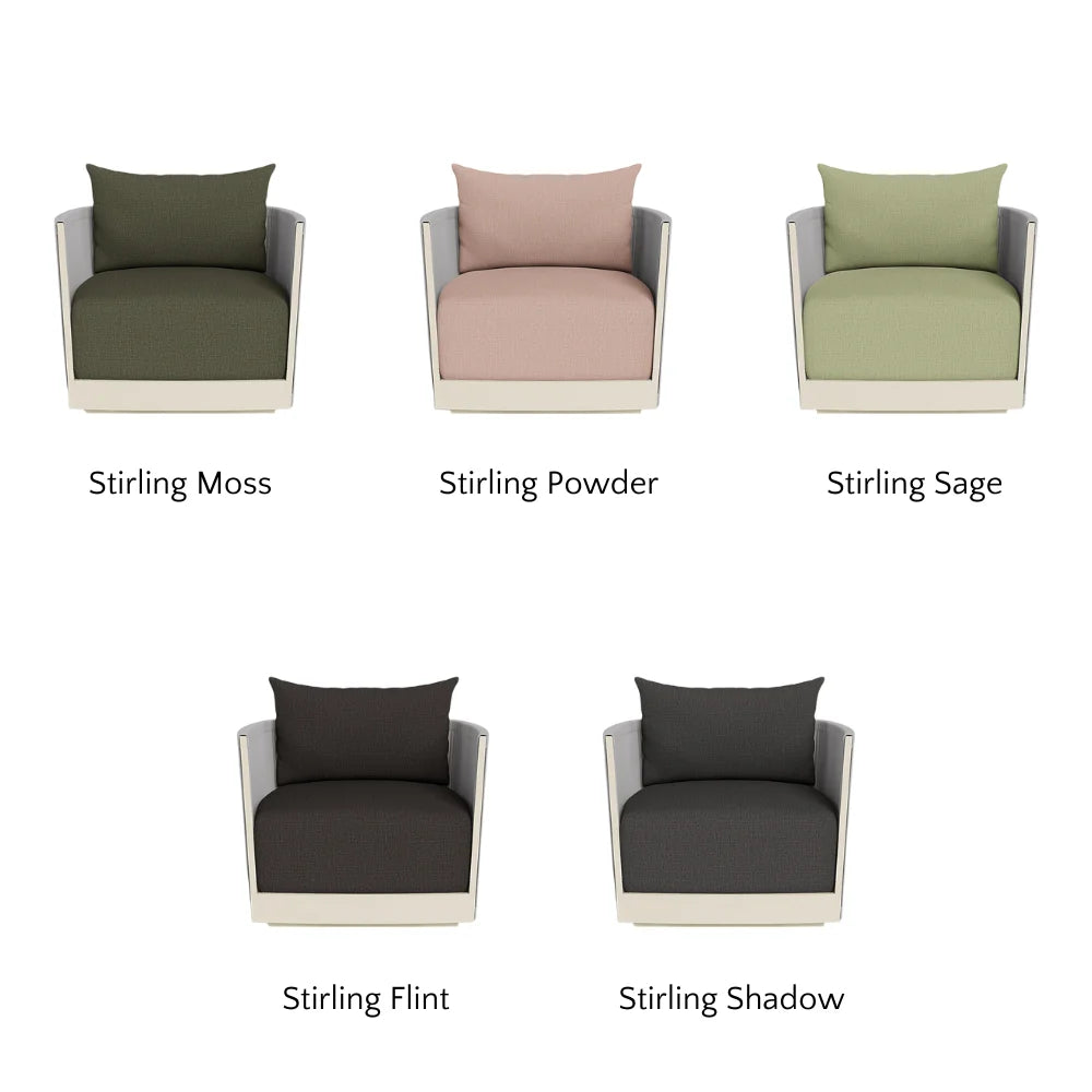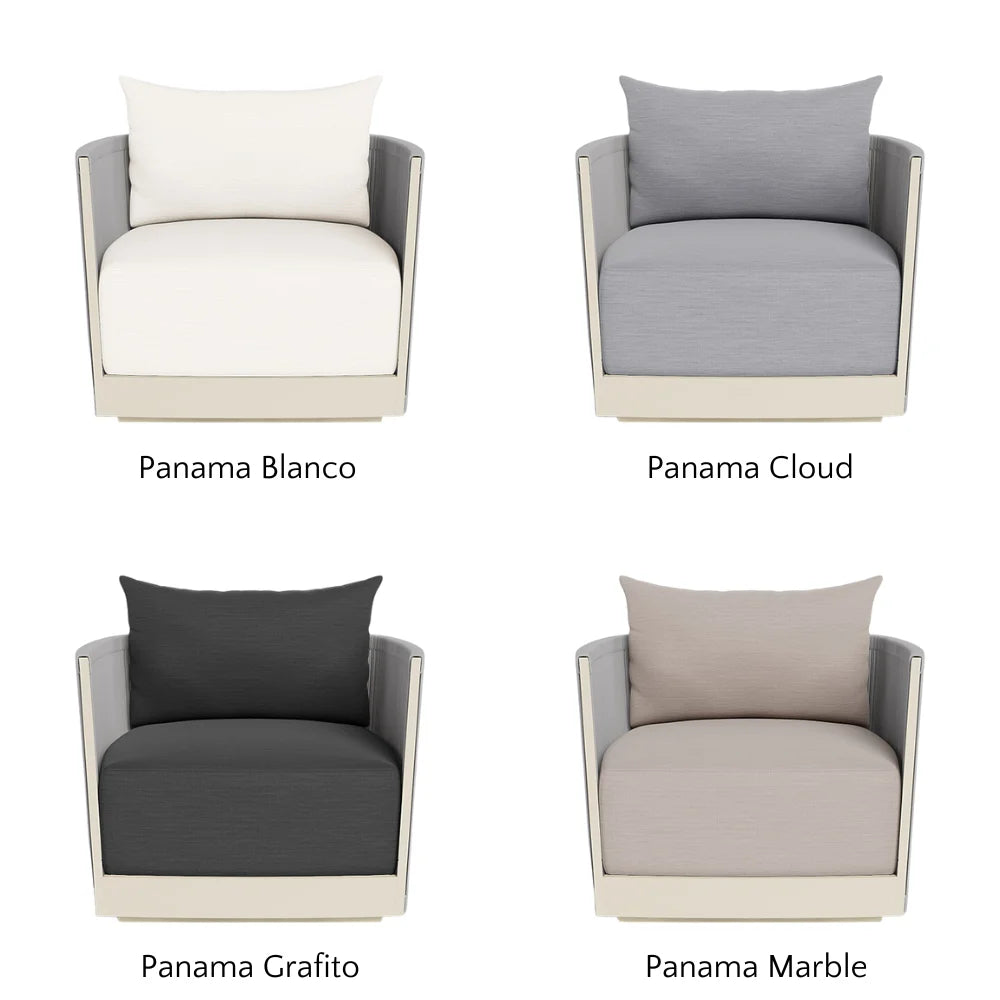 This outdoor swivel chair’s structure begins with a handcrafted extruded aluminum frame, engineered in our workshop for long-lasting stability and corrosion resistance. Each frame receives a premium AkzoNobel Interpon architectural-grade powder coat, giving it exceptional weather durability against UV exposure, humidity, and salt air—making it ideal for harsh climates and seaside installations.