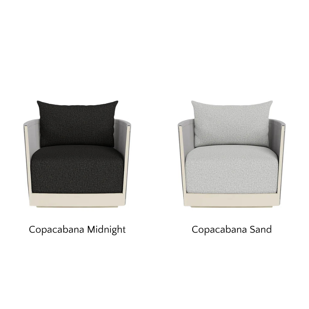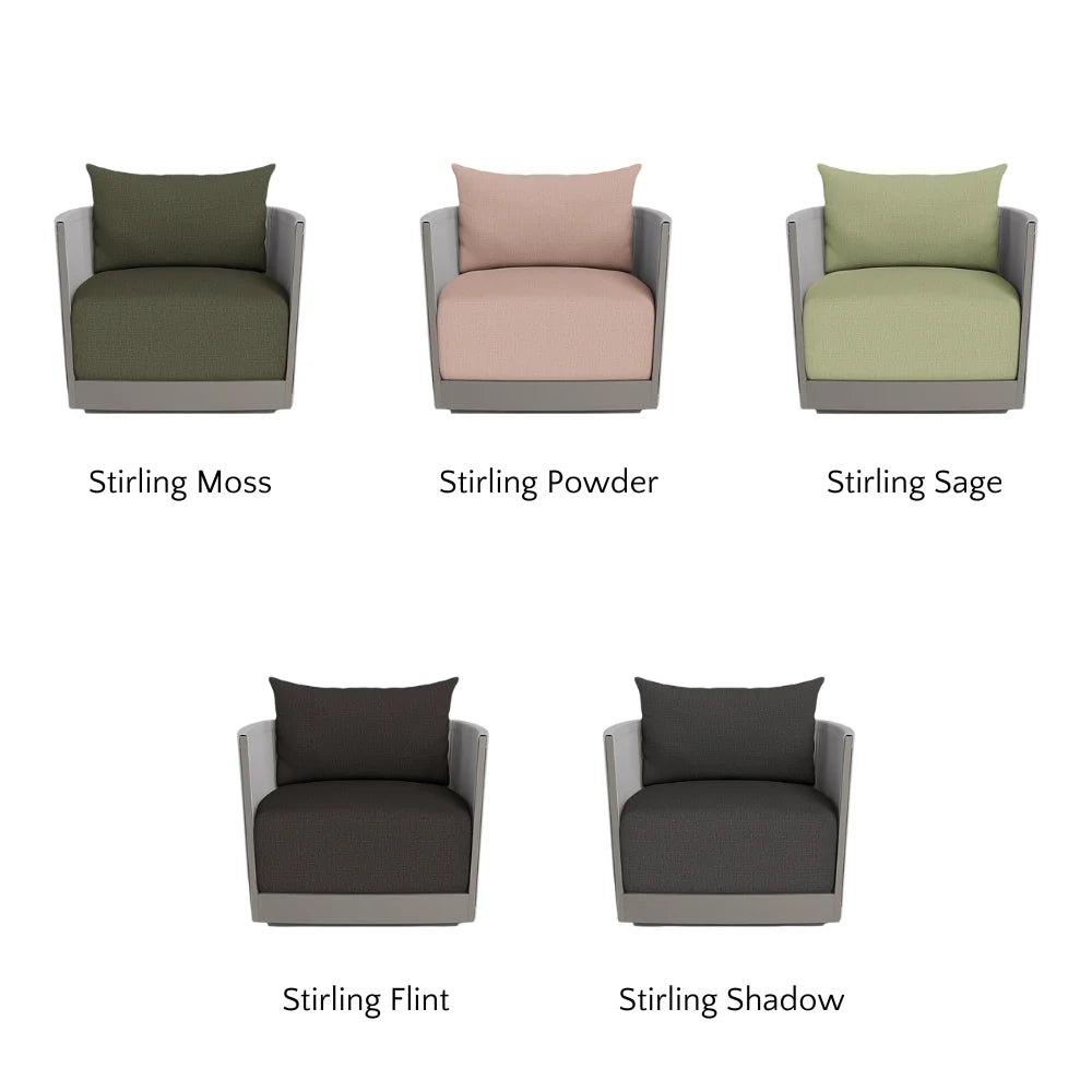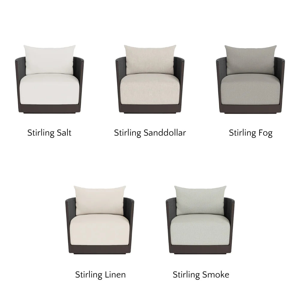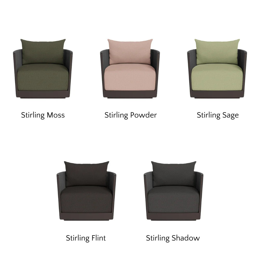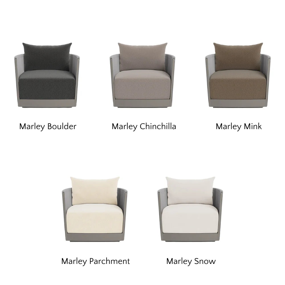 This outdoor swivel chair’s structure begins with a handcrafted extruded aluminum frame, engineered in our workshop for long-lasting stability and corrosion resistance. Each frame receives a premium AkzoNobel Interpon architectural-grade powder coat, giving it exceptional weather durability against UV exposure, humidity, and salt air—making it ideal for harsh climates and seaside installations.