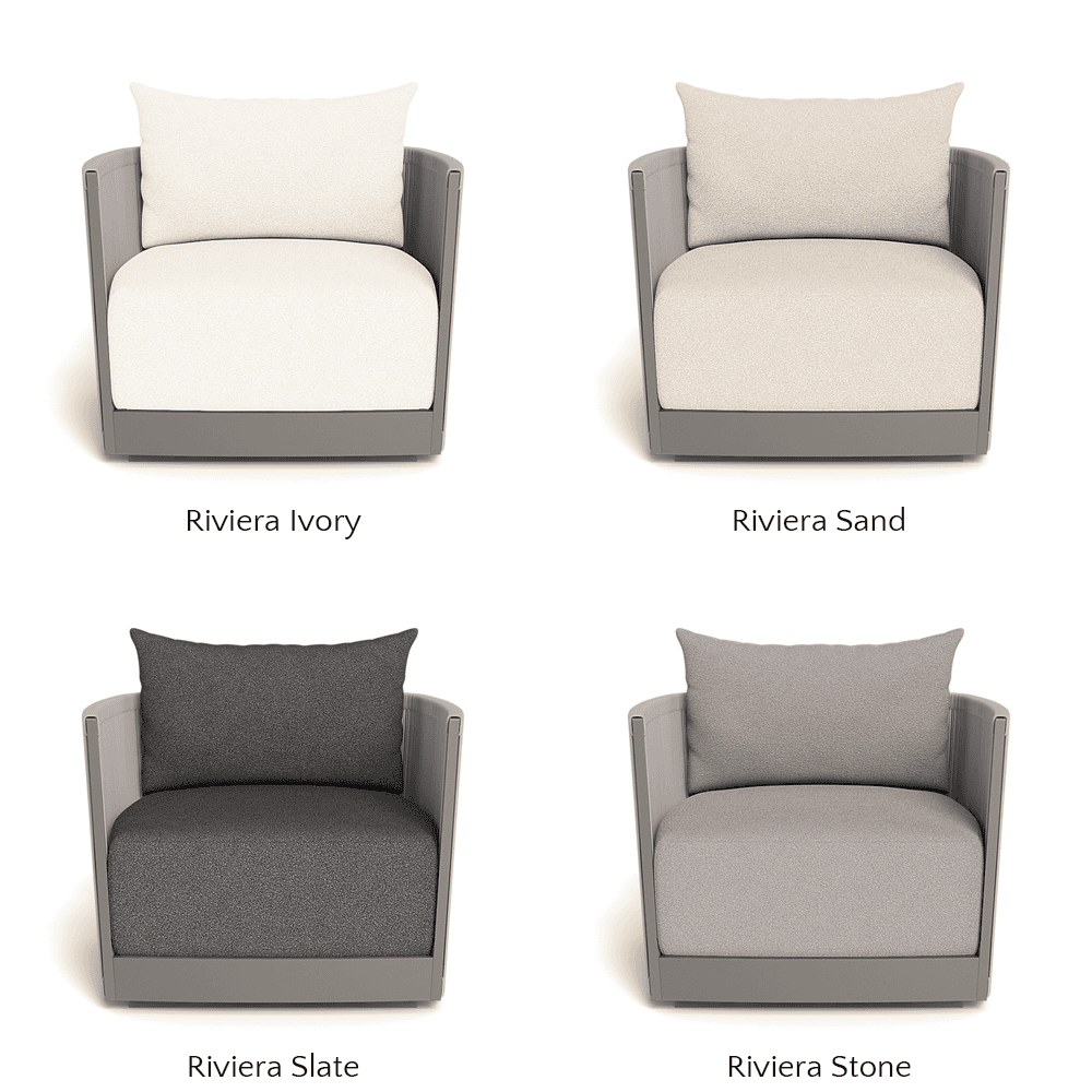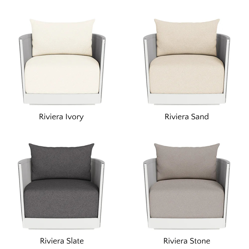 Sourced from Italy, Riviera is a fully outdoor performance fabric with a knubby texture similar to luxe boucle or terry cloth. Despite its soft, indoor-like feel, it’s made from 100% polypropylene, making it resistant to sun, moisture, sweat, mildew, and stains. Available in a range of neutral tones, Riviera adds refined, textured elegance to cushions and sofas. It comes from the Mario Sirtori line, an Italian company known for luxury, contract-quality fabrics since 1955.
