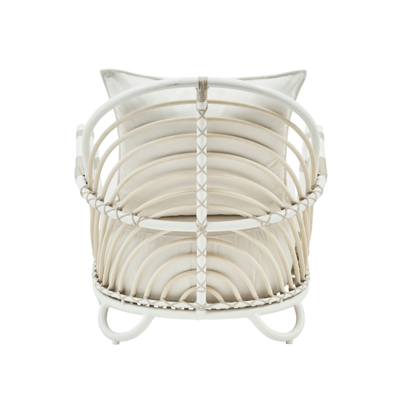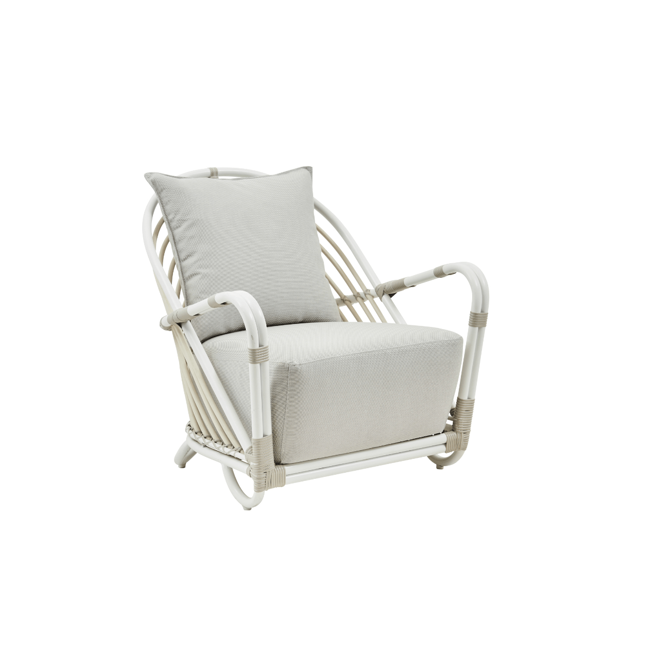 The Charlottenborg Lounge Chair by BOXHILL is an iconic chair from the original 1936 Arne Jacobsen design. Pleasant views of parallel curves flow seamlessly with double cane rounded arms. Supported by distinctive looped front and back legs, the elegant chair has a plush wedge seat cushion and loose pillow back for comfortable lounging. The design uses AluRattan, a strong powder-coated aluminum frame with binding made of ArtFibre, a maintenance-free polyethylene fiber able to withstand any weather conditions. Look to the charming Charlottenborg chair to become a noteworthy addition to garden, terrace, or patio seating.