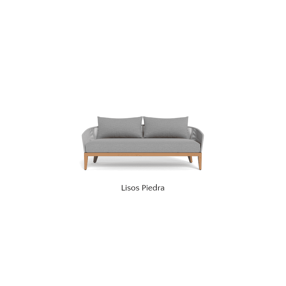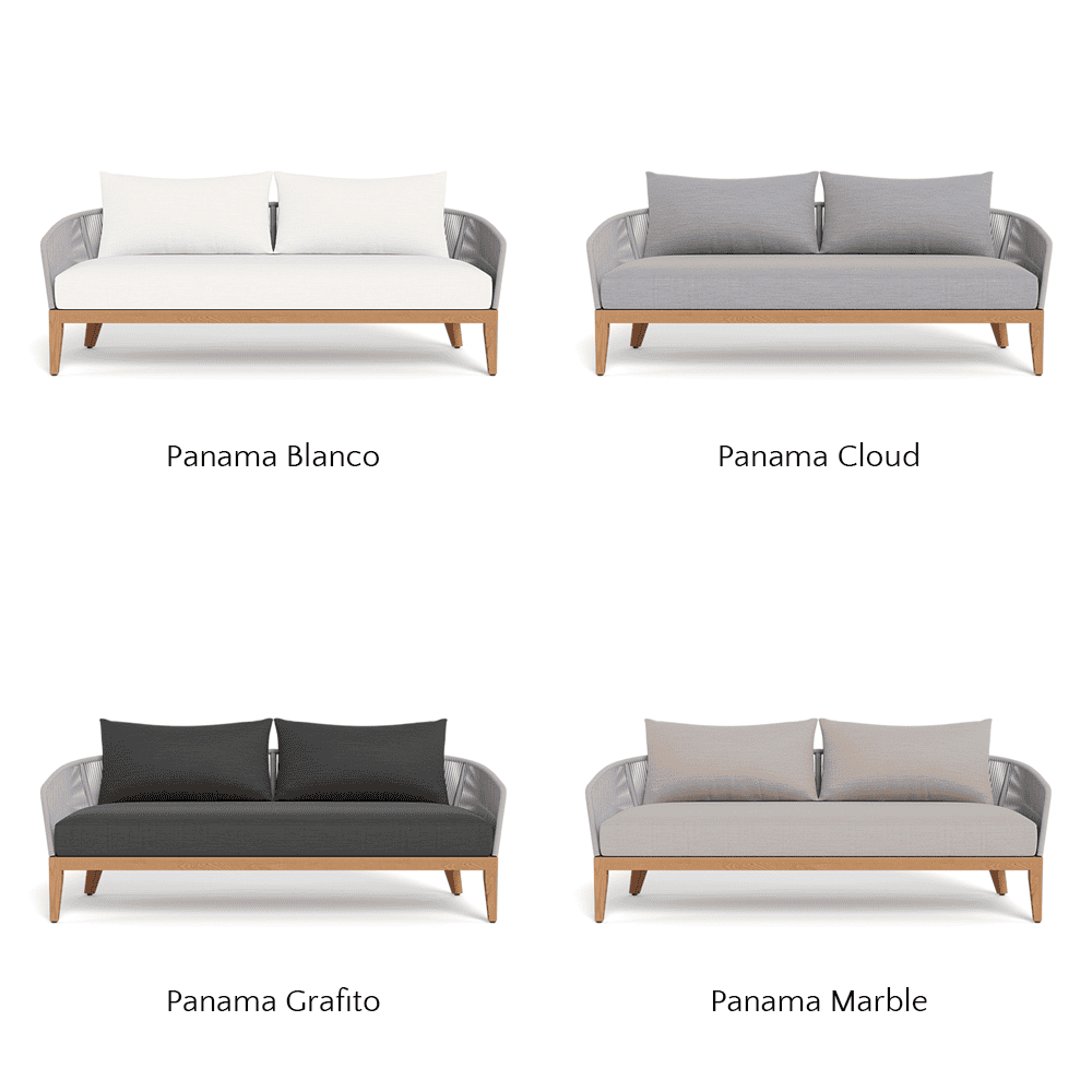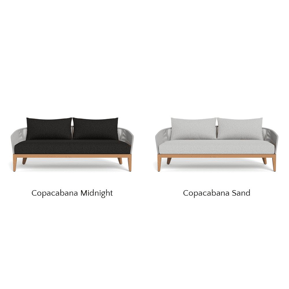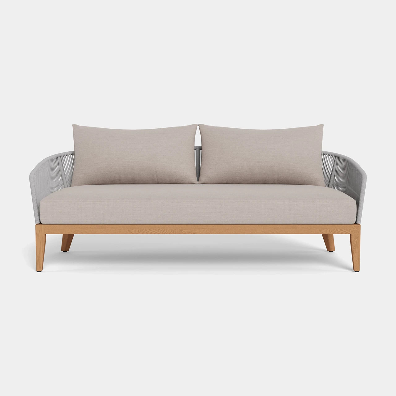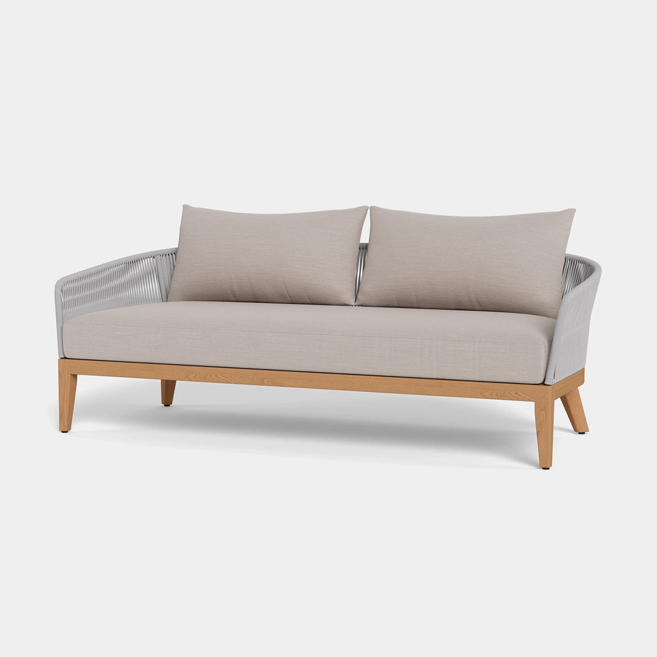 Embracing modern comfort, the Avalon Outdoor 2 Seat Sofa features a sleek teak frame with elegantly tapered legs, embodying distinctive sculptural proportions. Its design is accentuated by double-layered woven Olefin rope details, adding both style and durability.