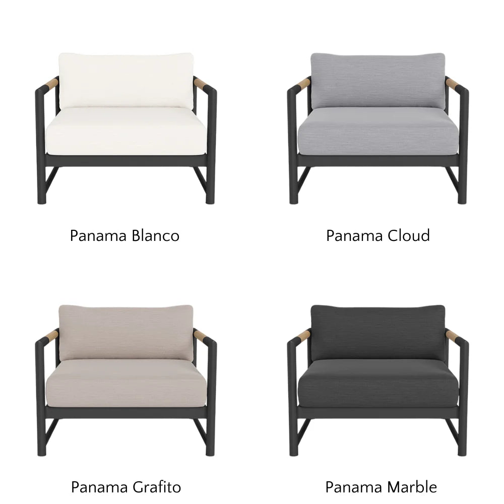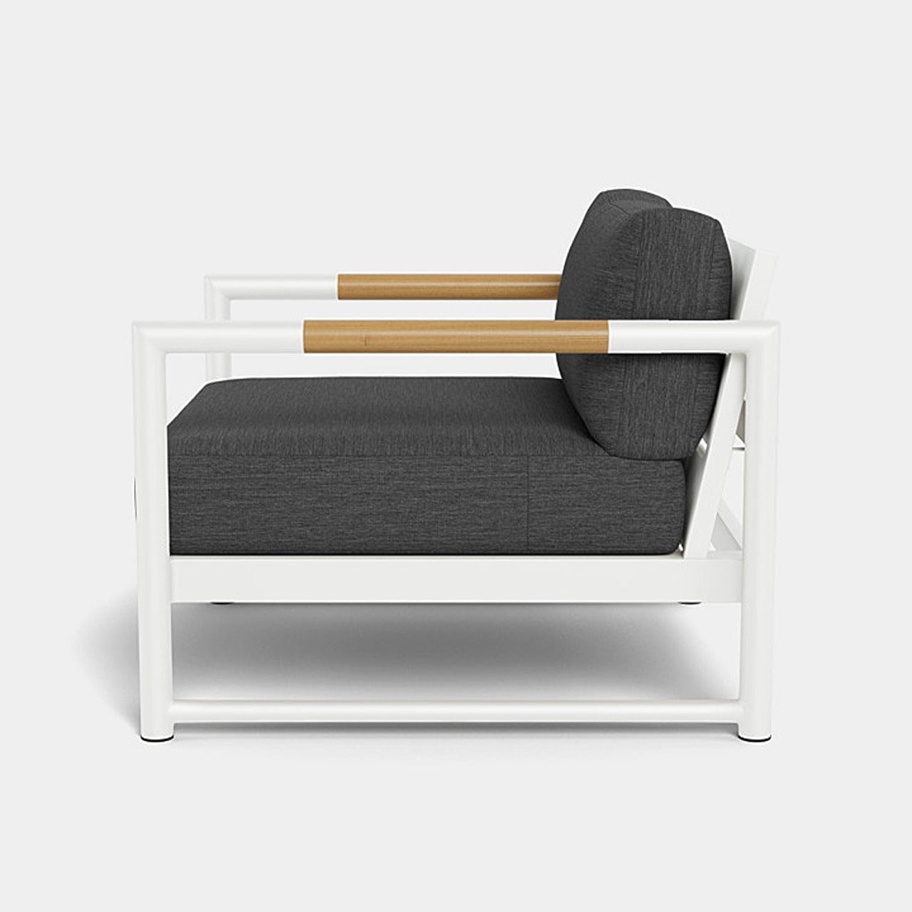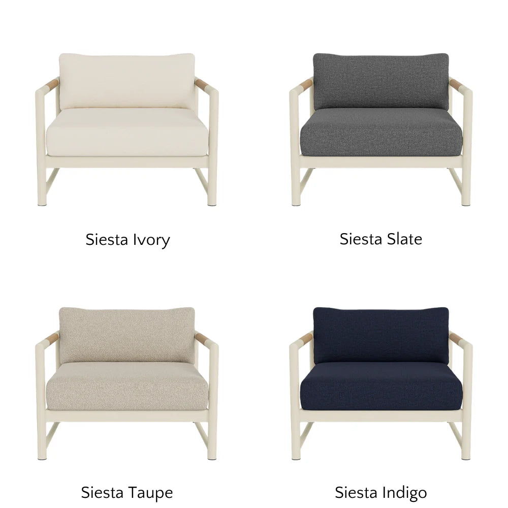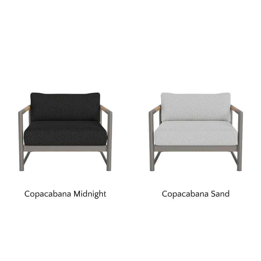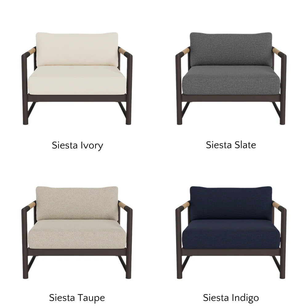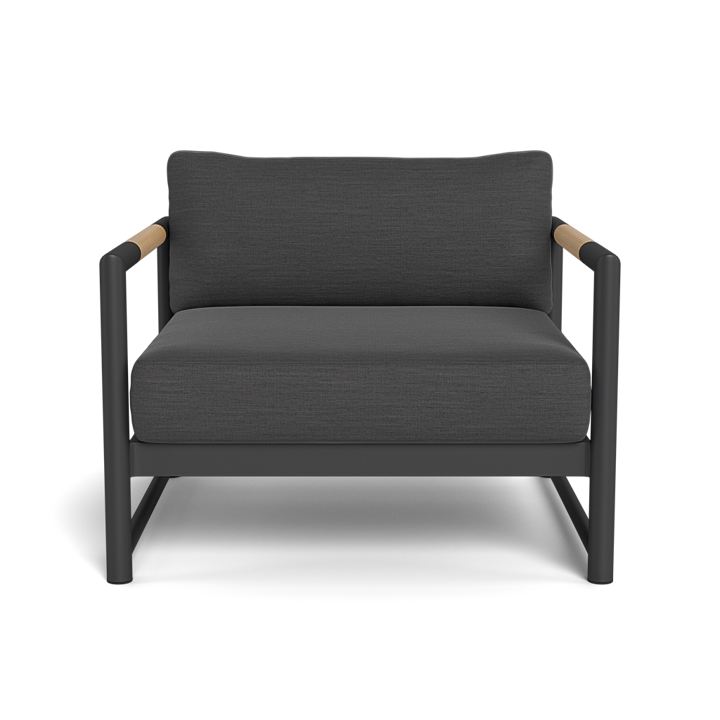 The frame is handcrafted from extruded aluminum and includes solid Indonesian teak inlays in the arms for added strength and aesthetic appeal. A superior quality powder coating is applied to the aluminum to resist corrosion, rust, and fading, ensuring long-term durability. The aluminum slatted suspension allows proper airflow and drainage while supporting the seat. The chair includes one seat cushion and one box back cushion, both filled with quick-dry flow-through foam and wrapped in Dacron for comfort. Cushions are weather-resistant and built to withstand mildew, fading, and stains.