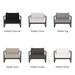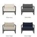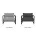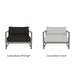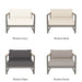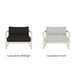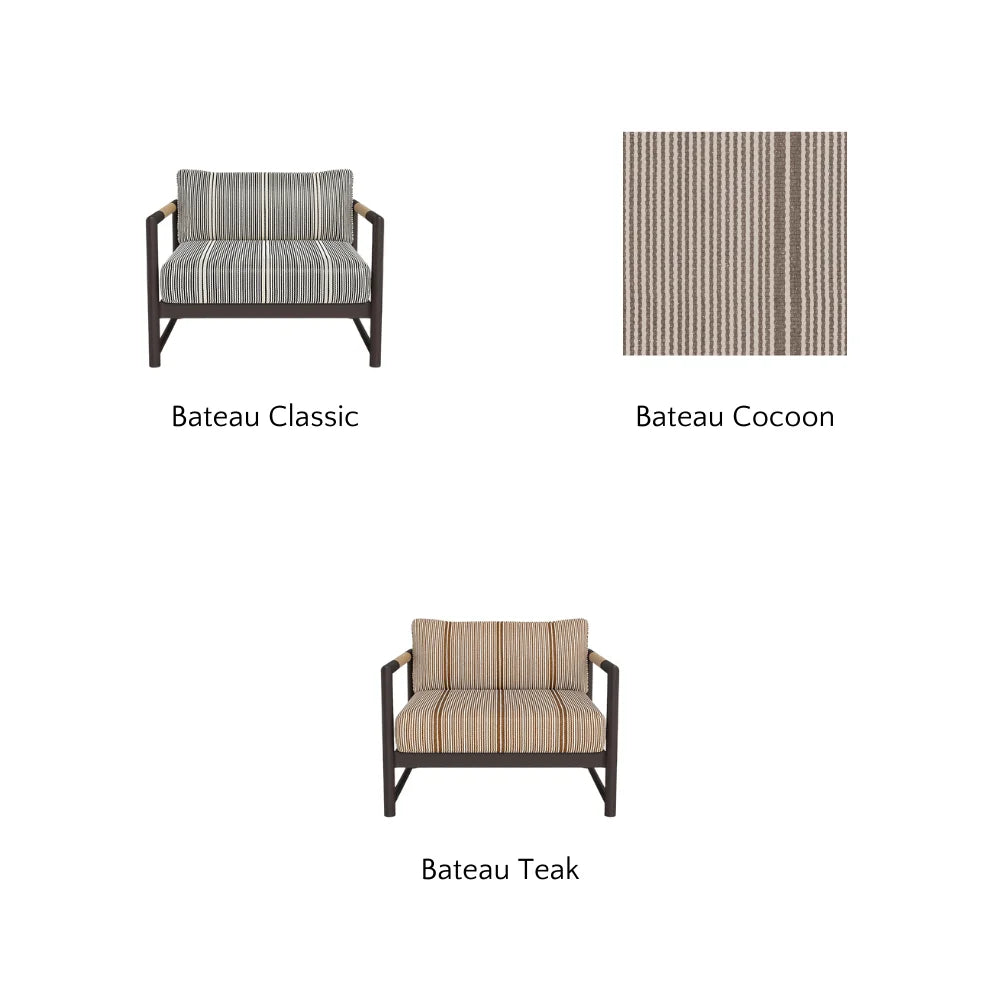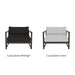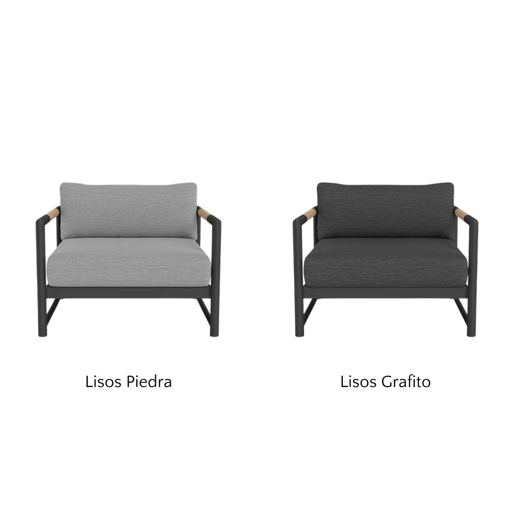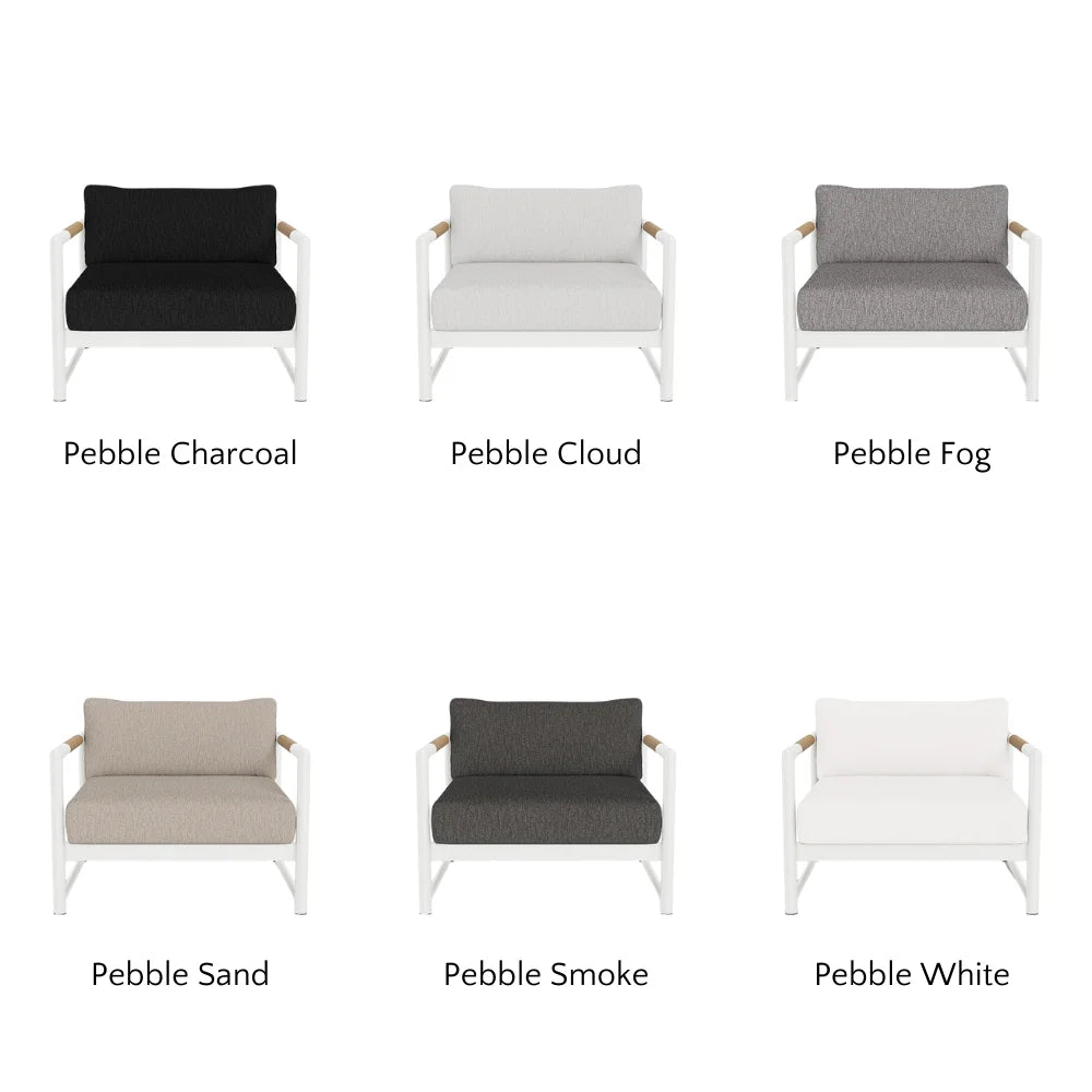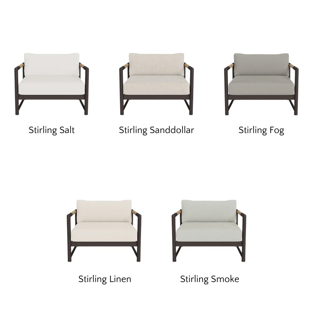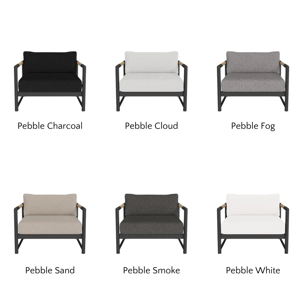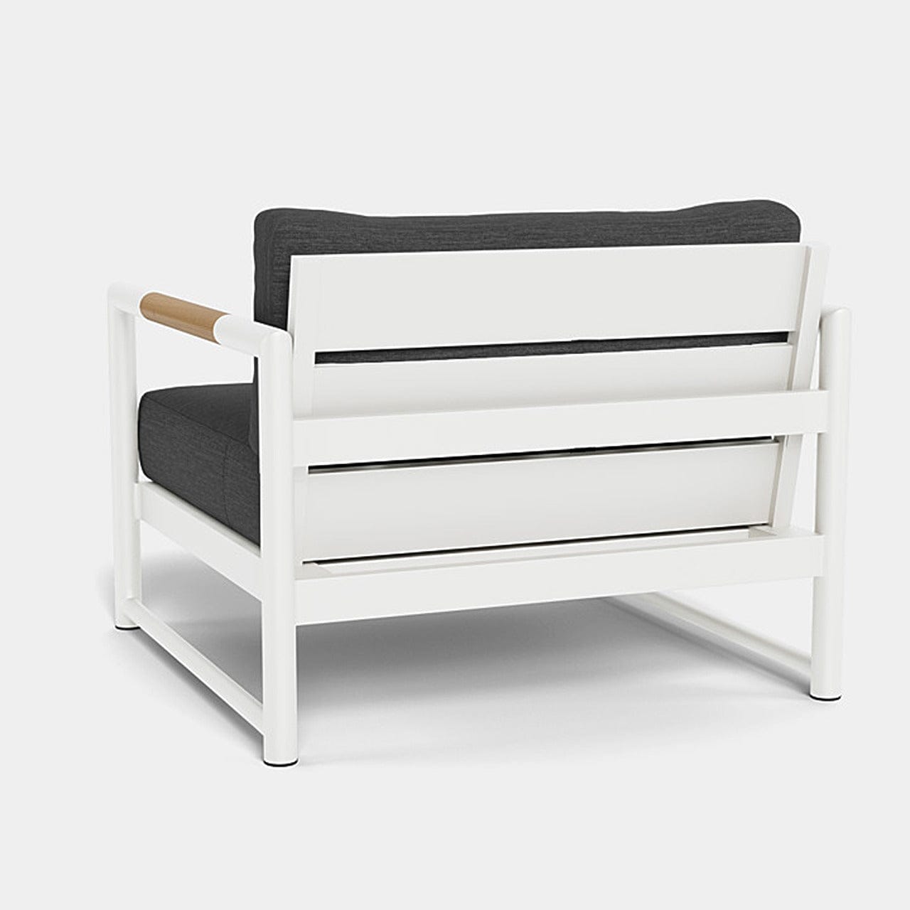 The frame is handcrafted from extruded aluminum and includes solid Indonesian teak inlays in the arms for added strength and aesthetic appeal. A superior quality powder coating is applied to the aluminum to resist corrosion, rust, and fading, ensuring long-term durability. The aluminum slatted suspension allows proper airflow and drainage while supporting the seat. The chair includes one seat cushion and one box back cushion, both filled with quick-dry flow-through foam and wrapped in Dacron for comfort. Cushions are weather-resistant and built to withstand mildew, fading, and stains.