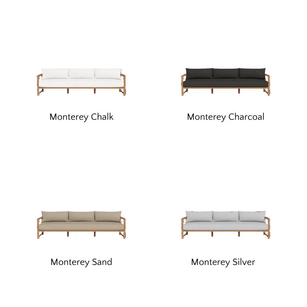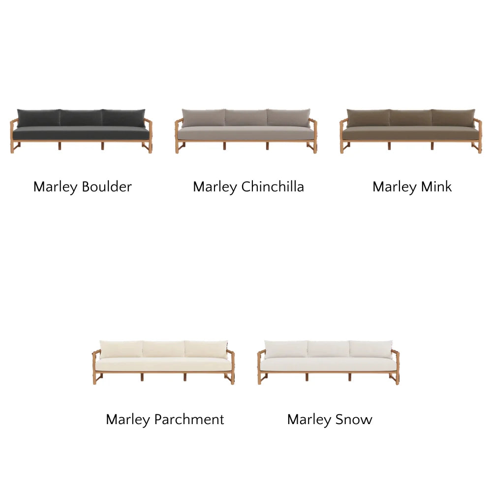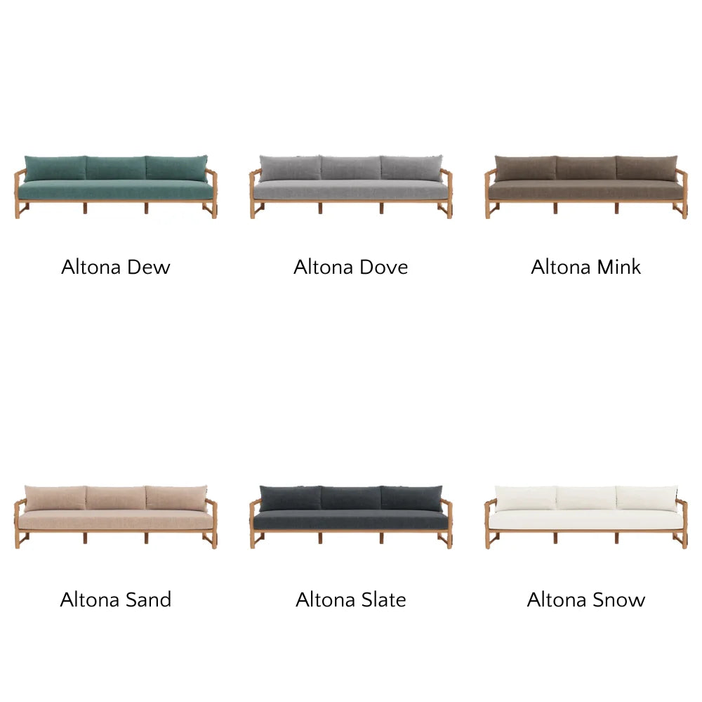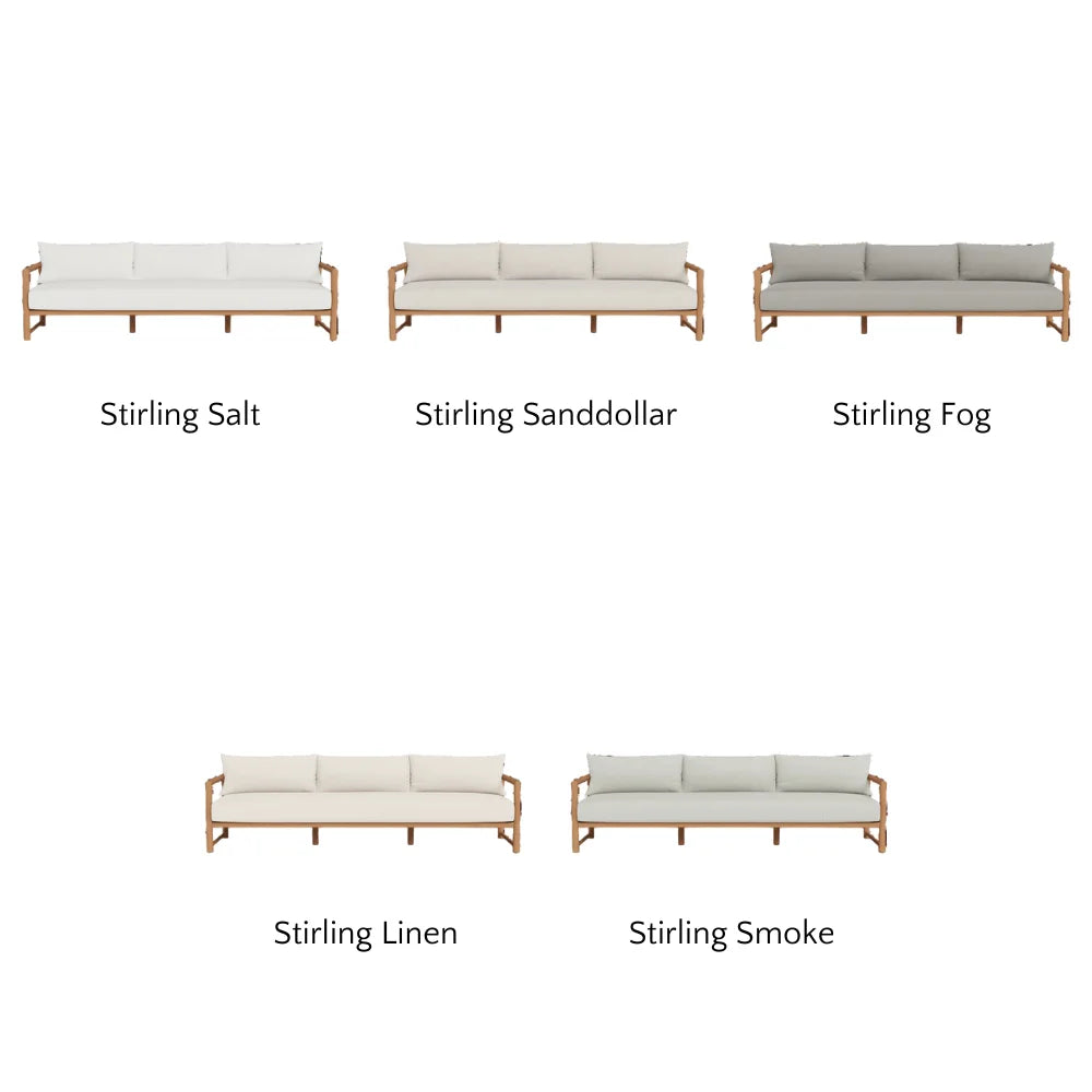 The sofa includes one bench seat cushion and three knife-edge back cushions. The seat cushion uses quick-dry flow-through foam that enables rapid drainage after exposure to moisture. A Dacron wrap provides additional comfort. The back cushions are filled with Dacron to maintain structure and support. All cushion fabrics are designed for outdoor performance and are resistant to fading, mildew, and stains.