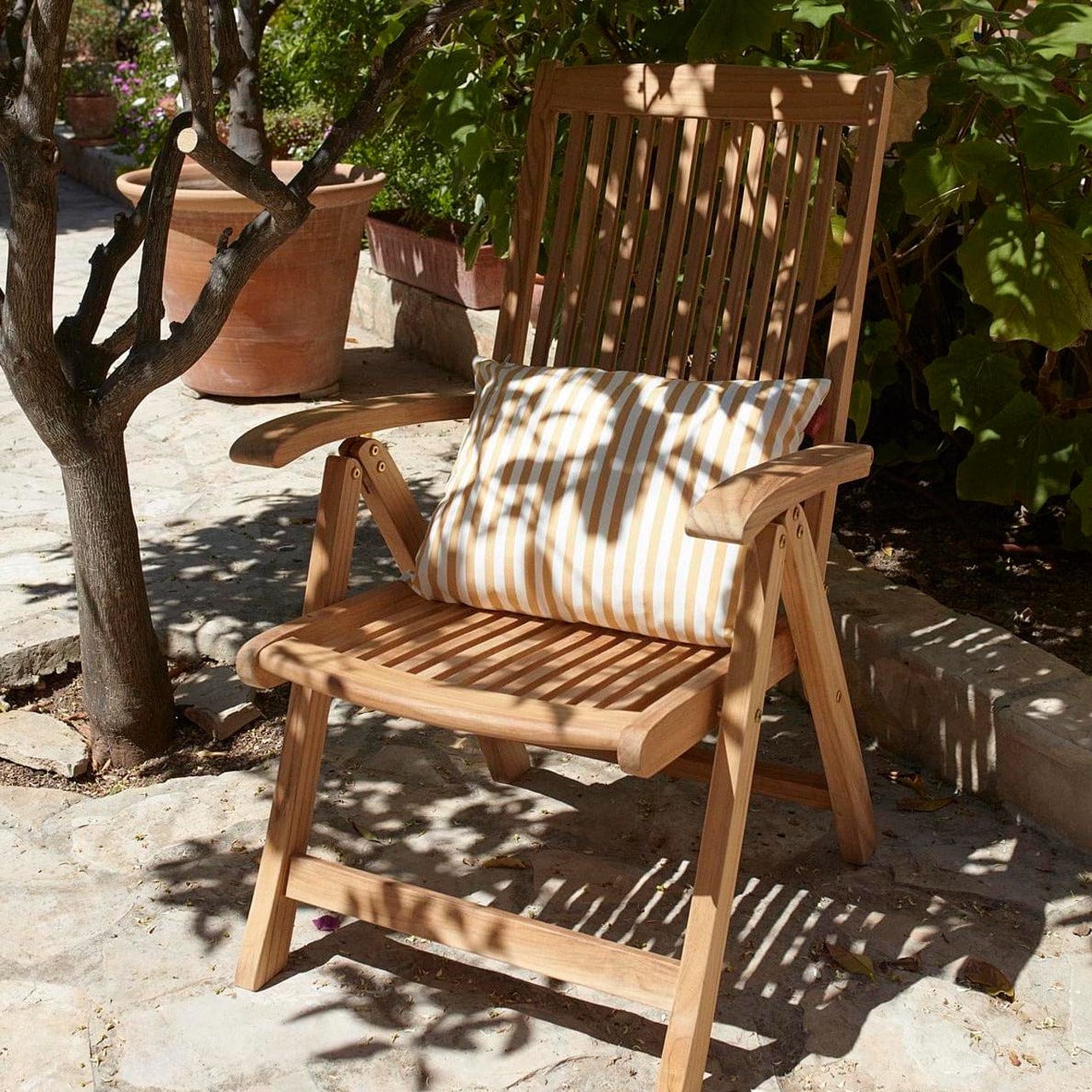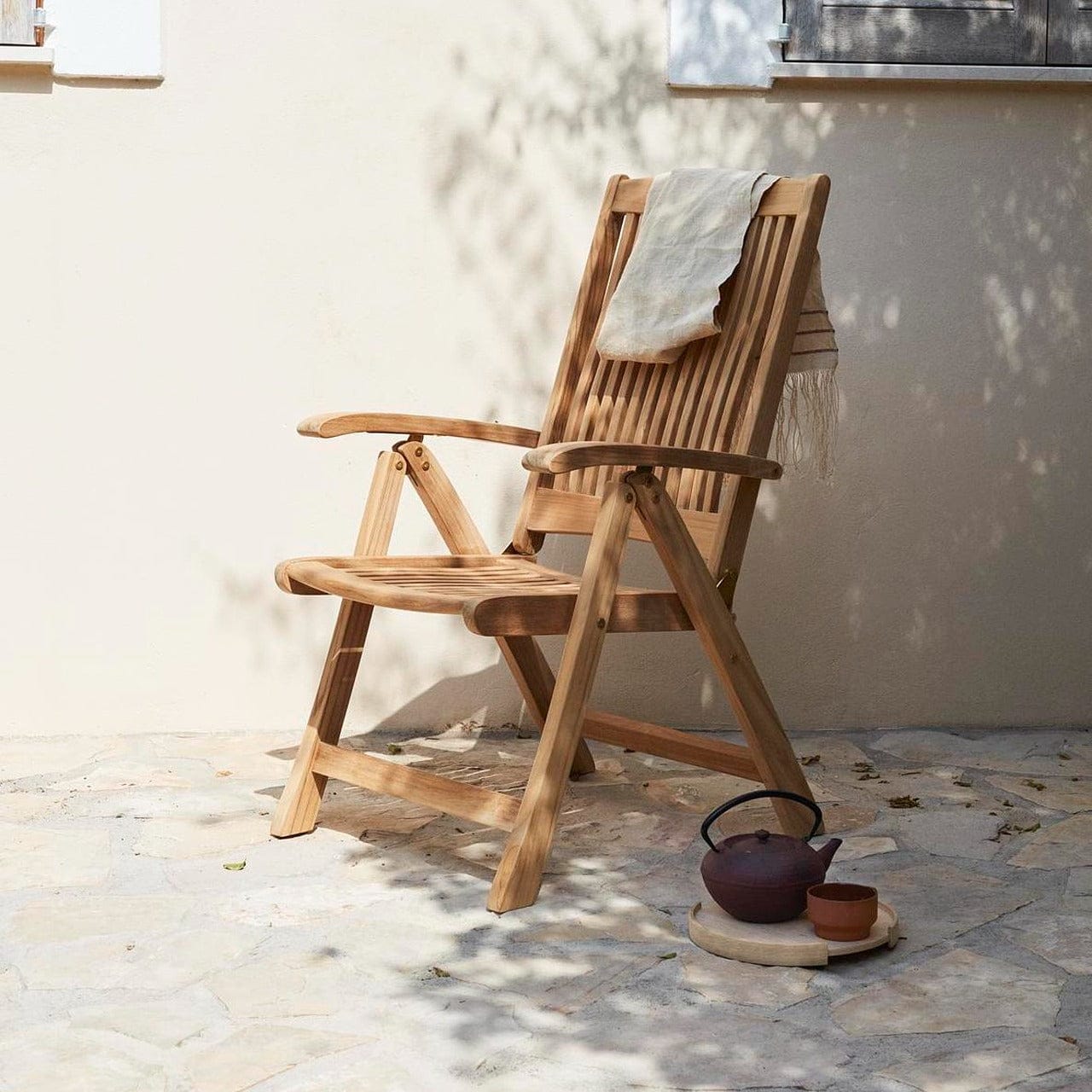 Columbus chair is crafted from high-quality teak. The design is inspired by the classical garden chairs from the US but done in a simplistic, Nordic style where the steel fittings are kept visible to create a subtle contrast. The chair is adjustable, making it useful around the dining table as well as a sun chair.
