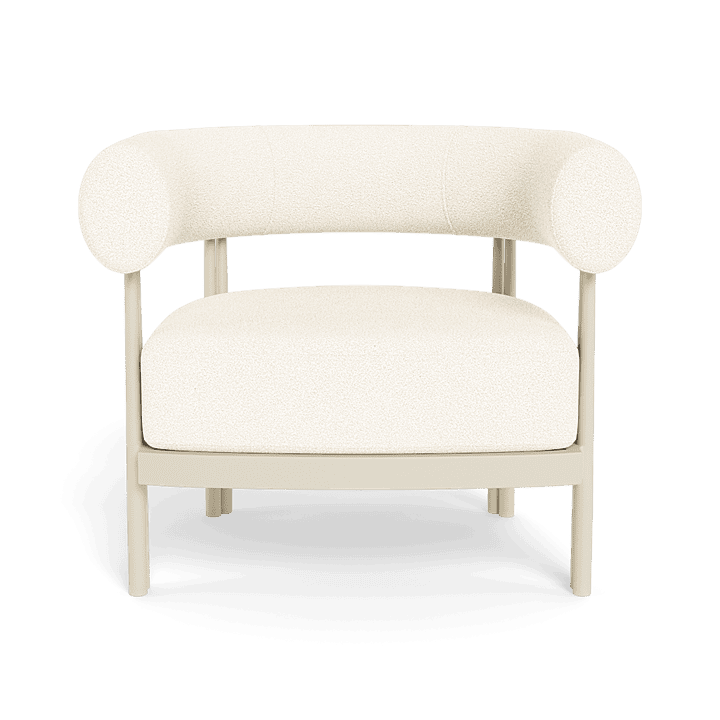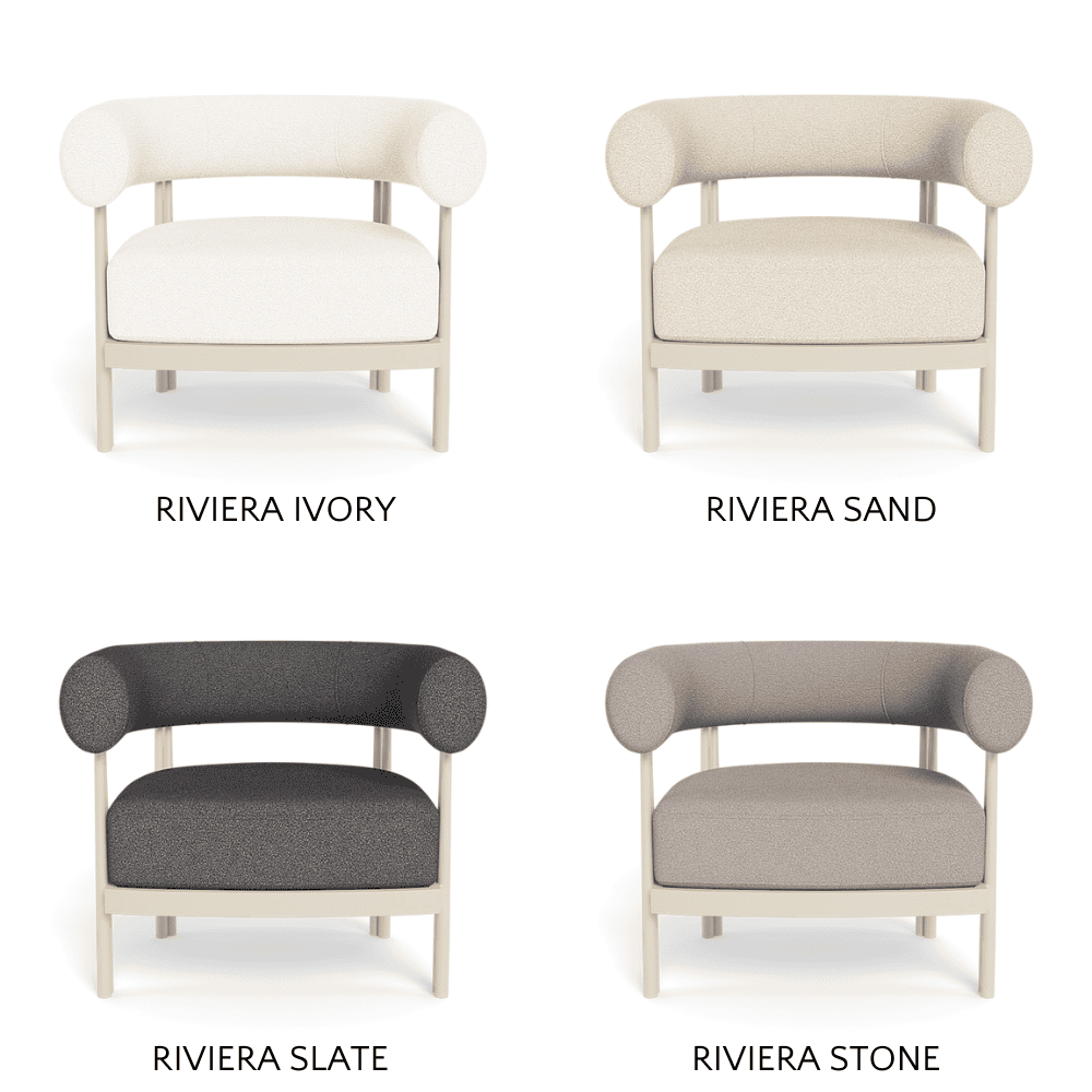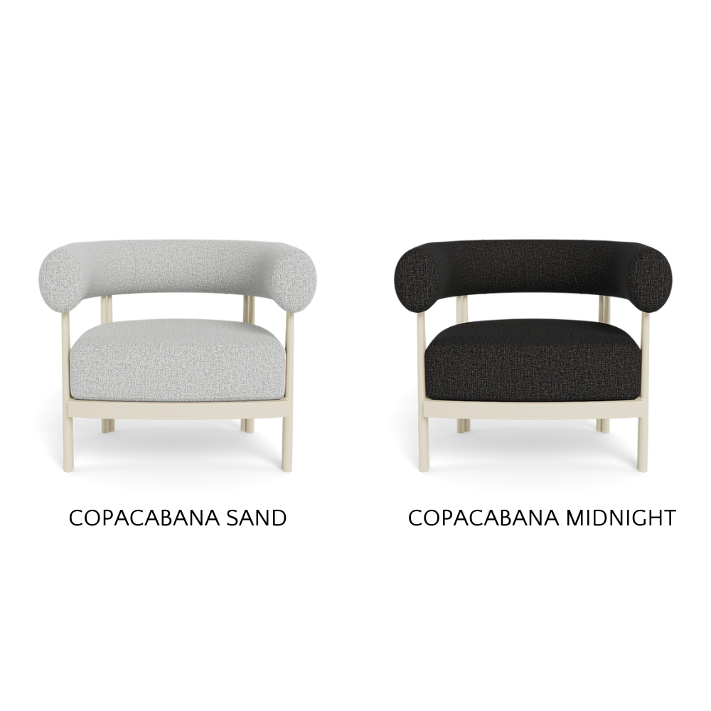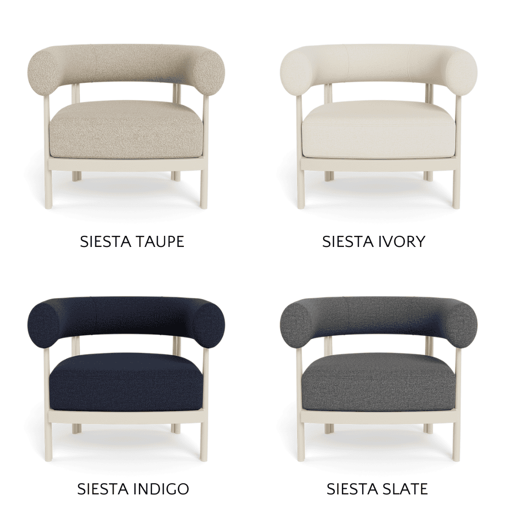 Cove Luxe outdoor collection features special details like double cylindrical legs and curved edges – refined with luxurious upholstered bolster backs – that create soft sculptural silhouettes with understated elegance.