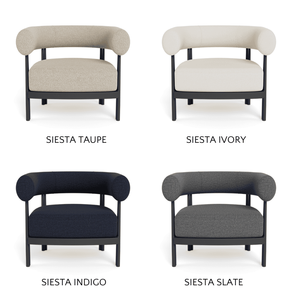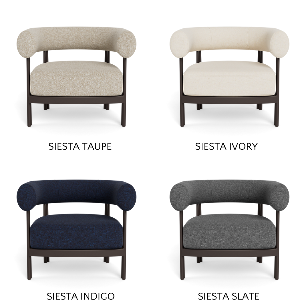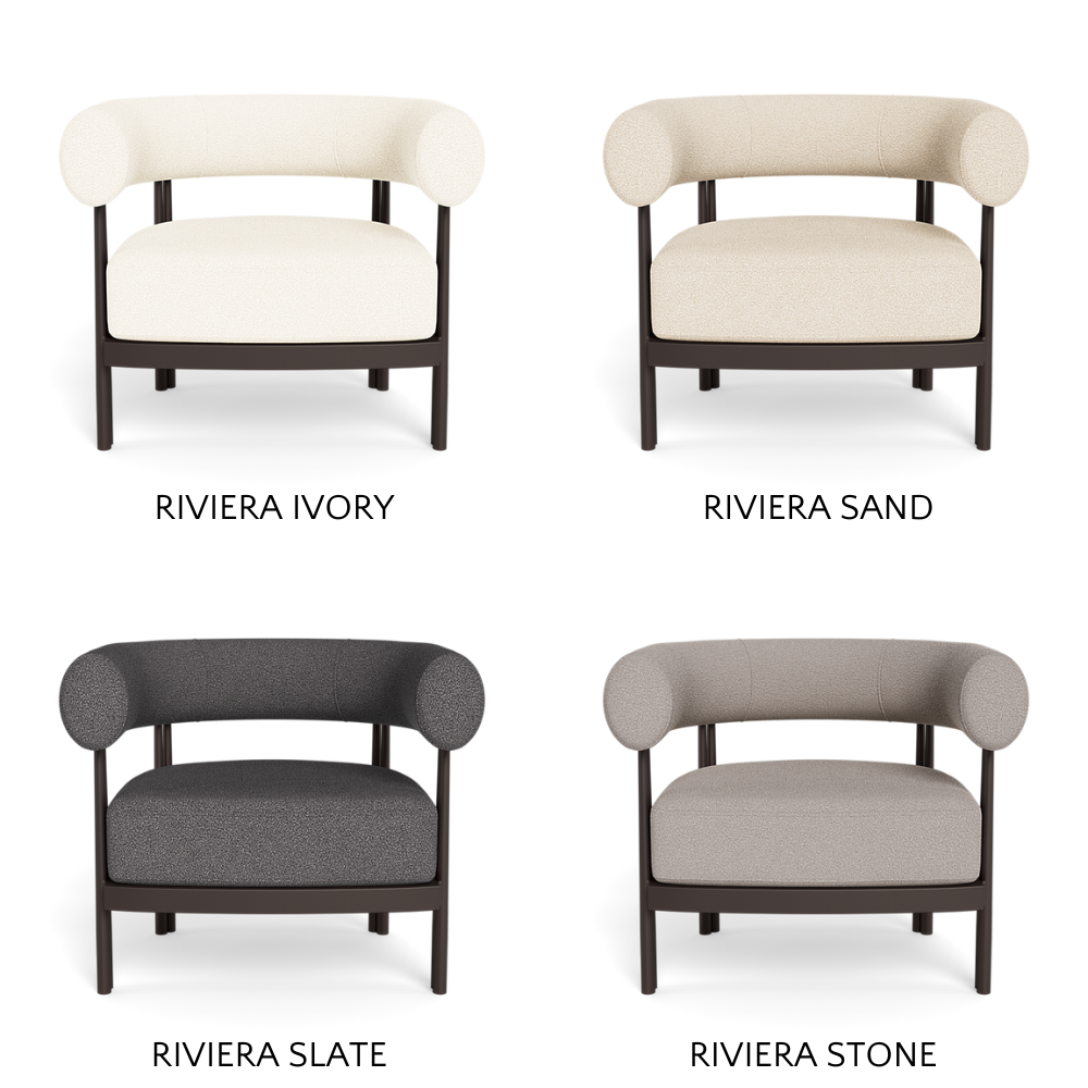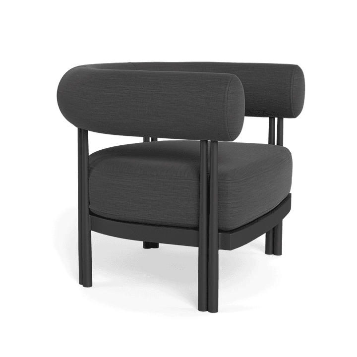 Cove Luxe outdoor collection features special details like double cylindrical legs and curved edges – refined with luxurious upholstered bolster backs – that create soft sculptural silhouettes with understated elegance.