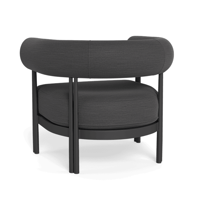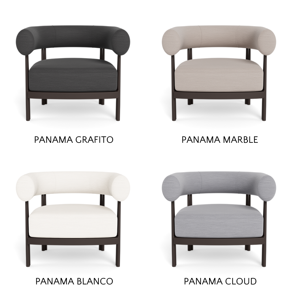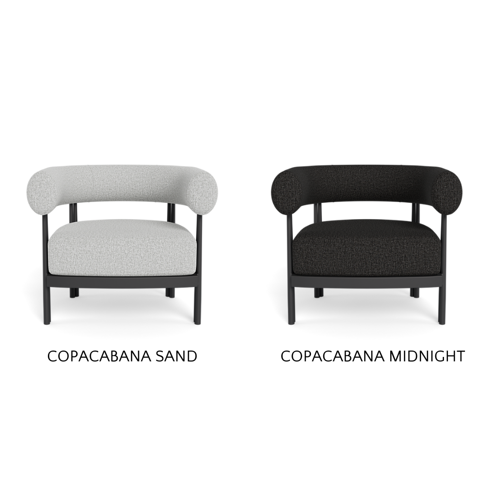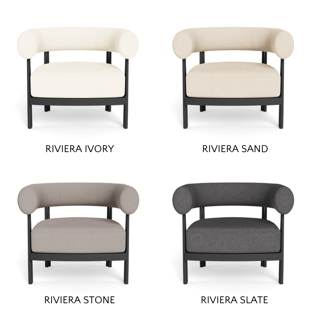 Cove Luxe outdoor collection features special details like double cylindrical legs and curved edges – refined with luxurious upholstered bolster backs – that create soft sculptural silhouettes with understated elegance.