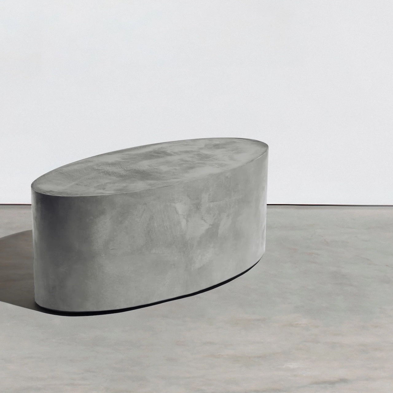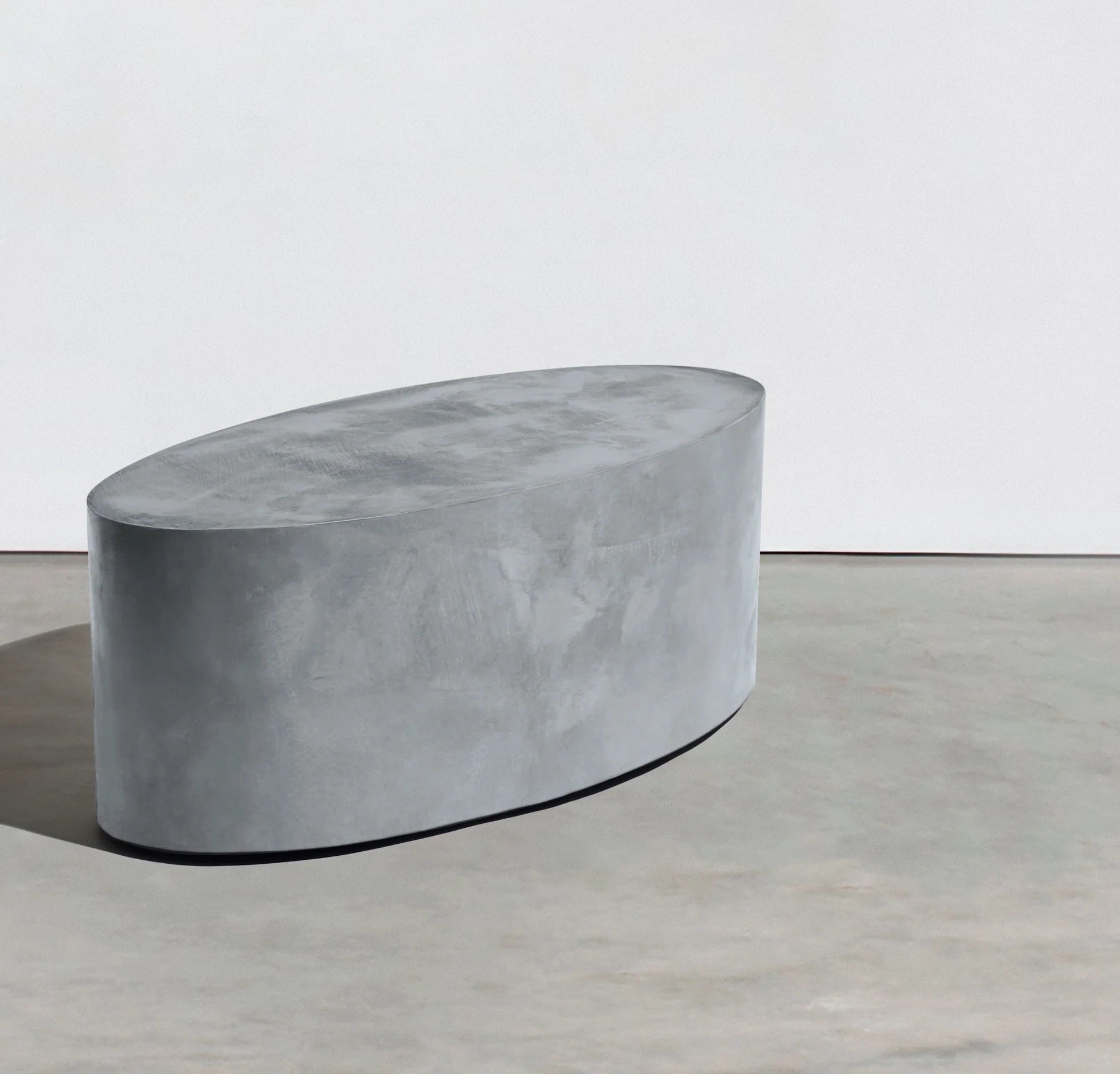 An ellipse-shaped oval concrete outdoor coffee table . A visually structural outdoor concrete table piece that can be used indoors or outdoors as a concrete coffee table or concrete bench. Similar to our concrete "Rollerboy" , this piece gives off the appearance of solid stone, but is lightweight concrete table and sits on 4 German recessed locking wheels that make it easily mobile. The hidden wheels are the key and the hidden gem to this product, because if you ever tried to move a concrete table, you know this is a gift to this concrete piece.