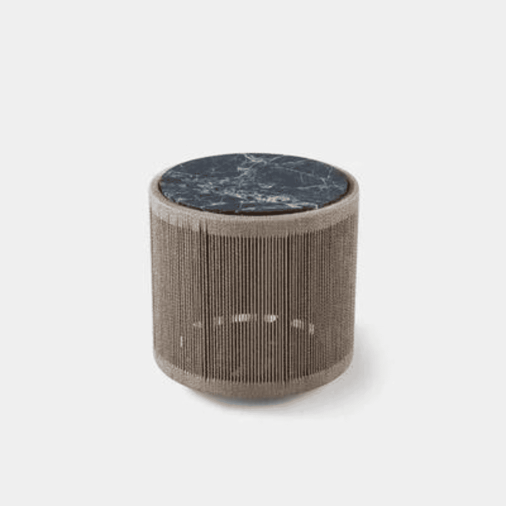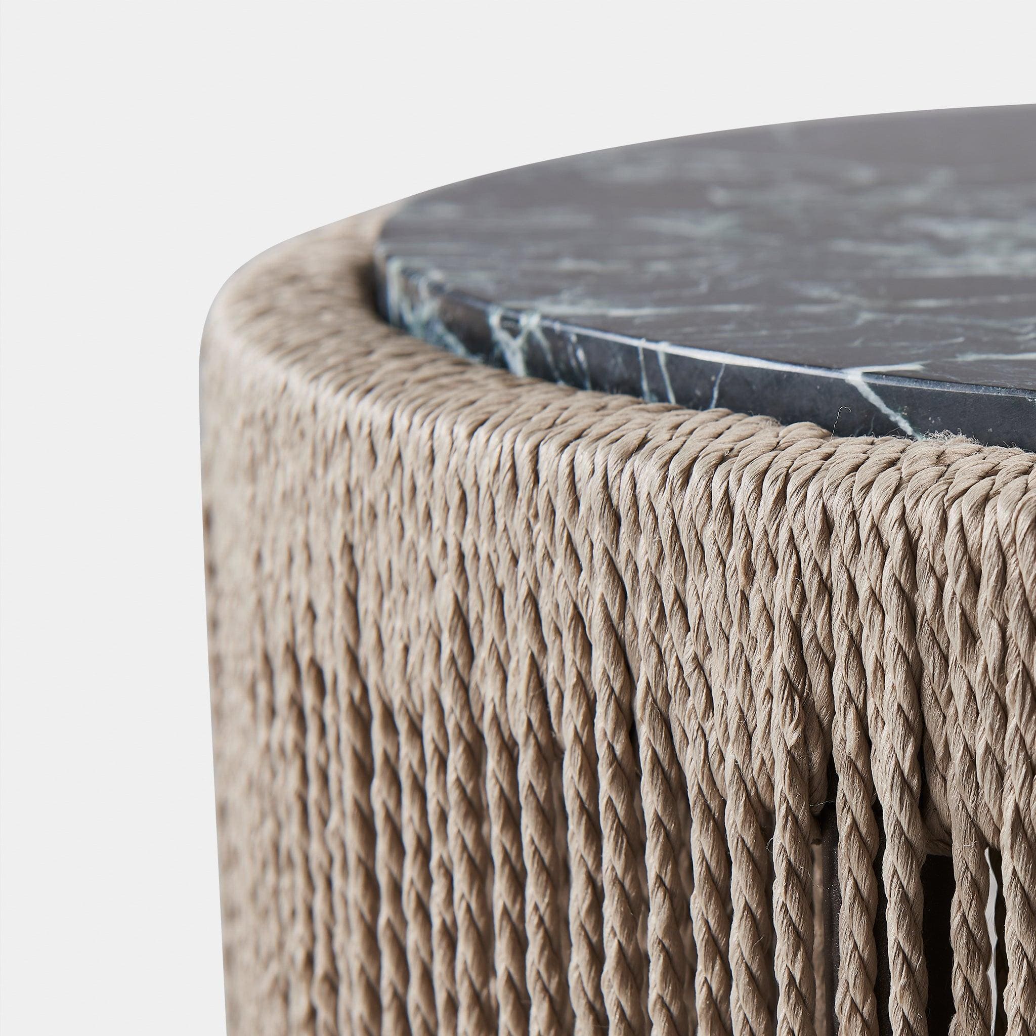 Enhance your outdoor setting with the Formentera Outdoor Round Side Table, a masterpiece by Kara Mann. This table showcases exposed aluminum, all-weather rope, and deep green marble, cultivating an organic and lavish ambiance. The intricate twisted rope detail evokes a nautical charm, while the stone surface adds a natural touch. Designed to complement a coastal lifestyle, this side table embodies elegance and functionality.