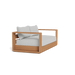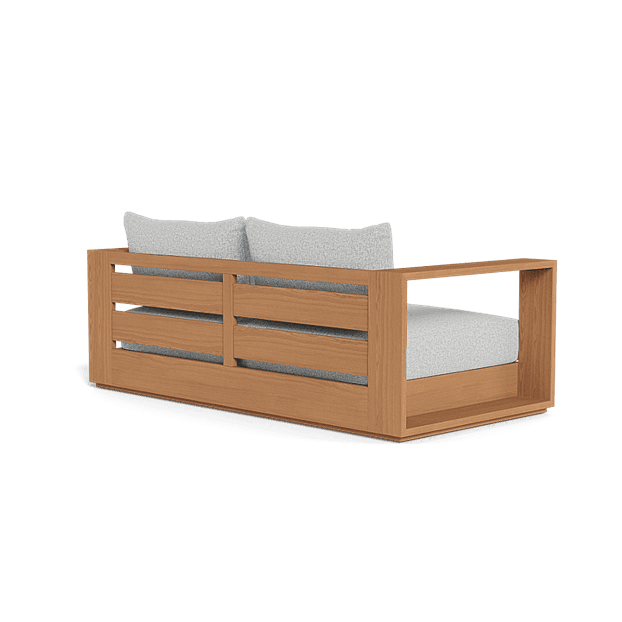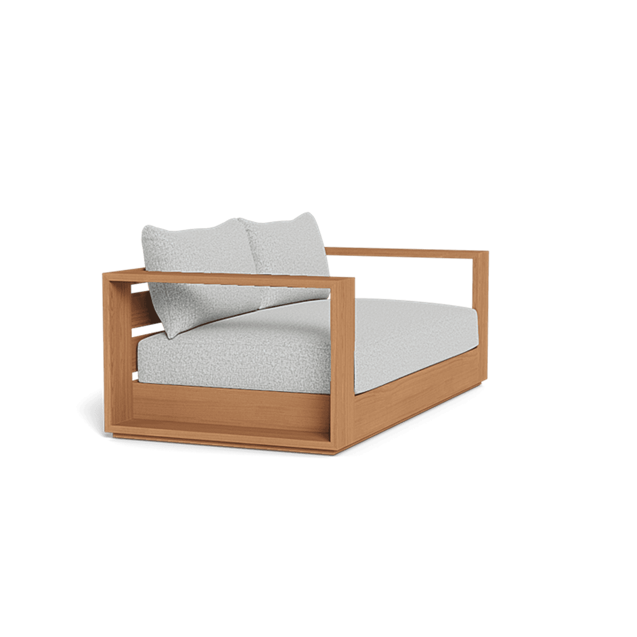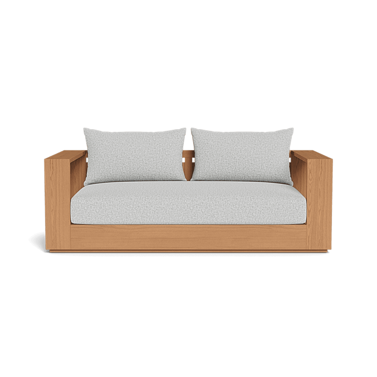 Characterized by its generous arms and sleek, understated profile, our sofa invites you to revel in unparalleled comfort. Immerse yourself in deep relaxation with a lavish bench cushion, available in an array of neutral hues, supported by a White Batyline sling suspension encased within a sturdy natural teak frame. Seamlessly bridging indoor coziness with outdoor durability, this geometric masterpiece is meticulously designed to seamlessly adapt to a variety of spaces and arrangements.