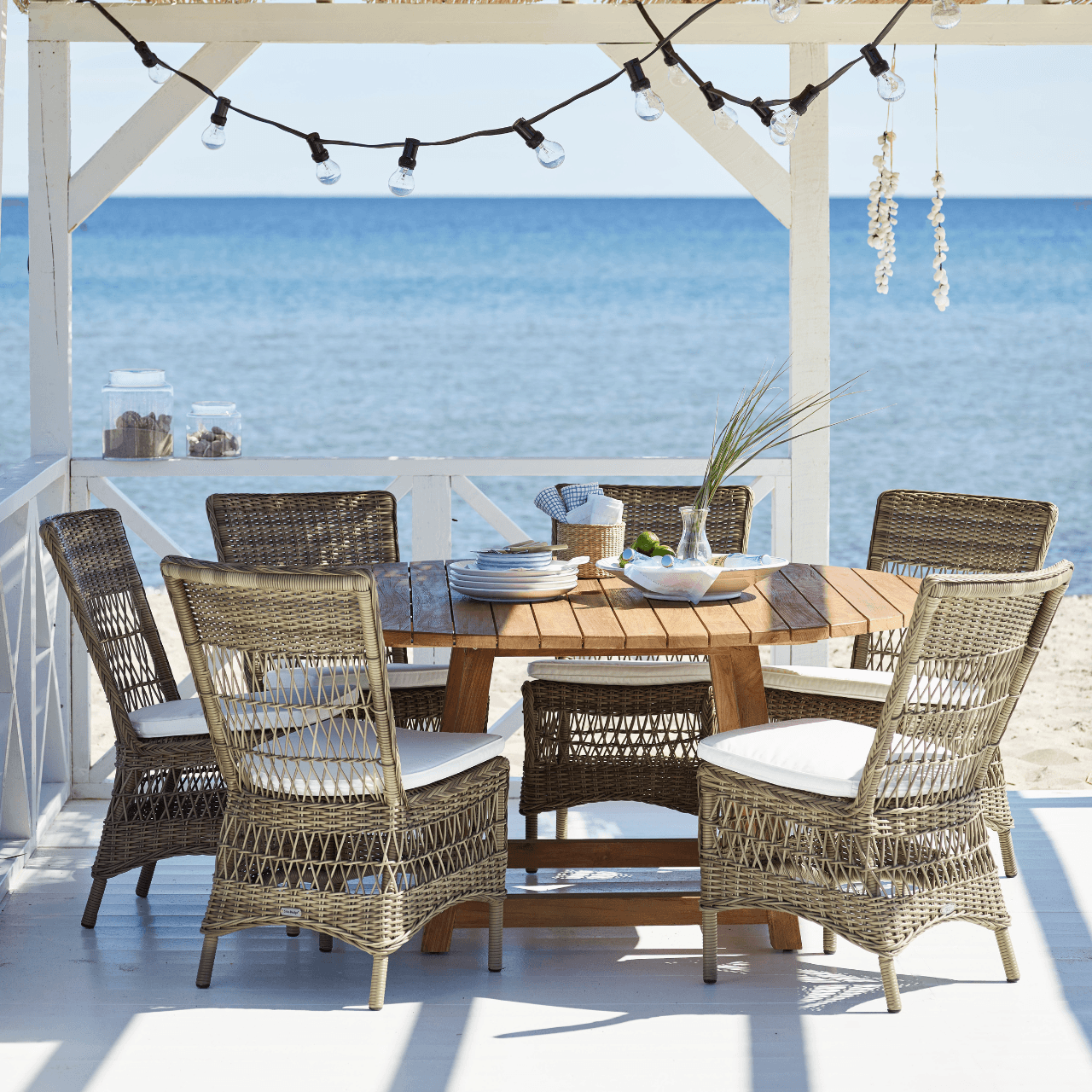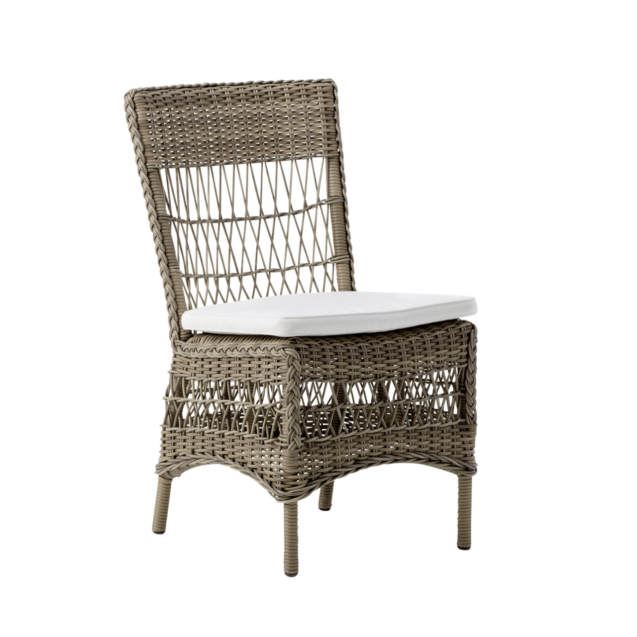 The Marie Outdoor Side Chair brings laidback elegance and comfort to outdoor dining. From the romantic Georgia Garden collection, the chair features a slanted square back and wraparound apron. A breezy open weave and braided detailing along the back and seat add to the elegant. . . Show More