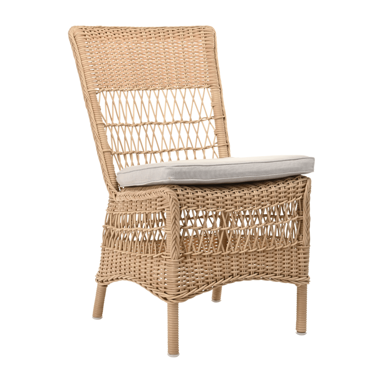 The Marie Outdoor Side Chair brings laidback elegance and comfort to outdoor dining. From the romantic Georgia Garden collection, the chair features a slanted square back and wraparound apron. A breezy open weave and braided detailing along the back and seat add to the elegant alfresco style of this side chair. Expertly crafted from a lightweight AluRattan aluminum frame woven and wrapped in polyethylene ArtFibre faux wicker fibers, this maintenance-free, stackable chair is a perennial favorite for dining on a patio, veranda, and garden in home and commercial settings.
