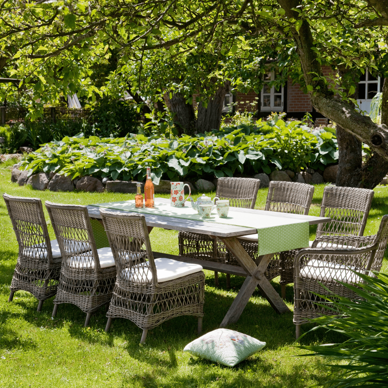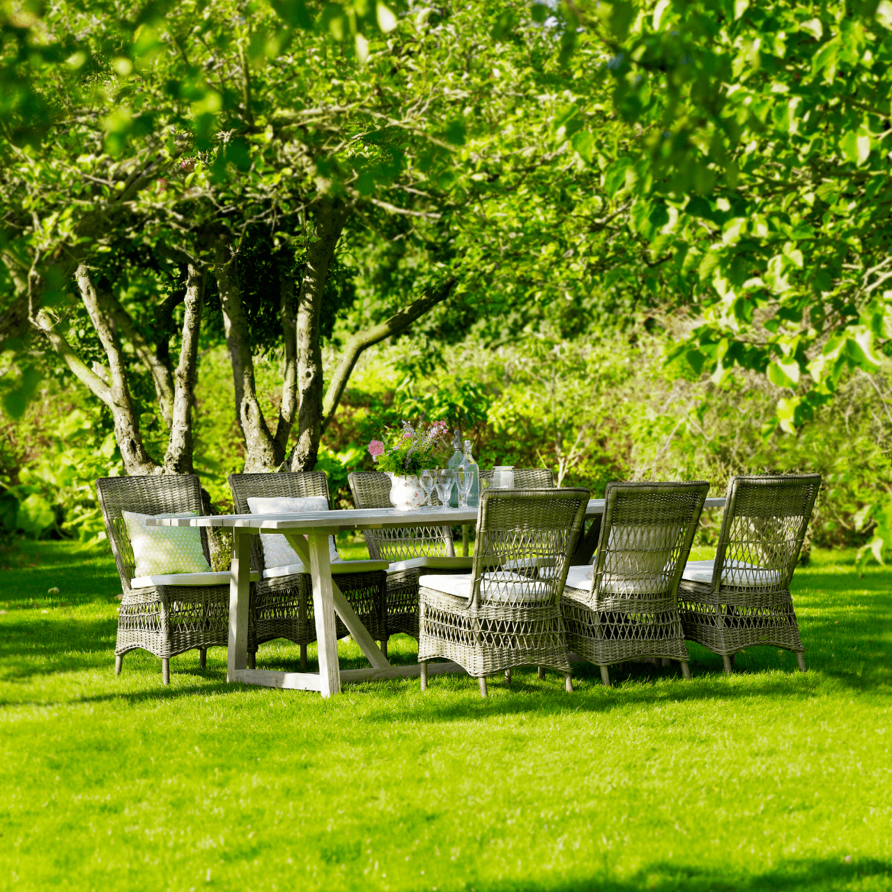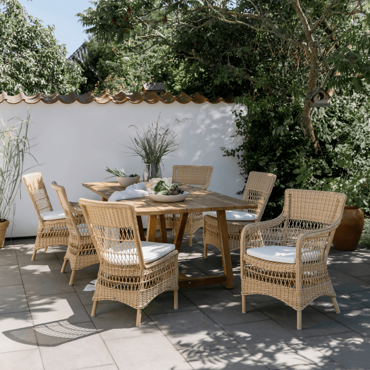 - AluRattan - a powder-coated aluminum bent to mimic the curves of natural rattan. The powder coating ensures a surface resistant to knocks and scratches. The material is well-suited to be left outside all year long and is easy to clean.